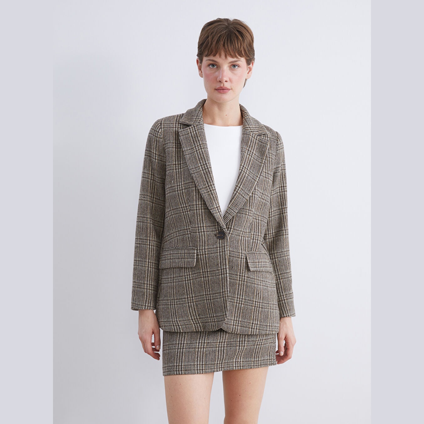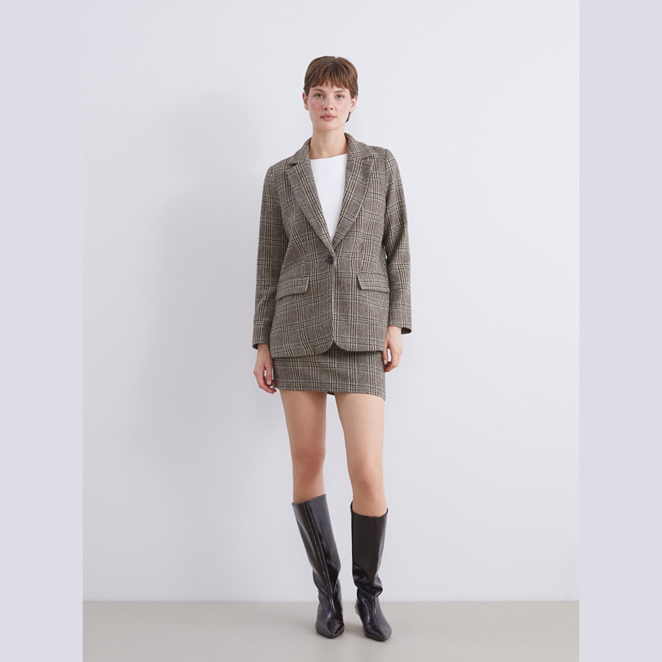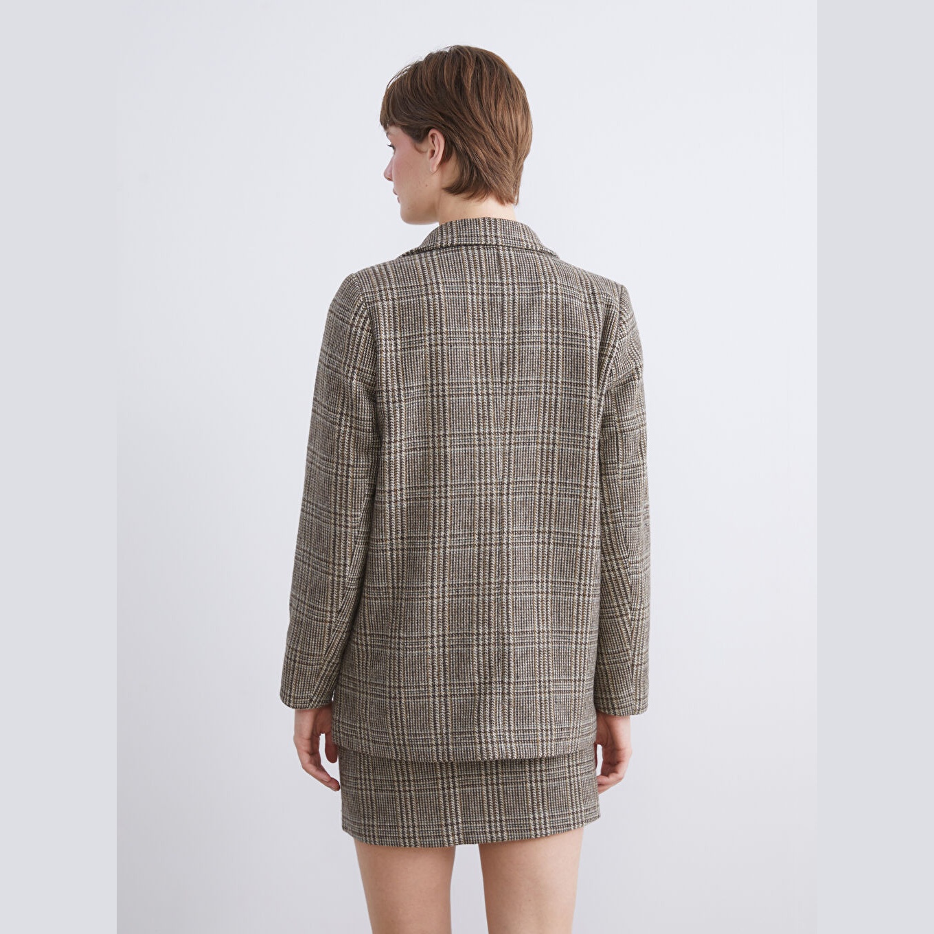 بليزر نسائي كاشيه بنقشة مربعات وياقة V من LCW Vision – بني (قصة واسعة، خامة شتوية سميكة، مبطّن بالكامل، تصميم رسمي وأنيق)