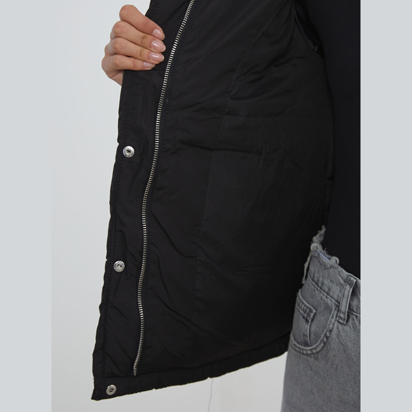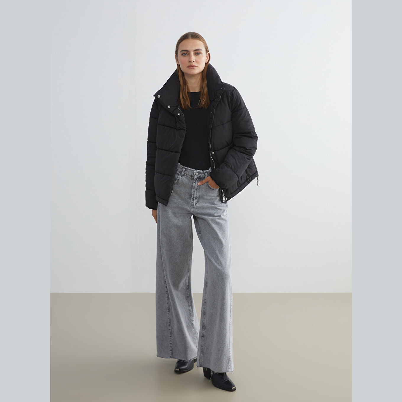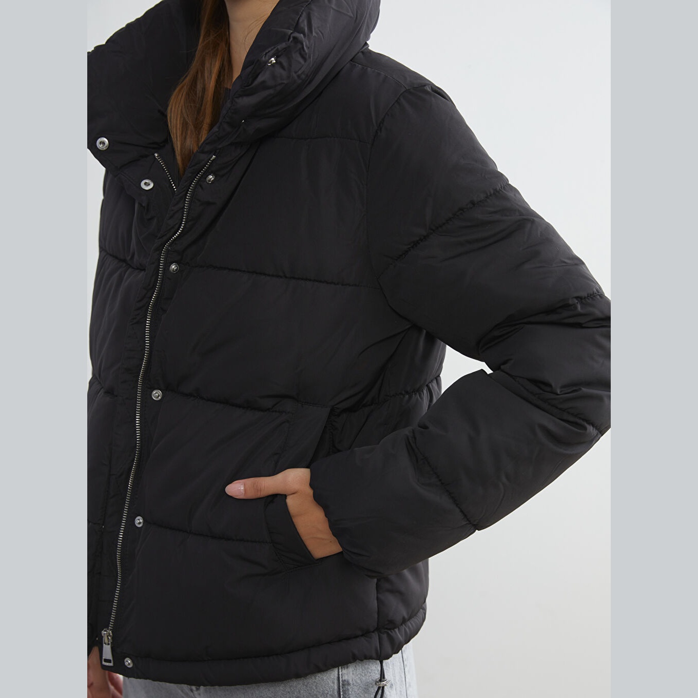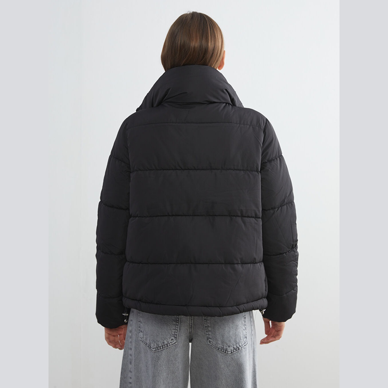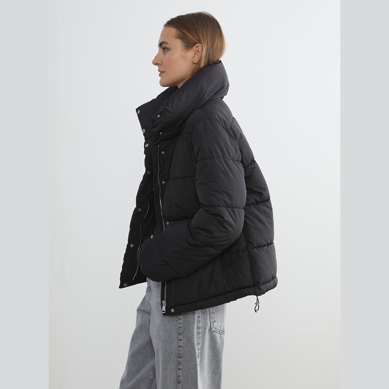 معطف نسائي شتوي بياقة مستقيمة من LCW ECO – أسود (قصة واسعة، تصميم قصير، خامة بوليستر بسماكة عالية، مزود بسحاب أمامي، مثالي للإطلالات الشتوية اليومية بأسلوب عملي ومستدام)