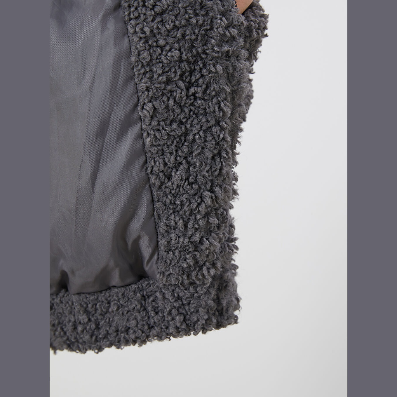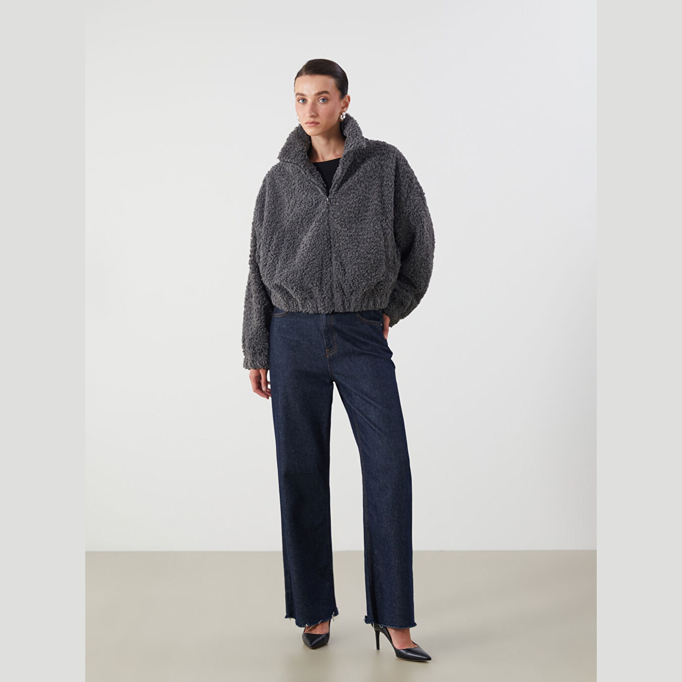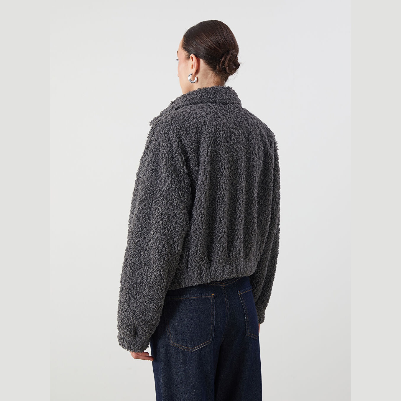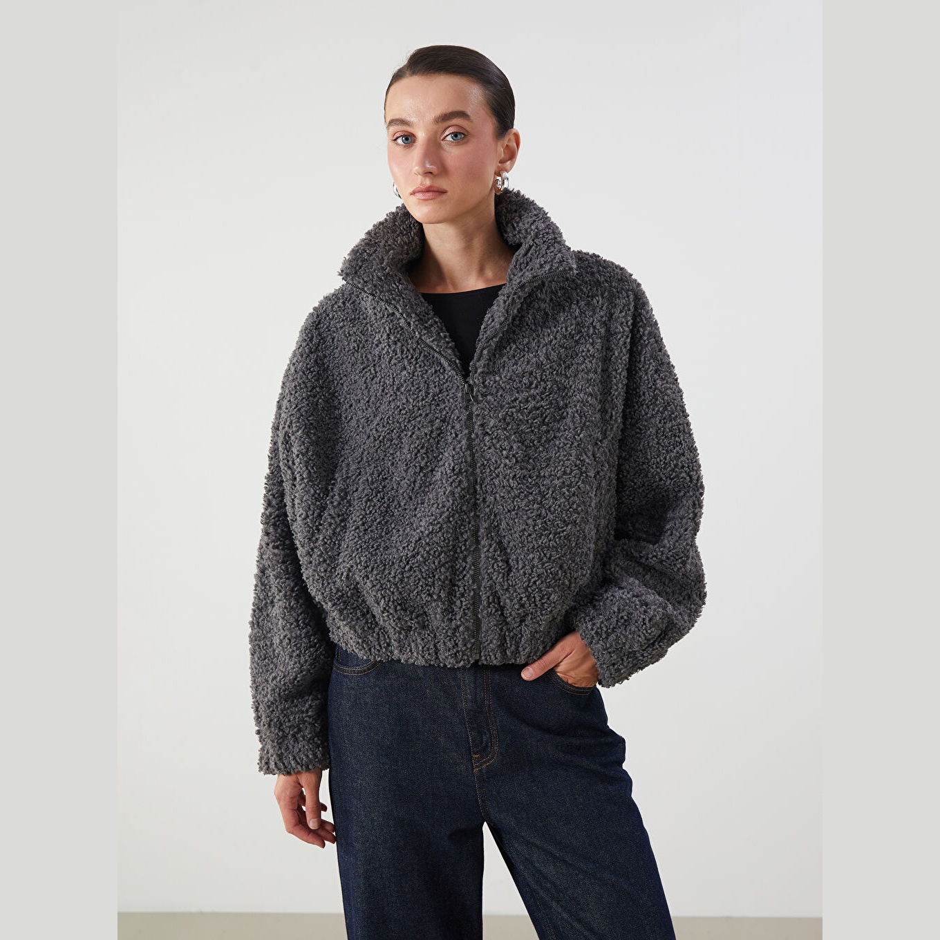 جاكيت نسائي شتوي بملمس فرو بياقة قميص من LCW ECO – رمادي (قصة واسعة، تصميم قصير، خامة بوليستر ناعمة، مزود بسحاب أمامي، مثالي للإطلالات اليومية الشتوية بأسلوب عصري ودافئ)