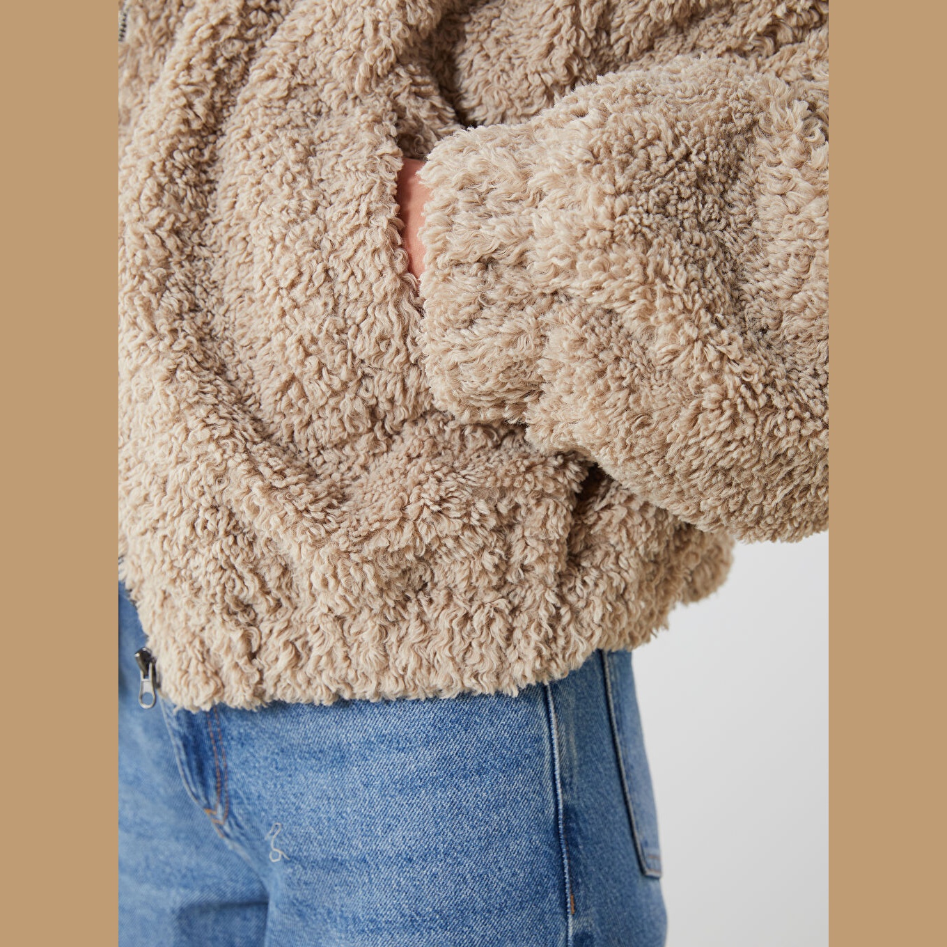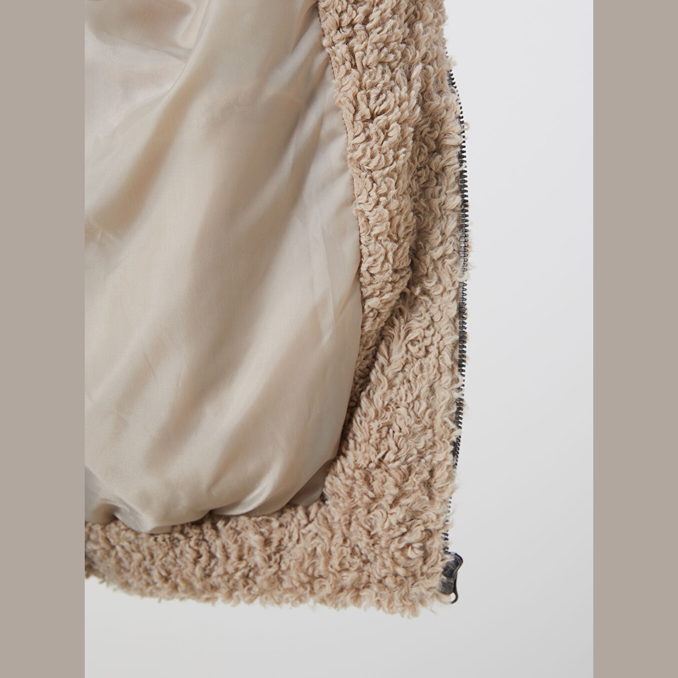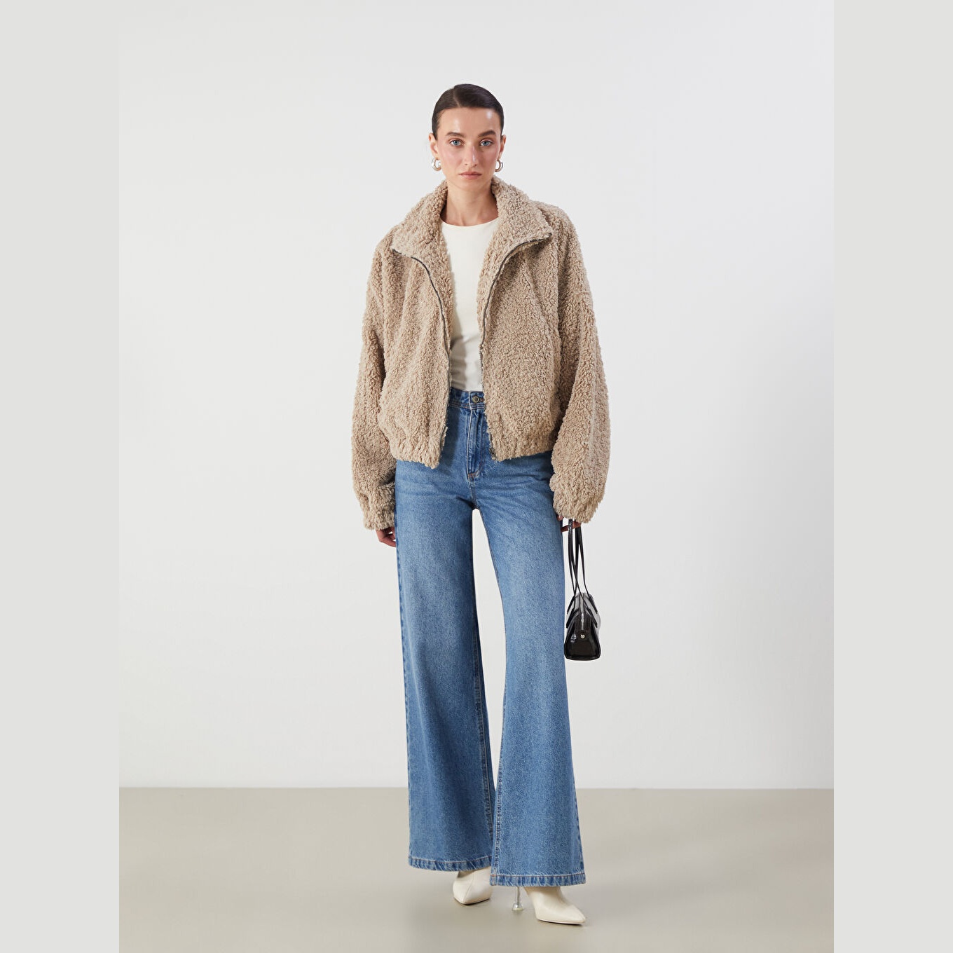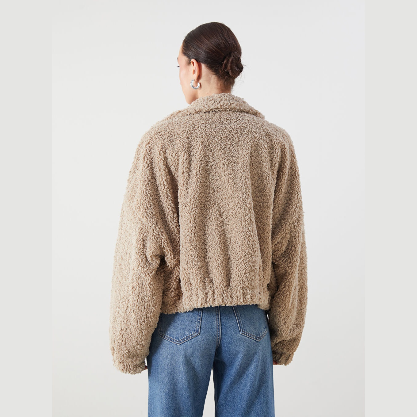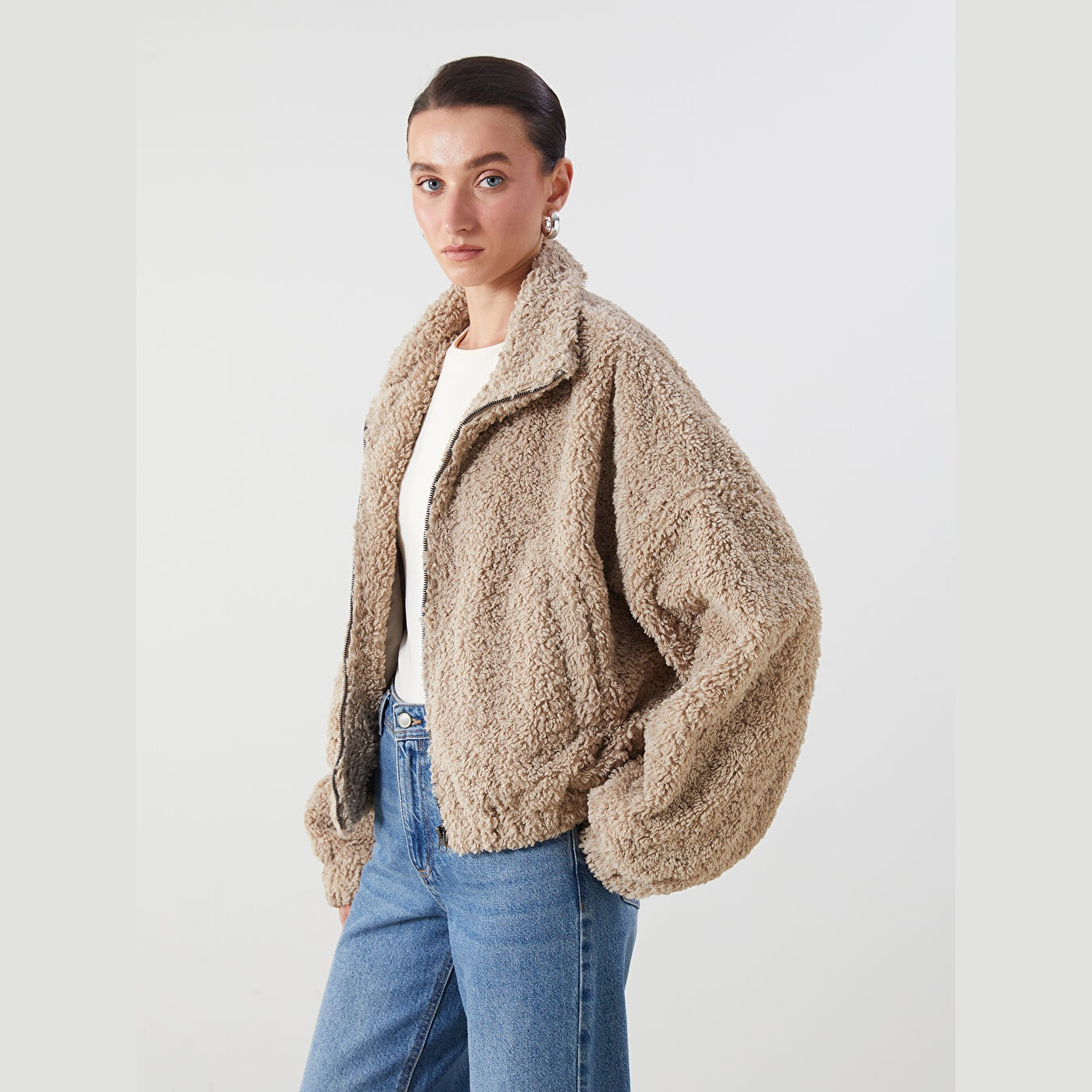 جاكيت نسائي شتوي بملمس فرو بياقة قميص من LCW ECO – بني (قصة واسعة، تصميم قصير، خامة بوليستر ناعمة، مزود بسحاب أمامي، مثالي للإطلالات اليومية الشتوية بأسلوب عصري ودافئ)