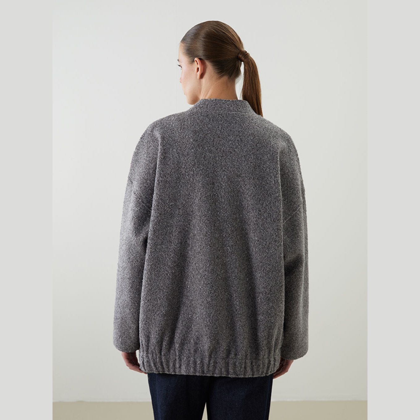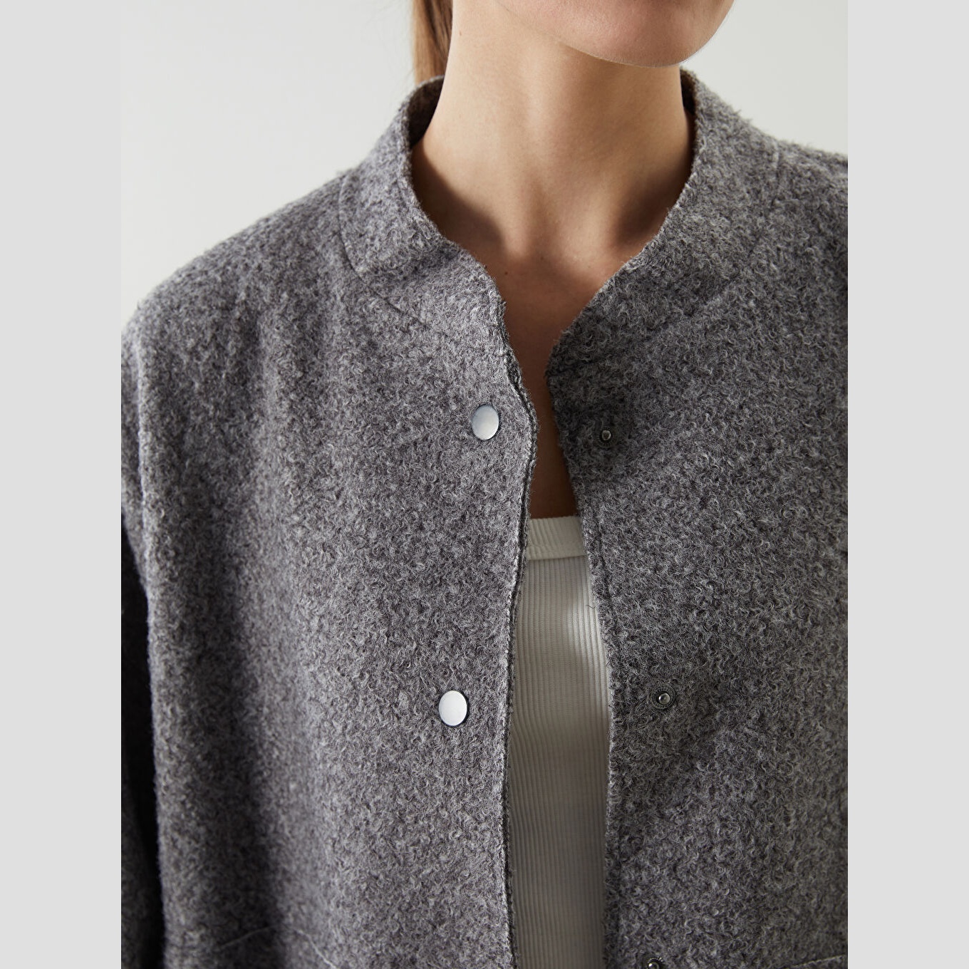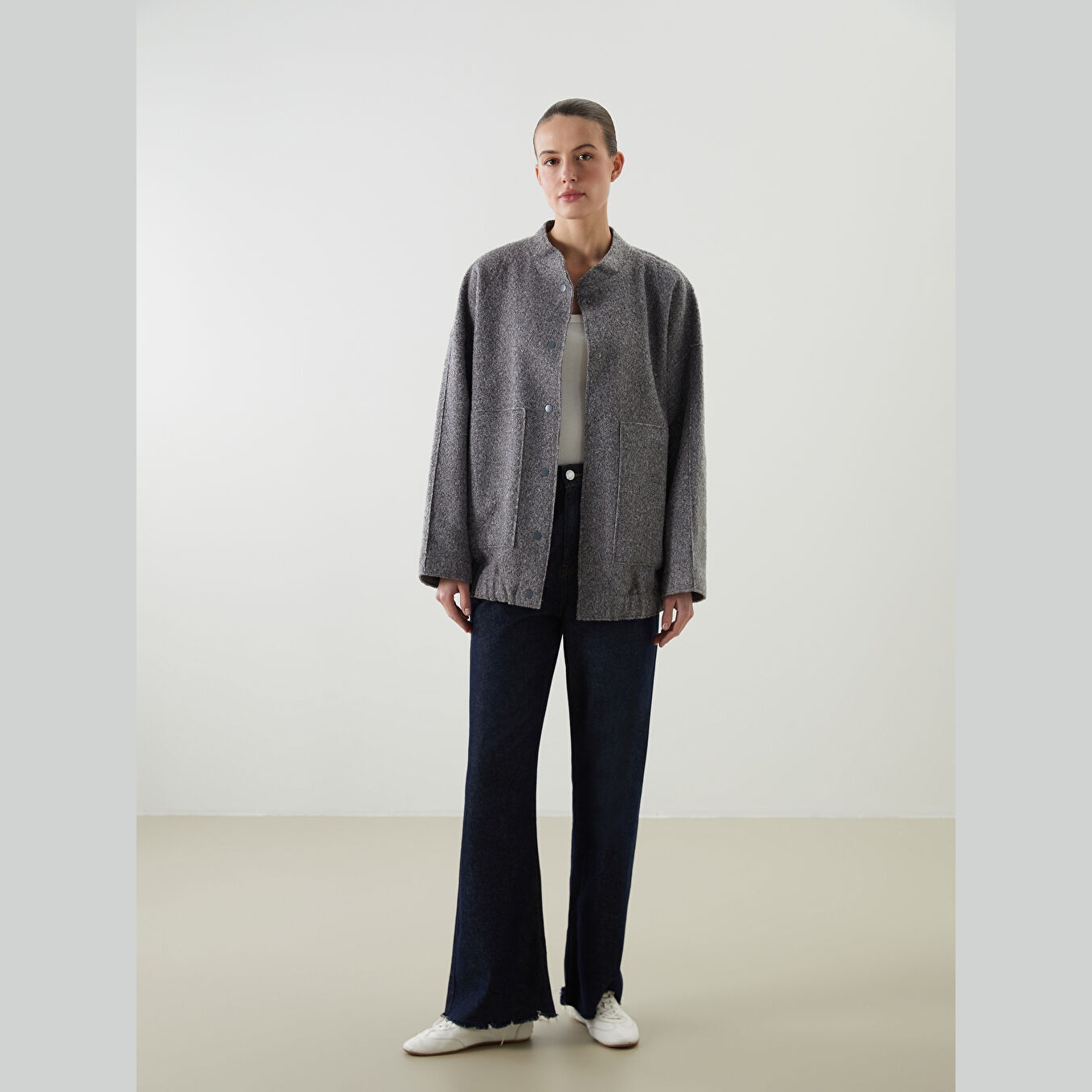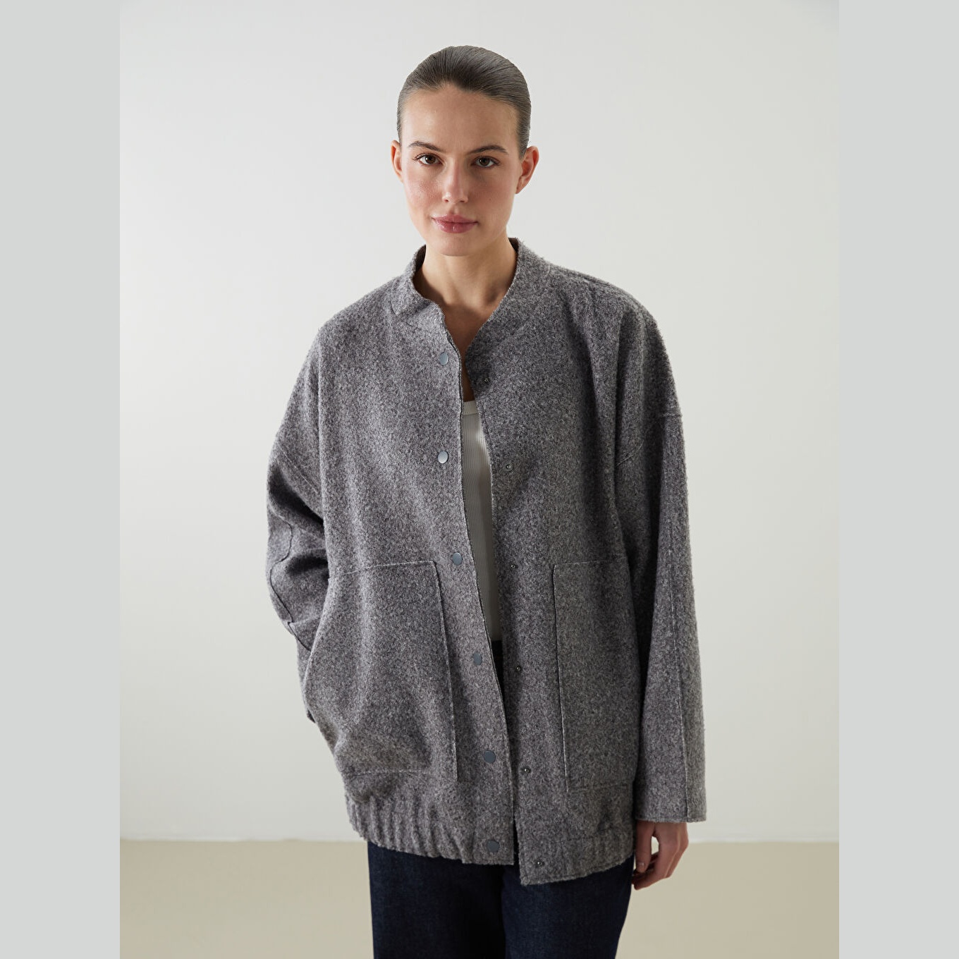 جاكيت نسائي بستايل بومبر بياقة كلية من LCW Classic – رمادي (قصة واسعة، تصميم قصير، خامة كاشيه بسماكة متوسطة، بدون بطانة، مثالي للإطلالات اليومية بأسلوب شبابي وعصري)