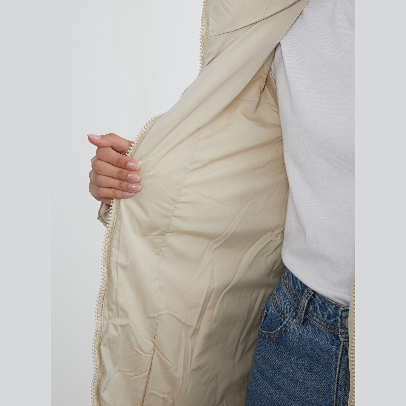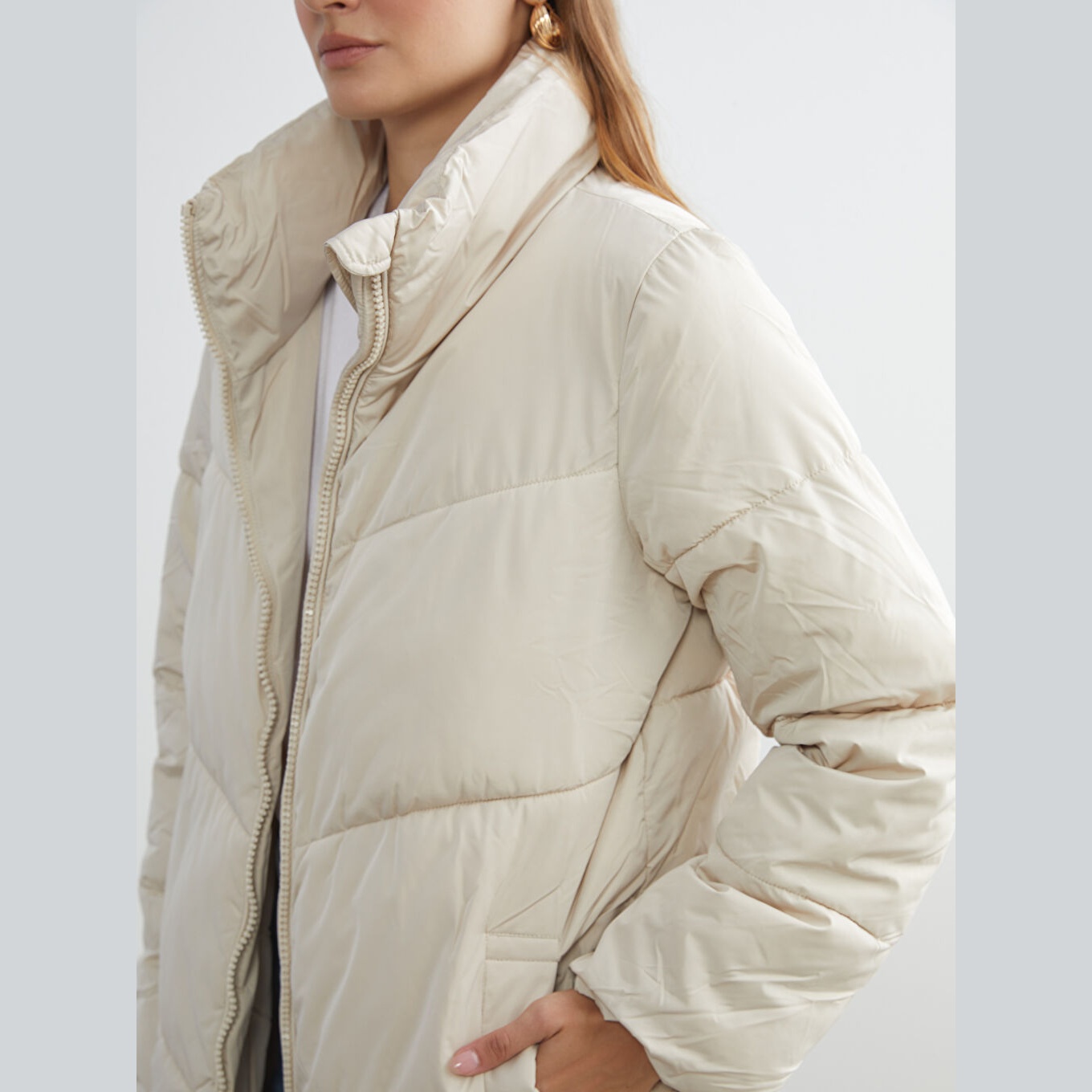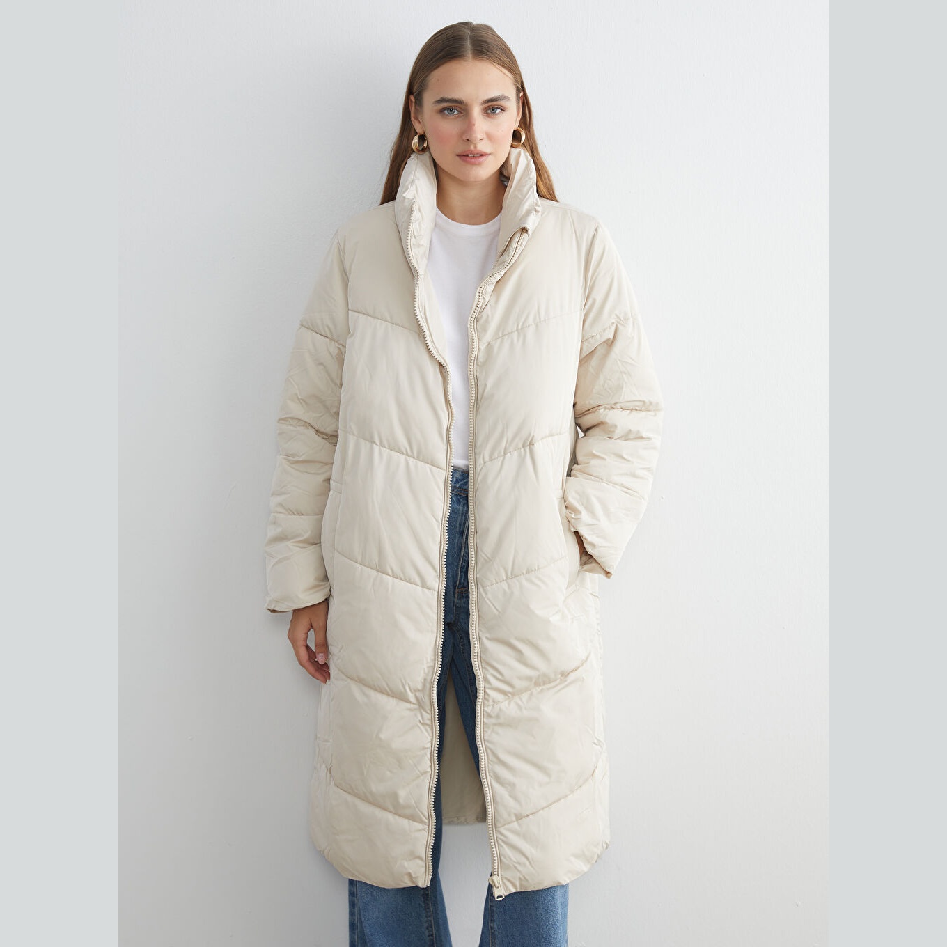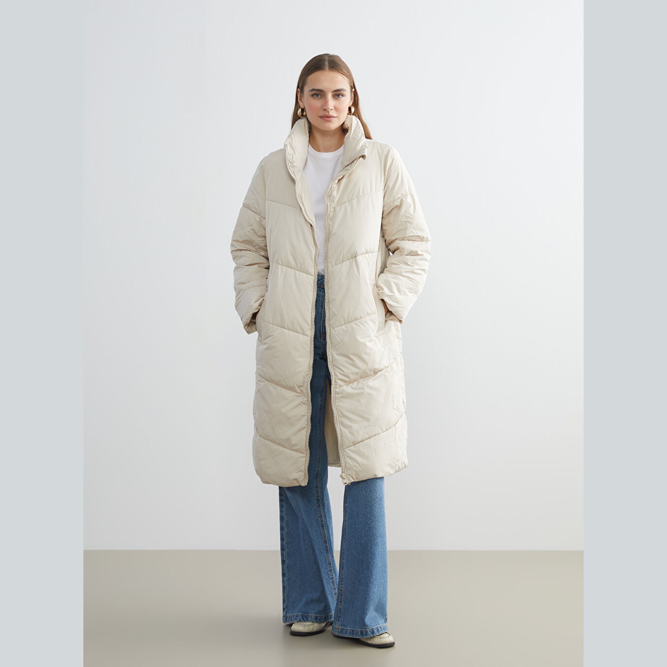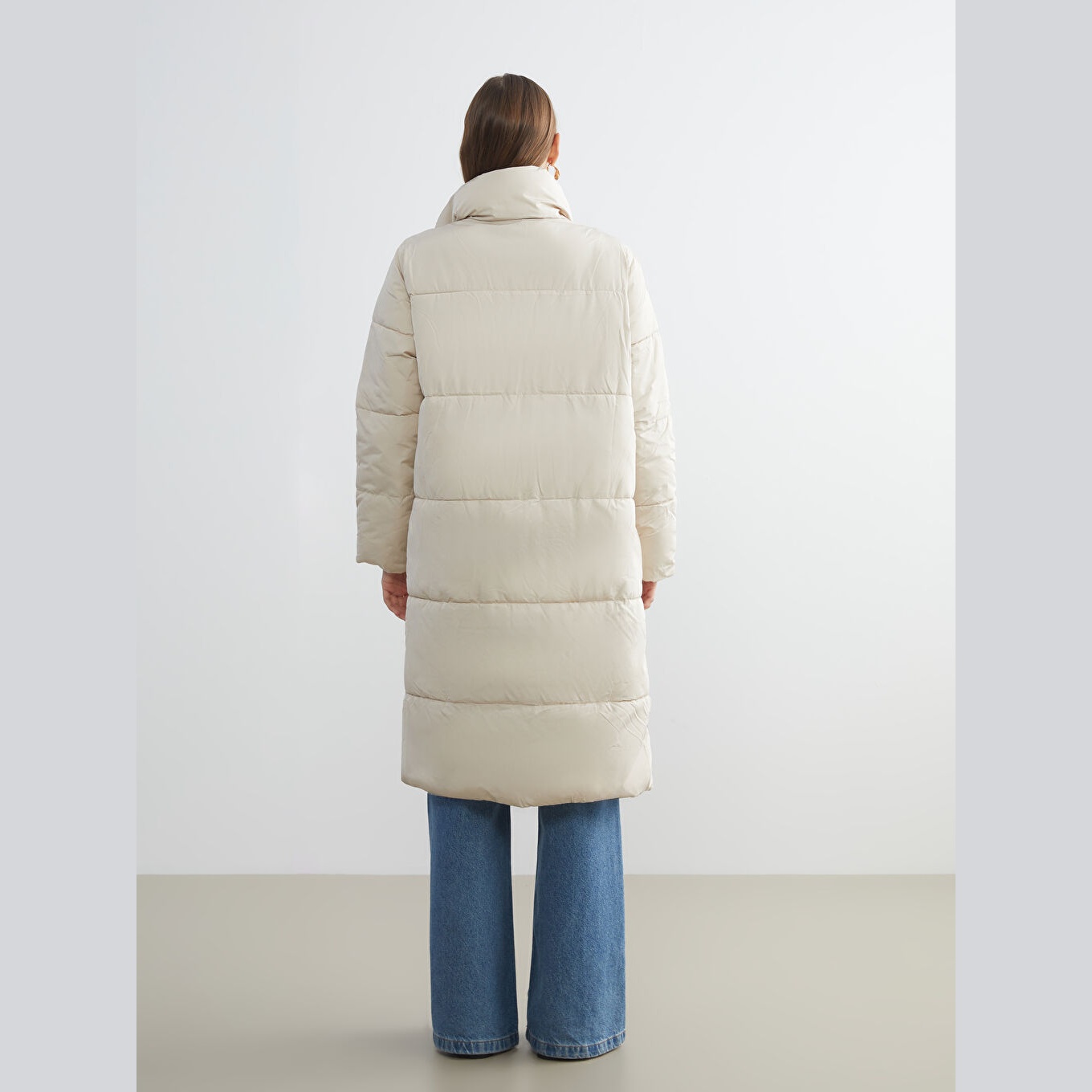 معطف شتوي بلون إكرو من مجموعة LCW ECO، تصميم بياقة مستقيمة بدون قبعة، قصة واسعة (Loose Fit) تمنحك مظهرًا مريحًا وعصريًا، خامة خارجية من %100 بوليستر، مبطّنة بالكامل بـ%100 بوليستر، مع حشوة داخلية من %100 بوليستر، تصميم سادة بدون نقوش، بطول طويل يُقاس من الكتف، مزود بسحاب أمامي، مثالي للإطلالات اليومية في الطقس البارد بأسلوب عملي وصديق للبيئة.