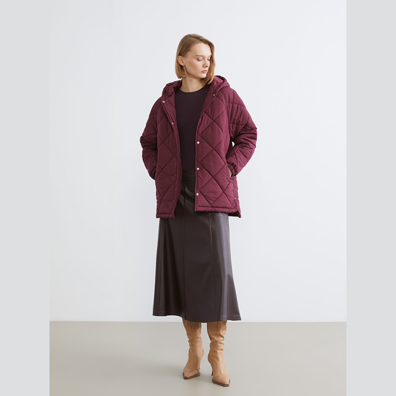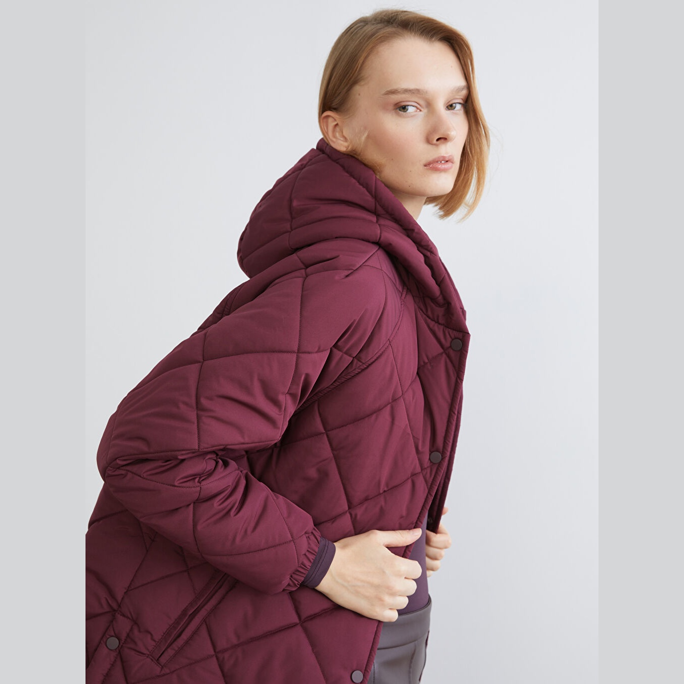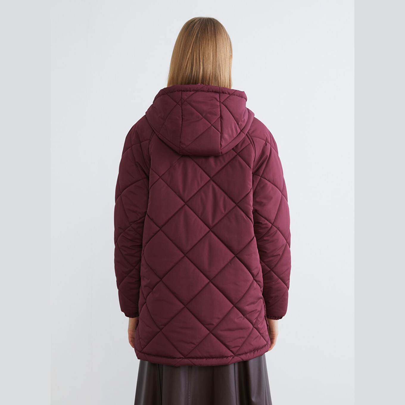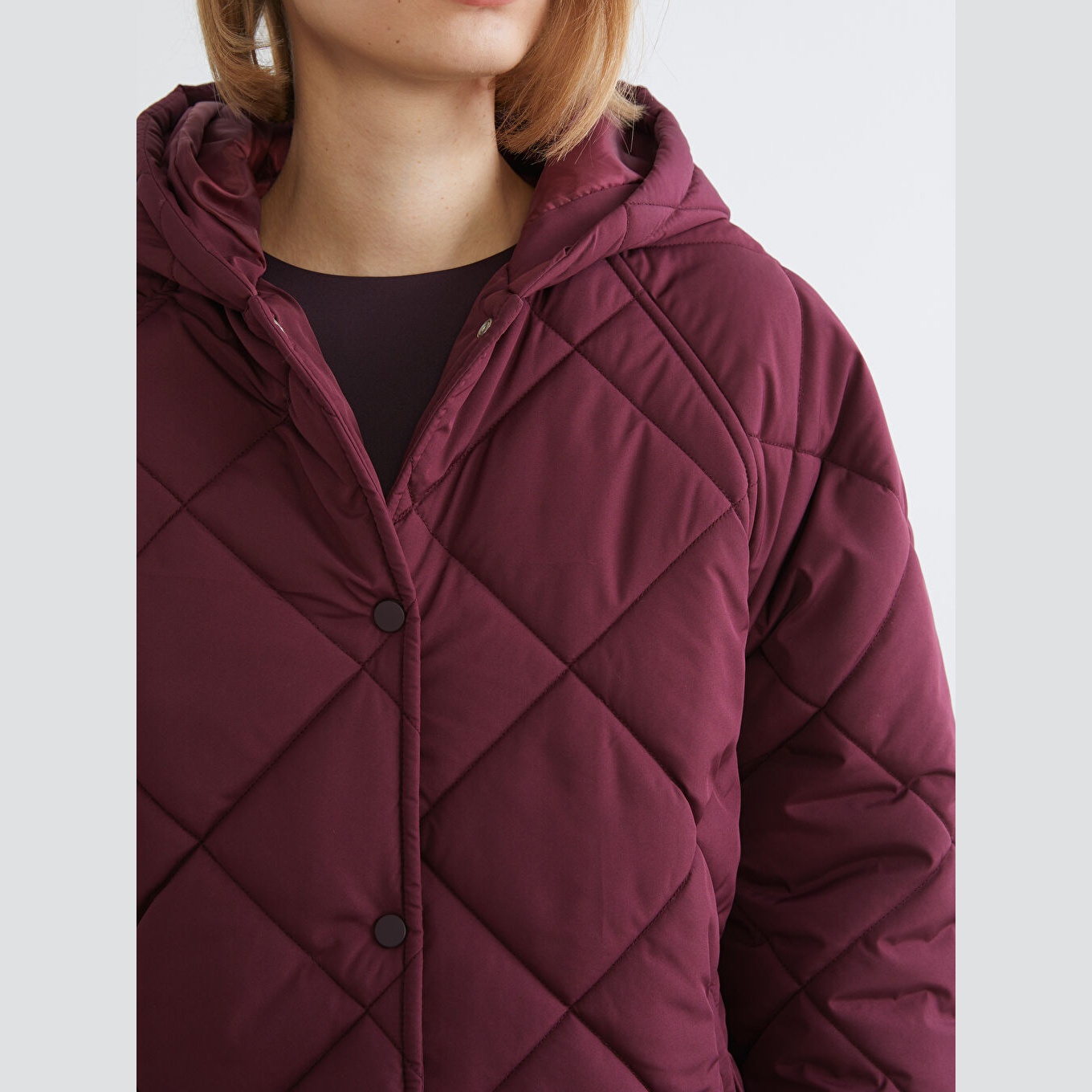 معطف نسائي شتوي بستايل كابيتوني من LCW Vision – بوردو (قصة واسعة، تصميم ميدي، خامة بوليستر بنمط كابيتوني، سماكة عالية، مزود بسحاب أمامي وقبعة ثابتة، مثالي للإطلالات الشتوية اليومية بأسلوب عملي ودافئ)