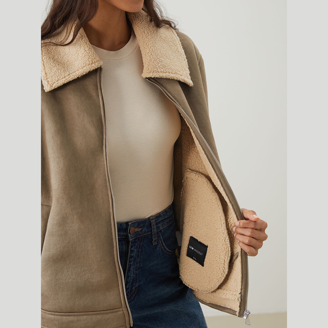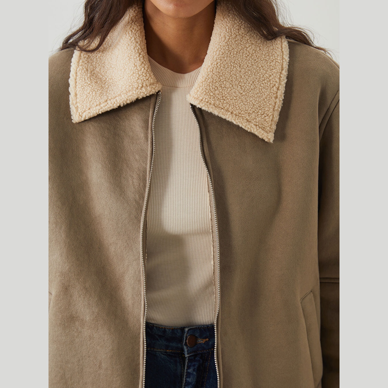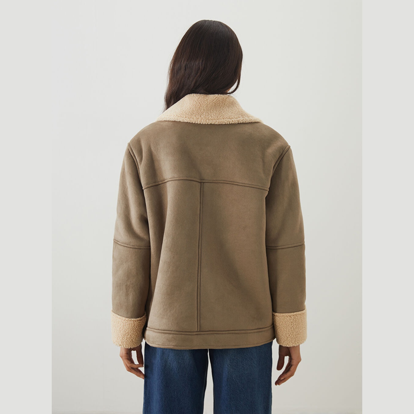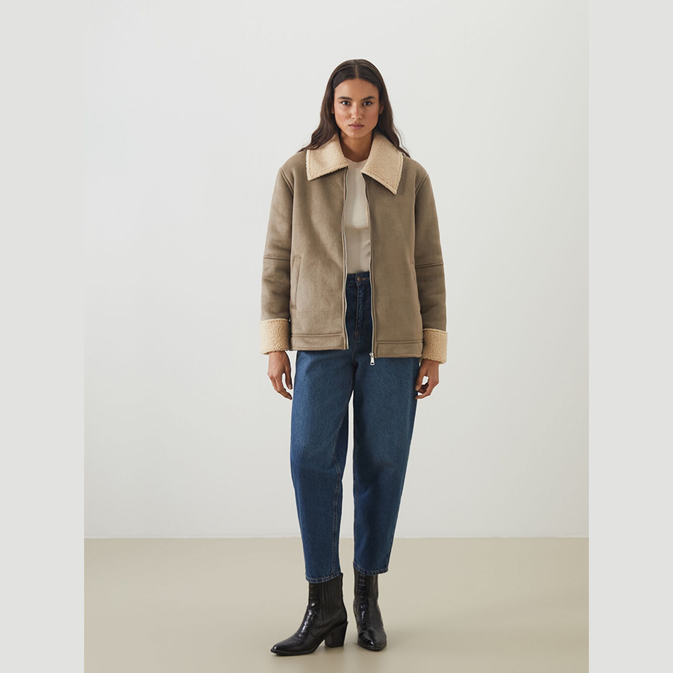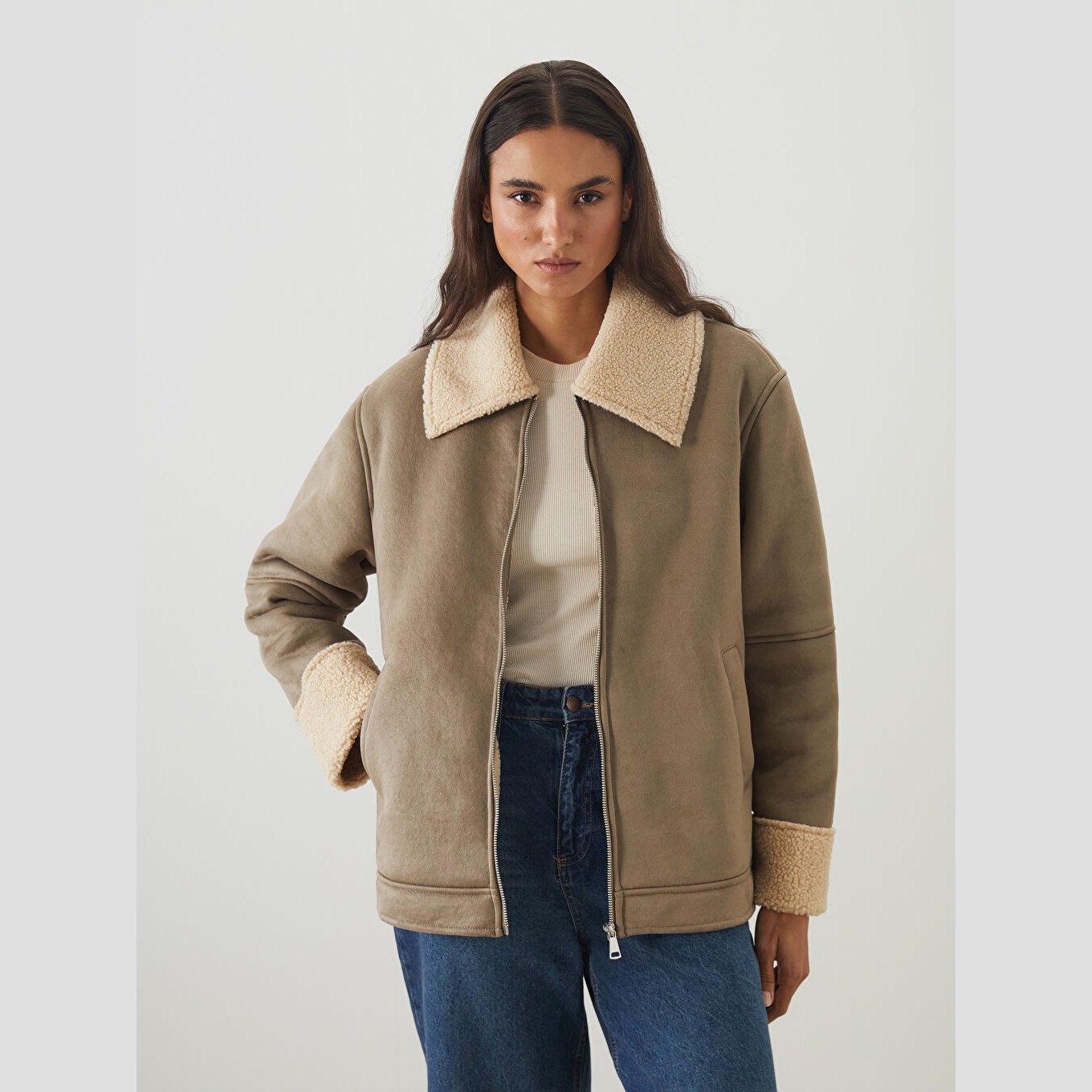 جاكيت نسائي شتوي من LCW Modest – بني (قصة واسعة، تصميم ميدي، خامة سويدية الملمس، بياقة قميص، بطانة بيليوش، مثالي للإطلالات الشتوية المحتشمة بأسلوب أنيق وفاخر)