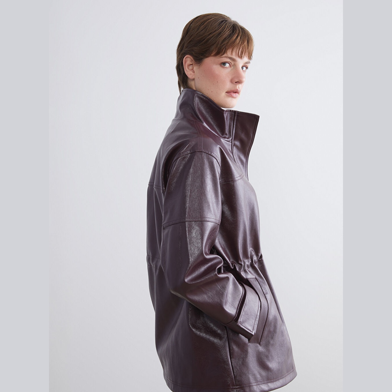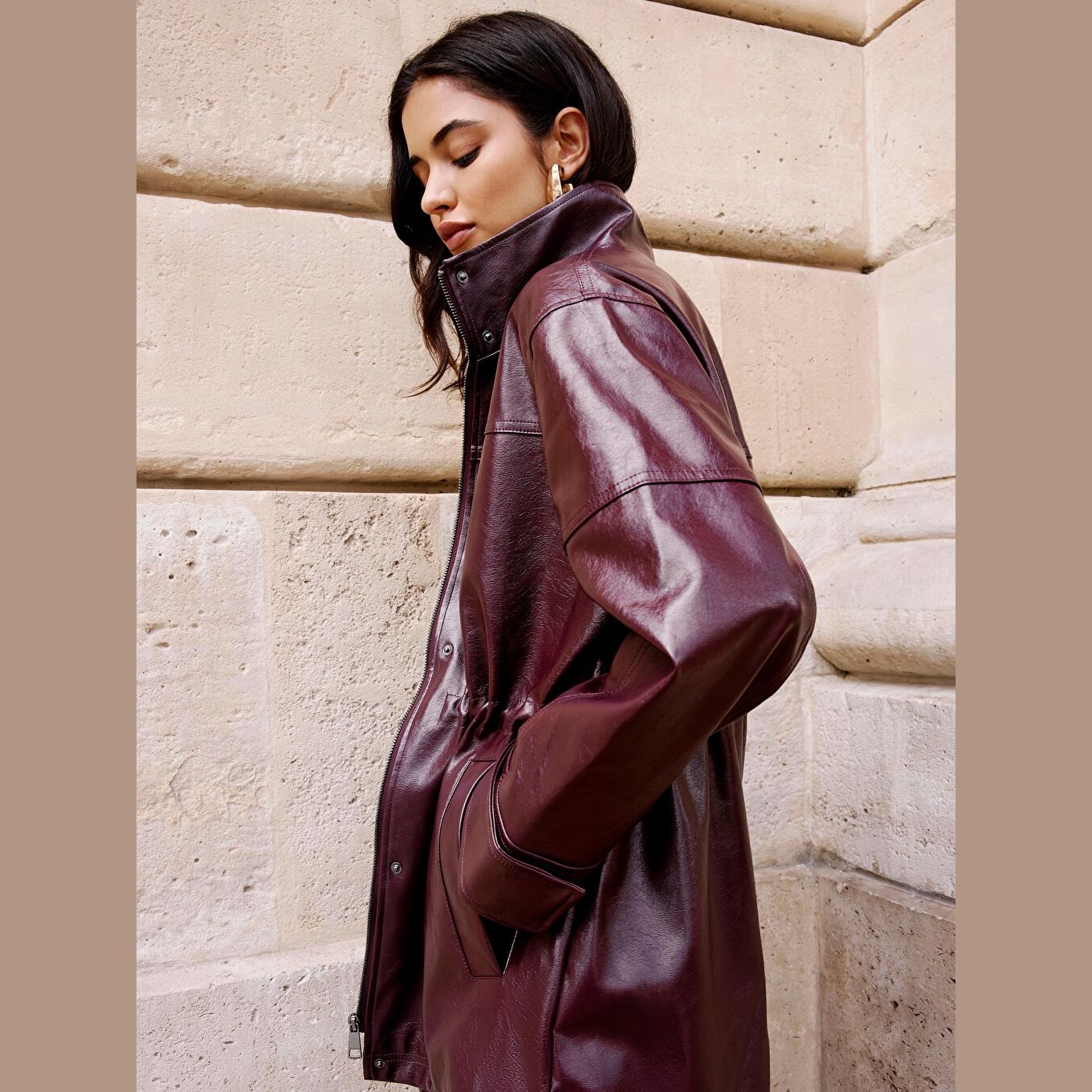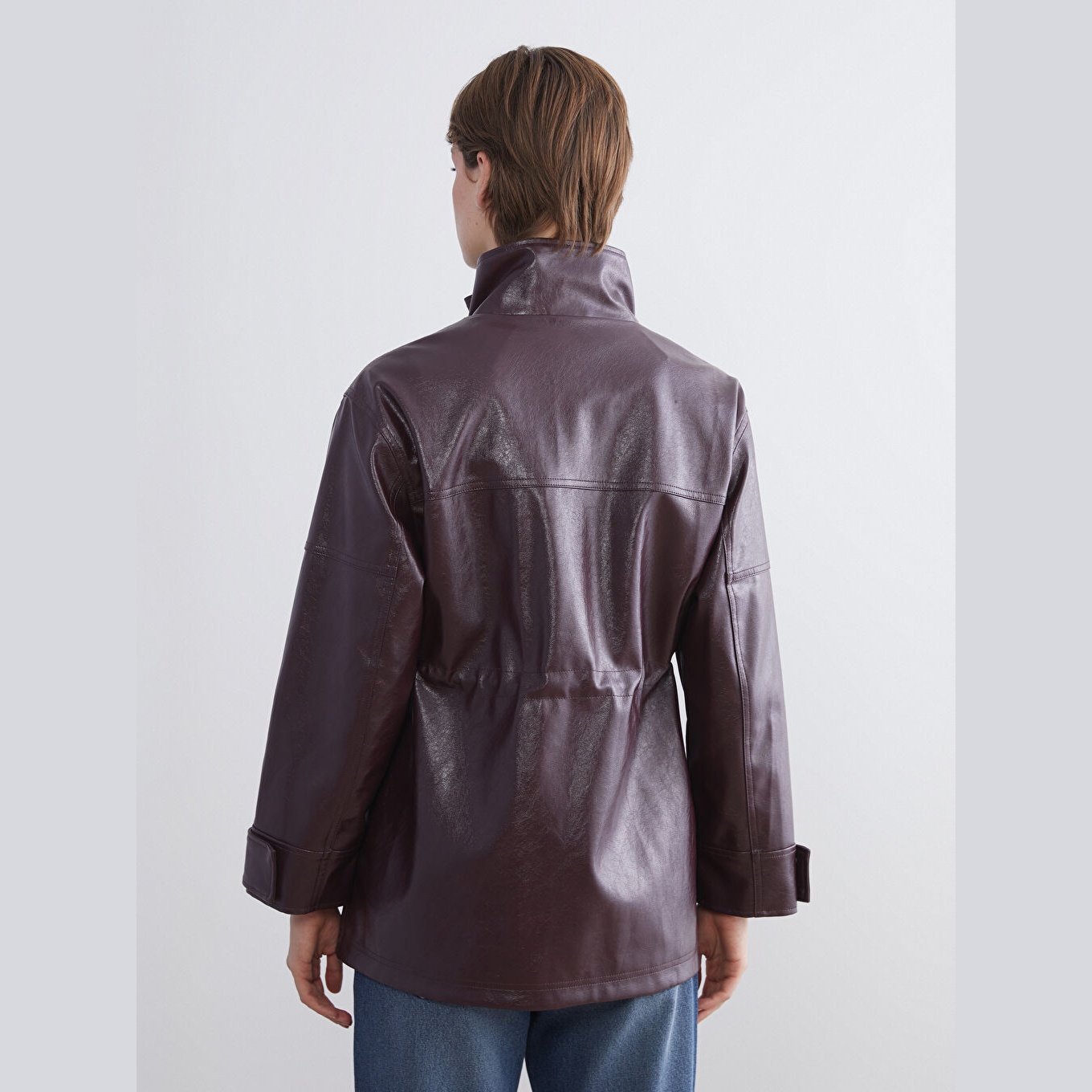 جاكيت نسائي شتوي من LCW Classic – بوردو (قصة واسعة Oversize، تصميم ميدي، خامة جلد صناعي، بياقة مستقيمة، بدون قبعة، سحاب أمامي، مثالي للإطلالات الشتوية الجريئة والعصرية)