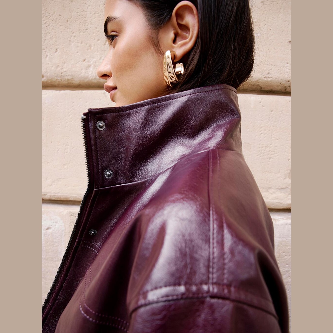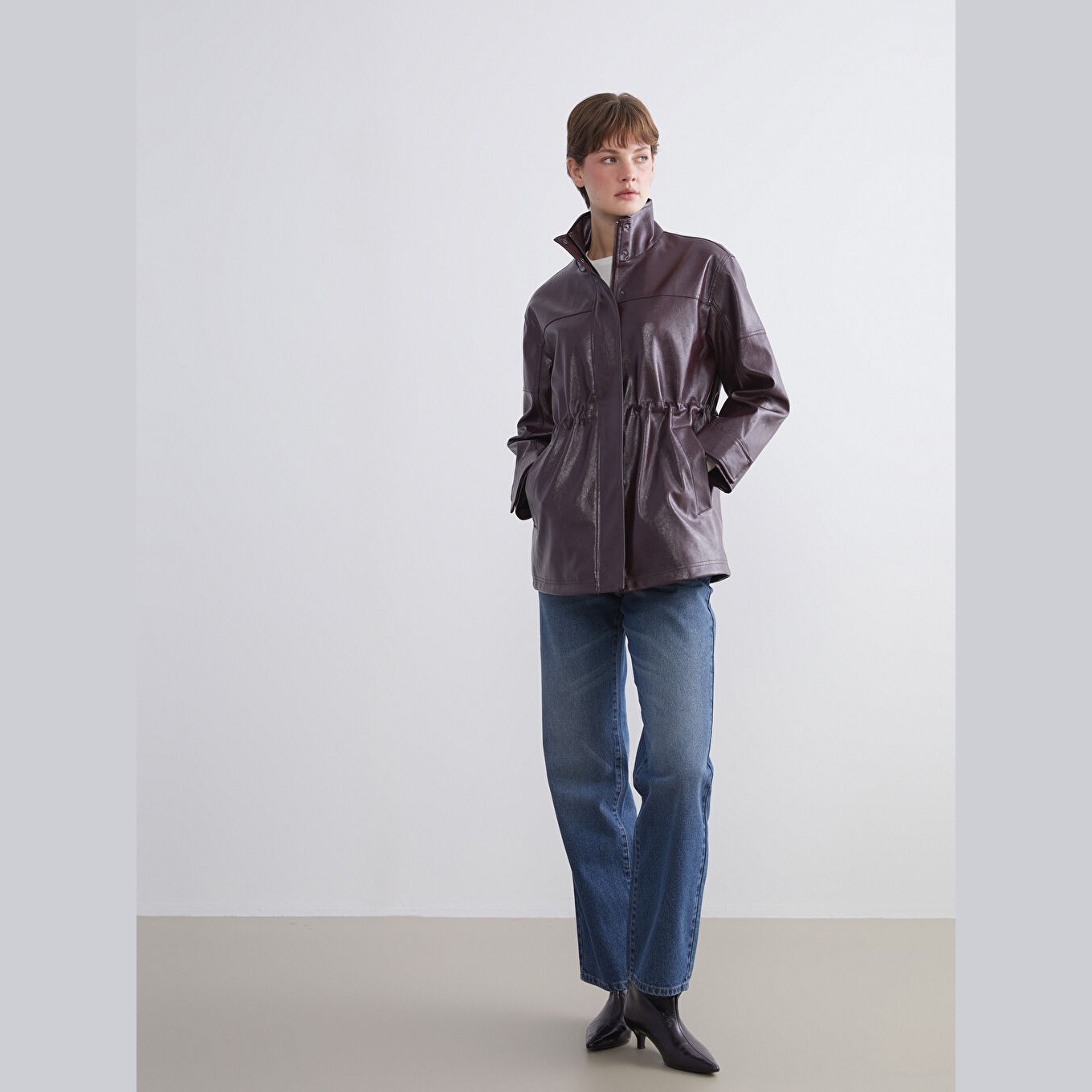 جاكيت شتوي بلون بوردو من مجموعة LCW Classic، تصميم بياقة مستقيمة يمنحك مظهرًا عصريًا، قصة Oversize واسعة توفر راحة وأناقة، خامة خارجية من جلد صناعي (تركيبة من %100 بولي يوريثان على أرضية من %40 فيسكوز و%60 بوليستر)، مبطّنة بالكامل بـ%100 بوليستر، بطول ميدي يُقاس من الكتف، بدون قبعة، مزود بسحاب أمامي عملي، مثالي للإطلالات اليومية الجريئة في الطقس البارد.