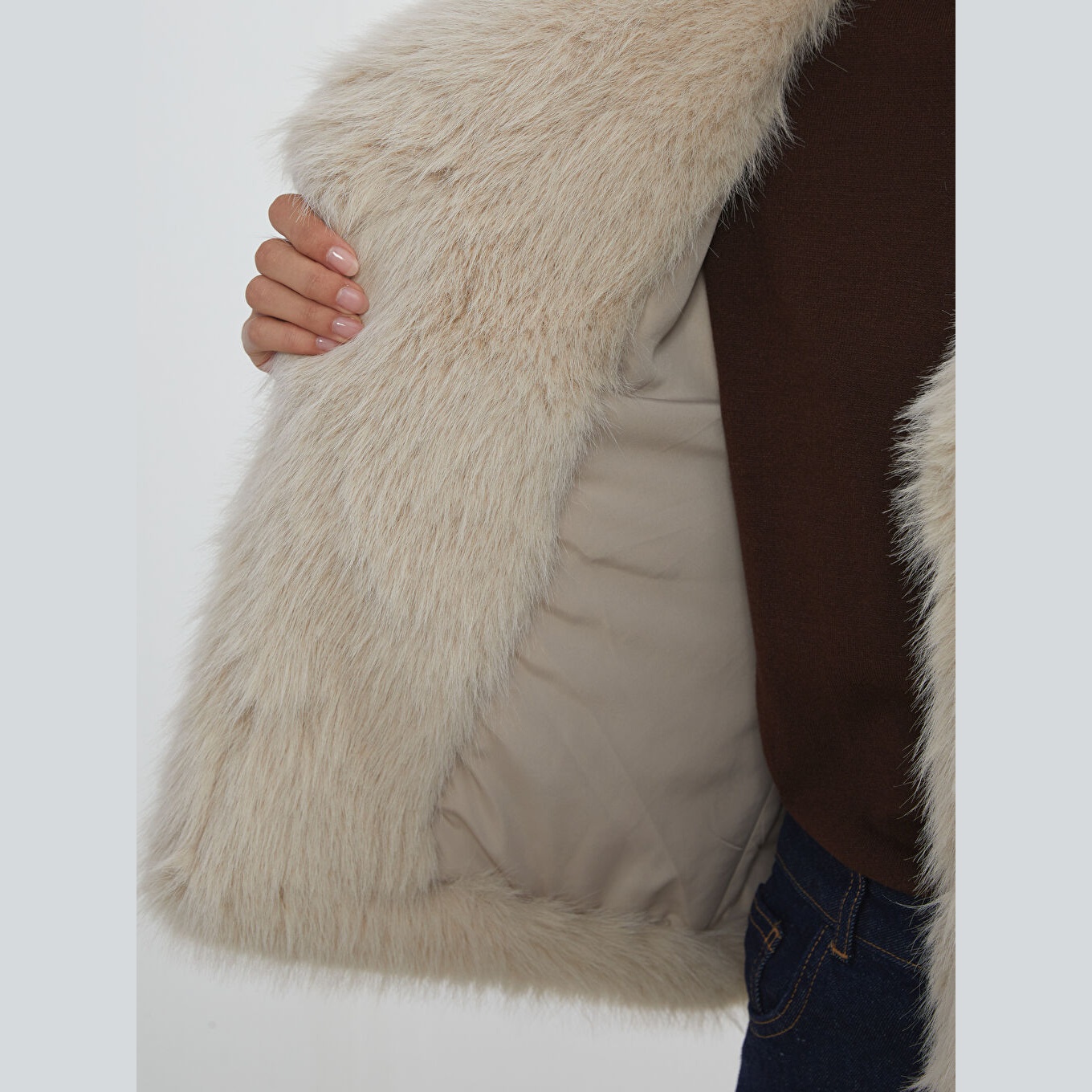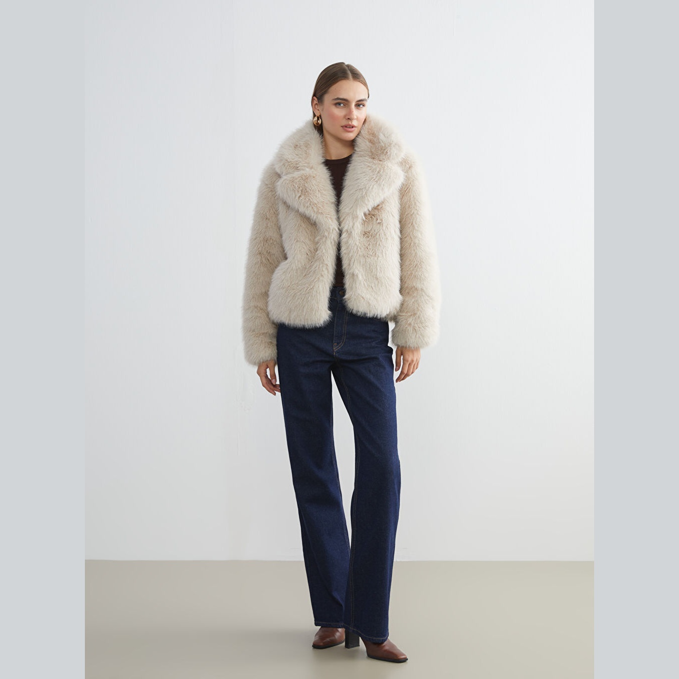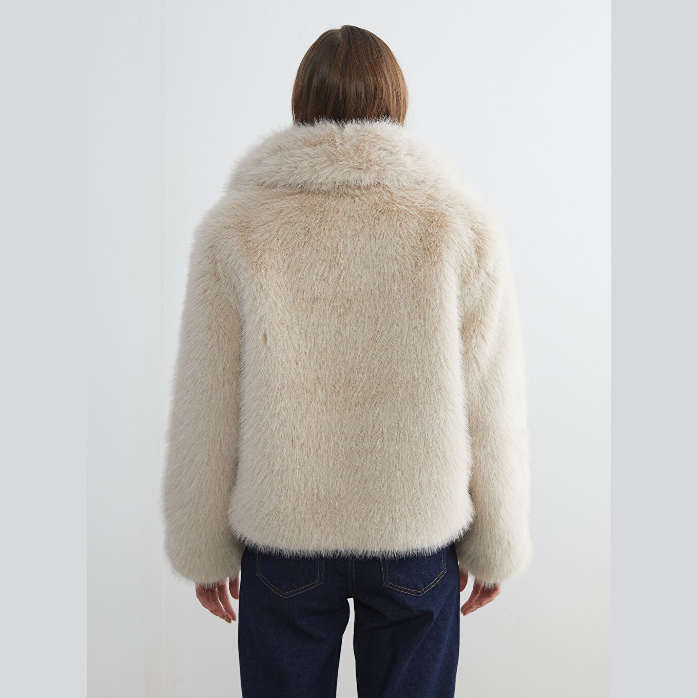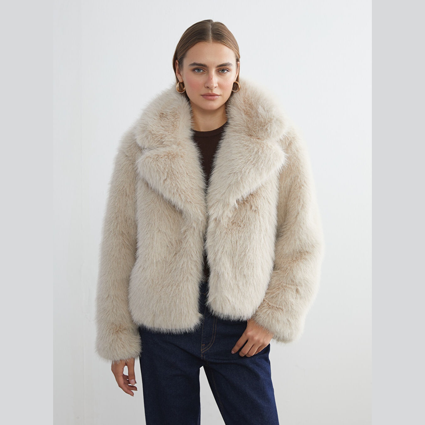 جاكيت نسائي شتوي من LCWAIKIKI Classic – إكرو (خامة فرو صناعي، ياقة بليزر، تصميم قصير، قصة واسعة، مثالي للإطلالات الشتوية الفاخرة)