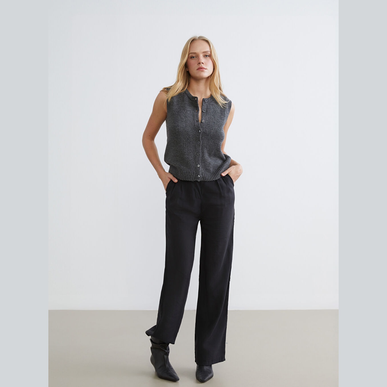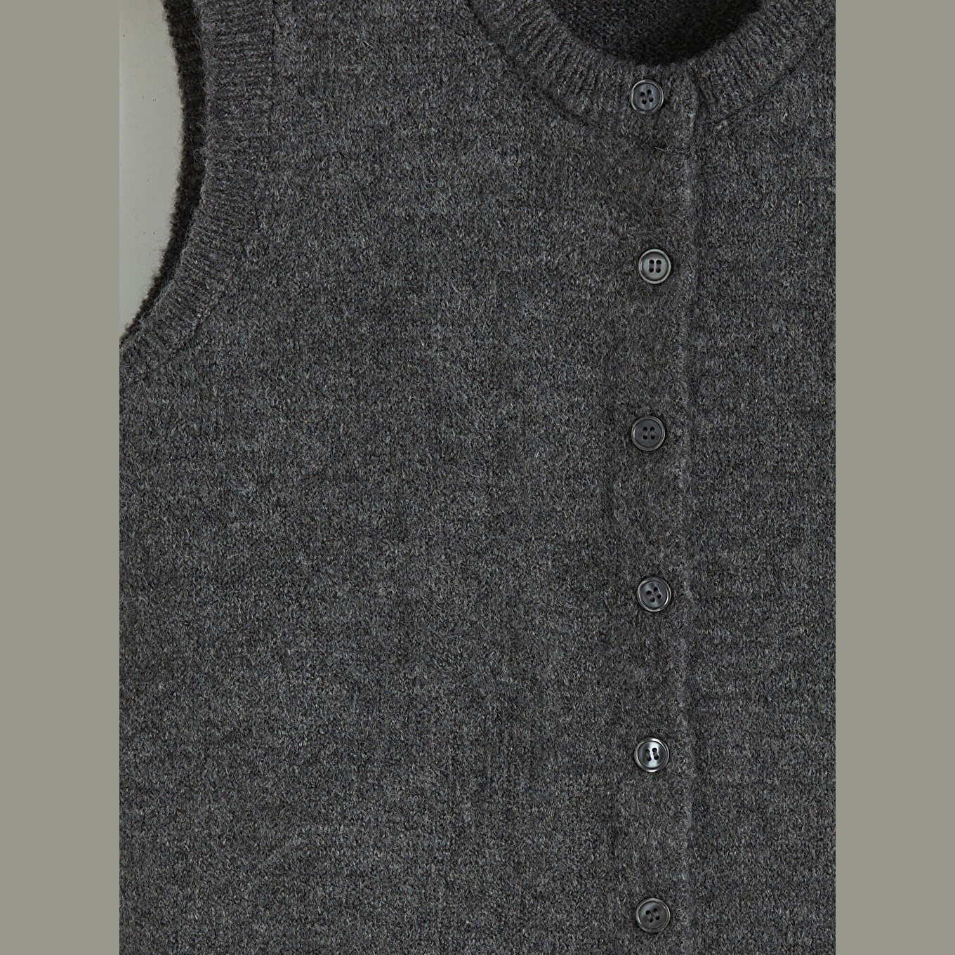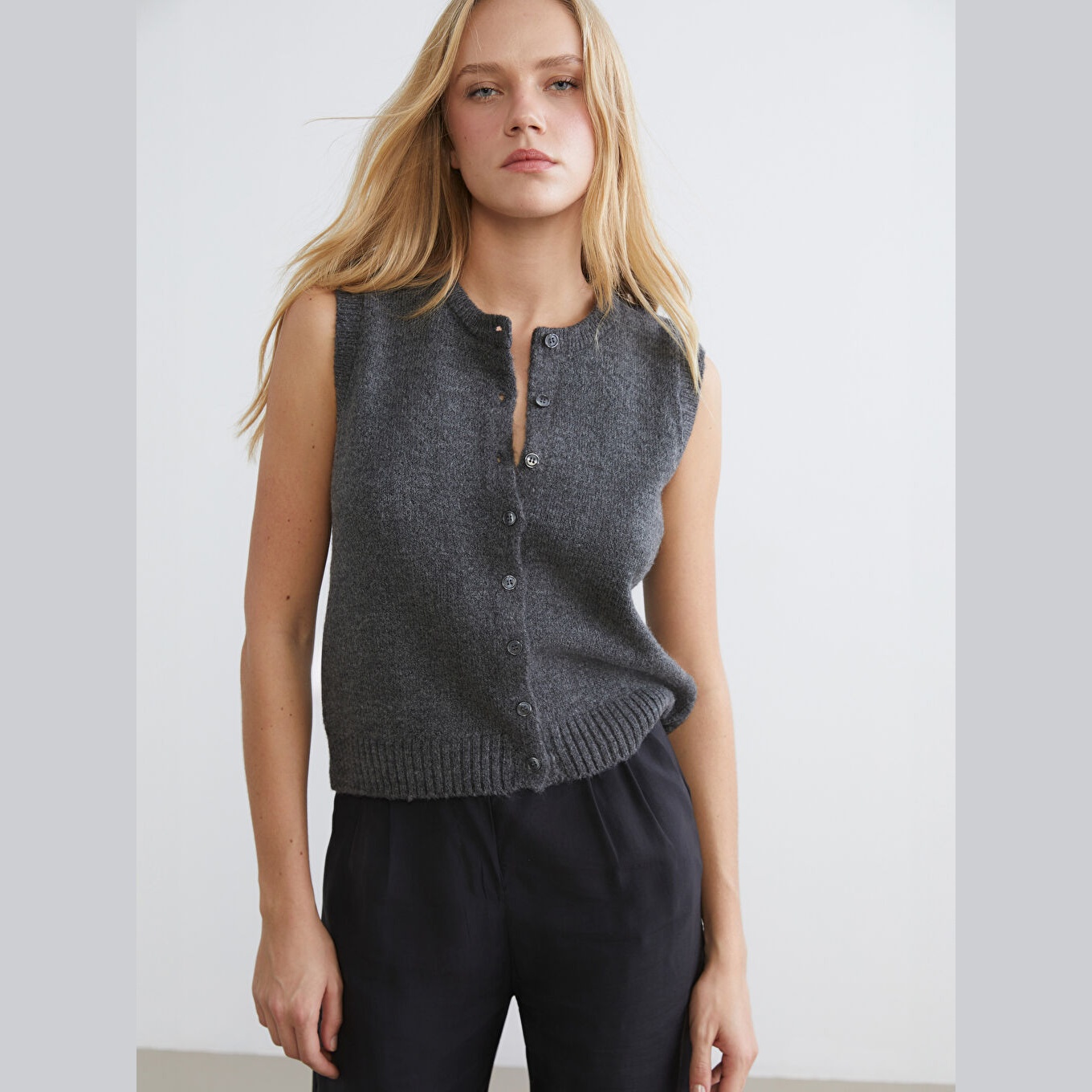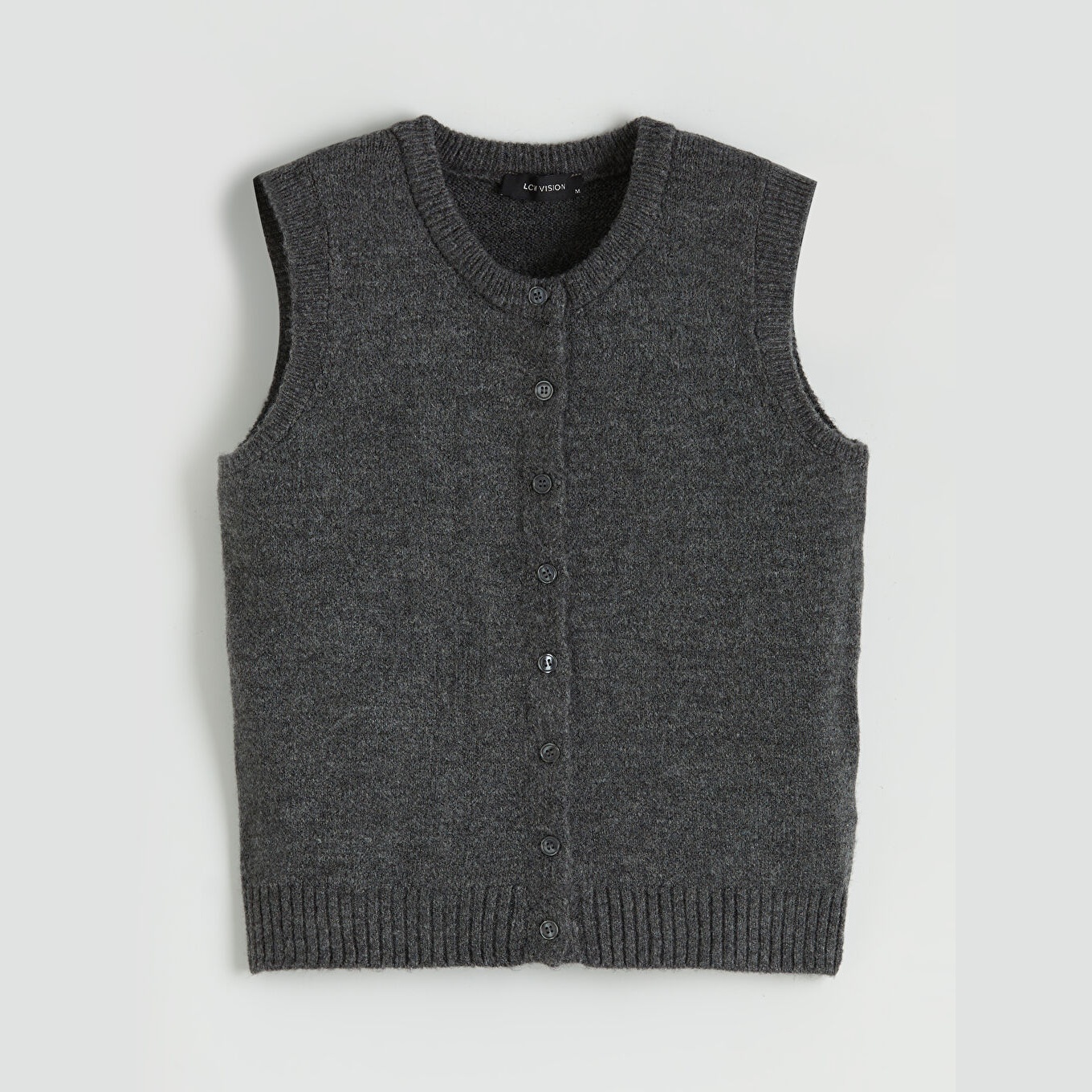 فيست نسائي من LCW Vision – أنثراسيت (تريكو بأزرار أمامية، ياقة دائرية، قصة ضيقة، مثالي للتنسيقات الخريفية والشتوية)