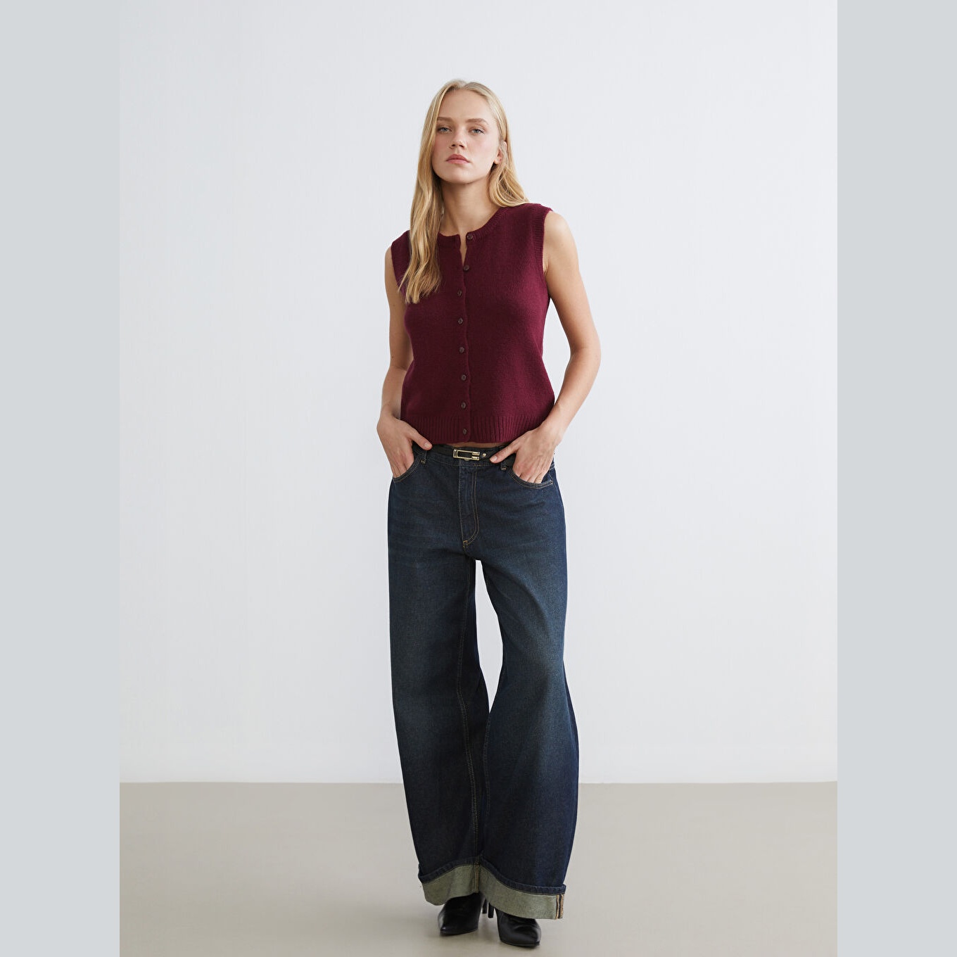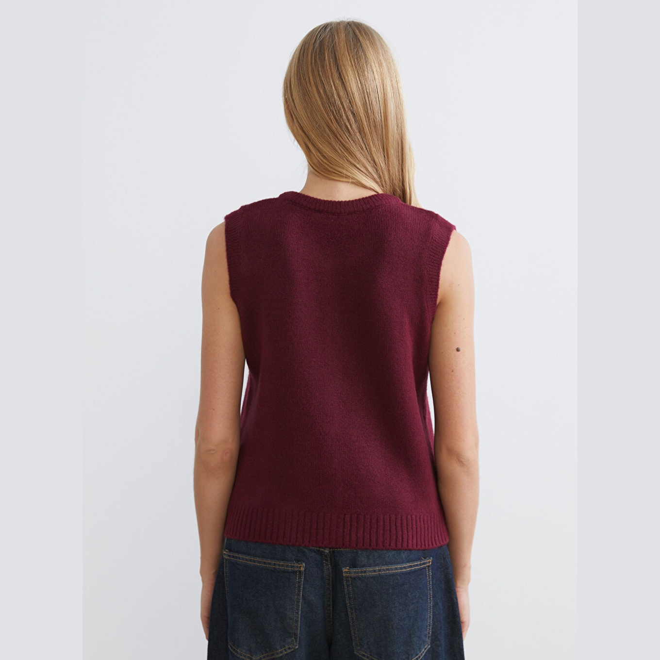 فيست تريكو بلون بوردو من مجموعة LCW Vision، تصميم بياقة دائرية (Bisiklet Yaka) كلاسيكية، مزوّد بأزرار أمامية لإطلالة عملية وأنيقة، قصة ضيقة (Dar & Slim) تبرز القوام وتمنحك مظهرًا أنثويًا، خامة ناعمة ومريحة من مزيج %75 أكريليك و%25 بوليستر، بدون أكمام، بطول ميدي يُقاس من الكتف، مثالي للتنسيق مع القمصان أو البلوزات في الإطلالات اليومية أو العملية خلال الخريف والشتاء.