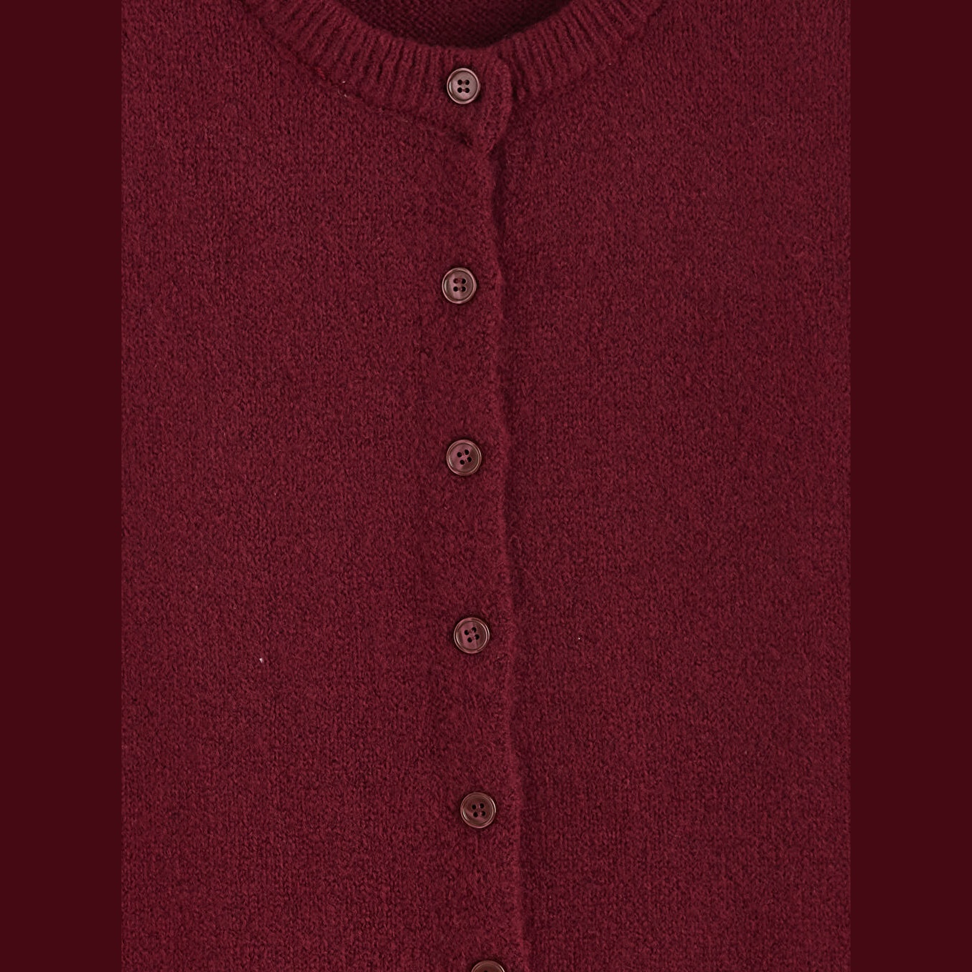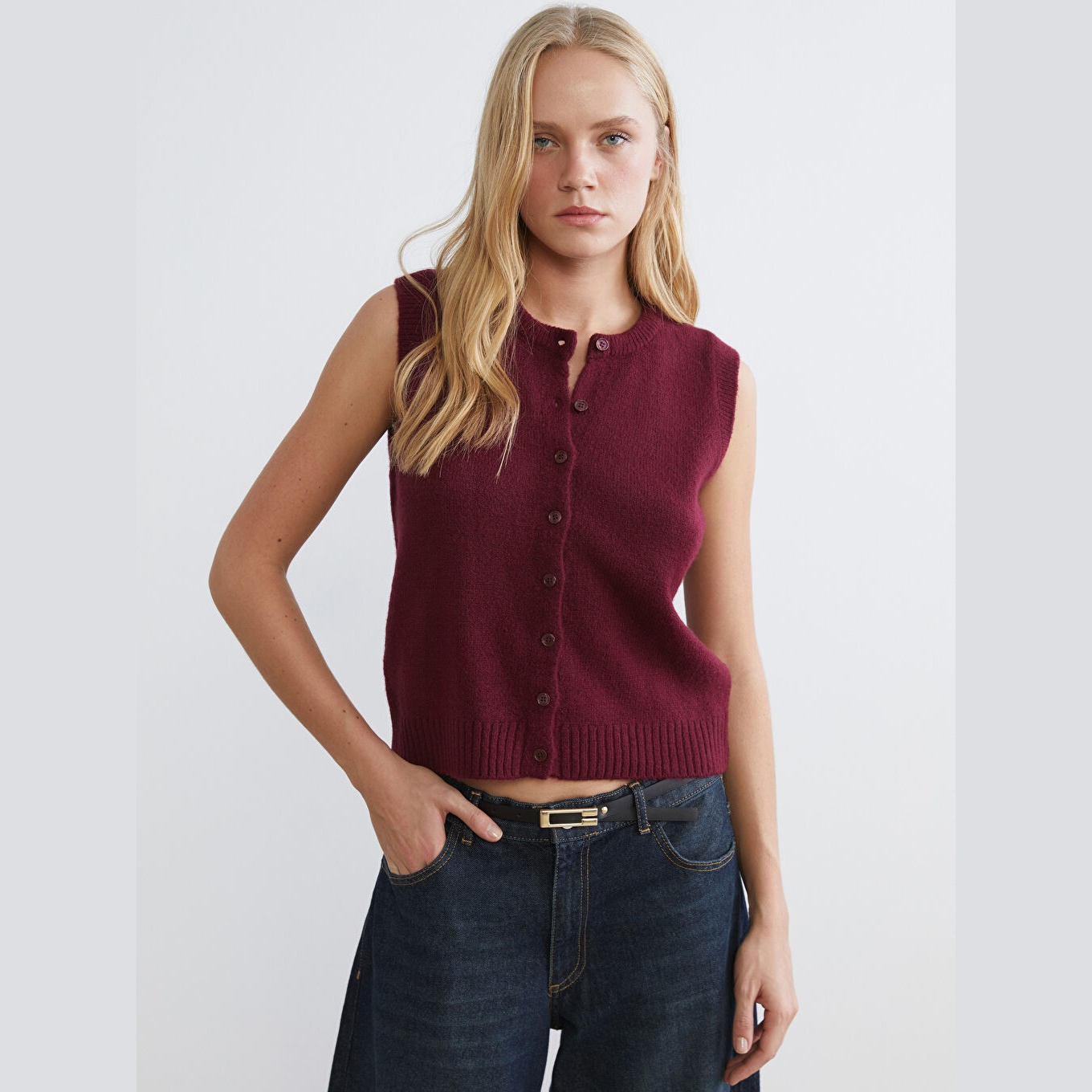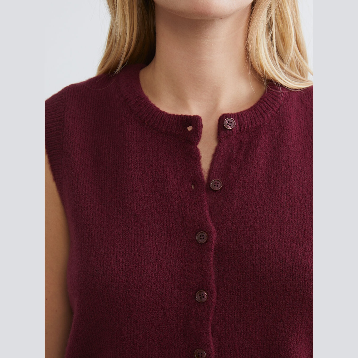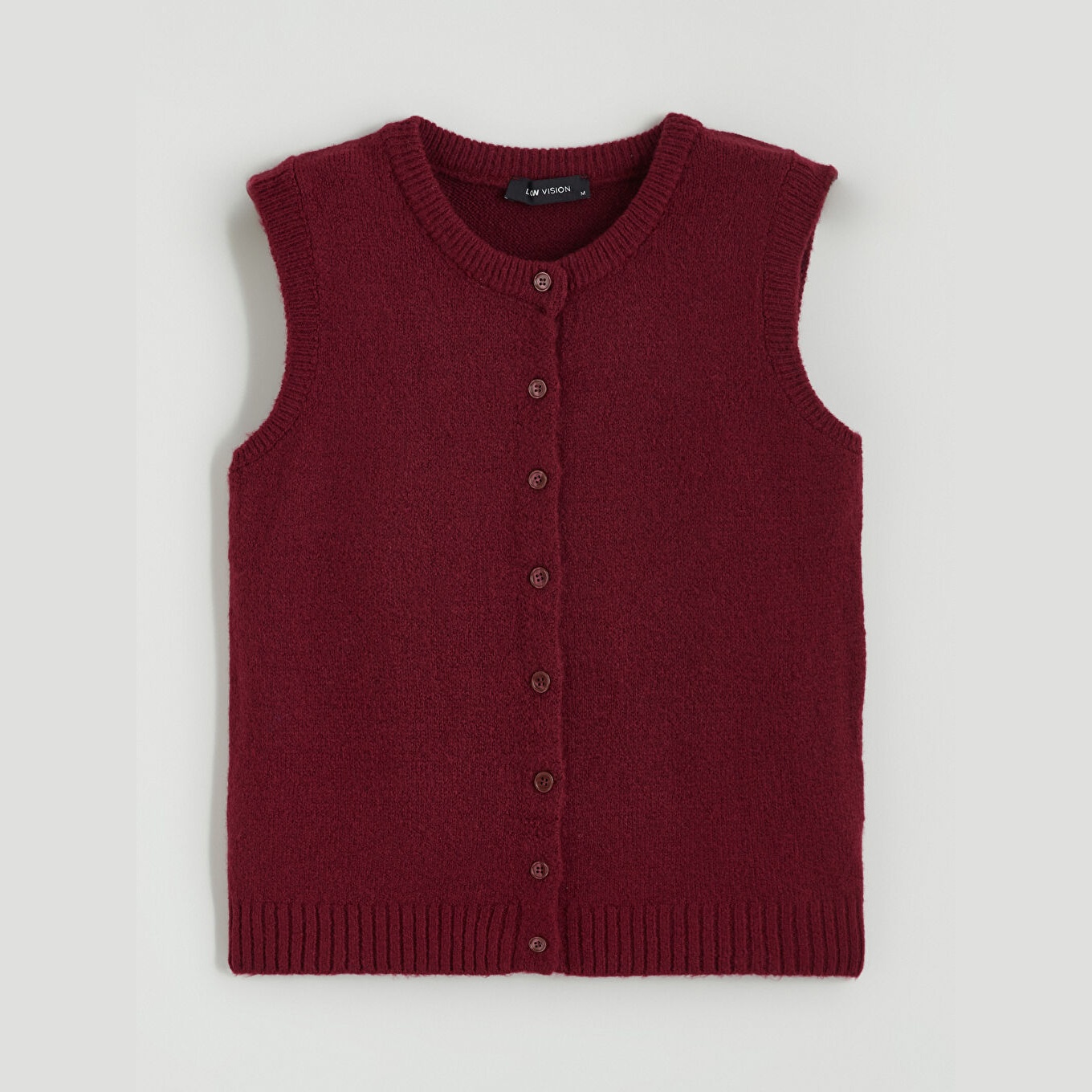 فيست نسائي من LCW Vision – بوردو (تريكو بأزرار أمامية، ياقة دائرية، قصة ضيقة، مثالي للتنسيقات الخريفية والشتوية)