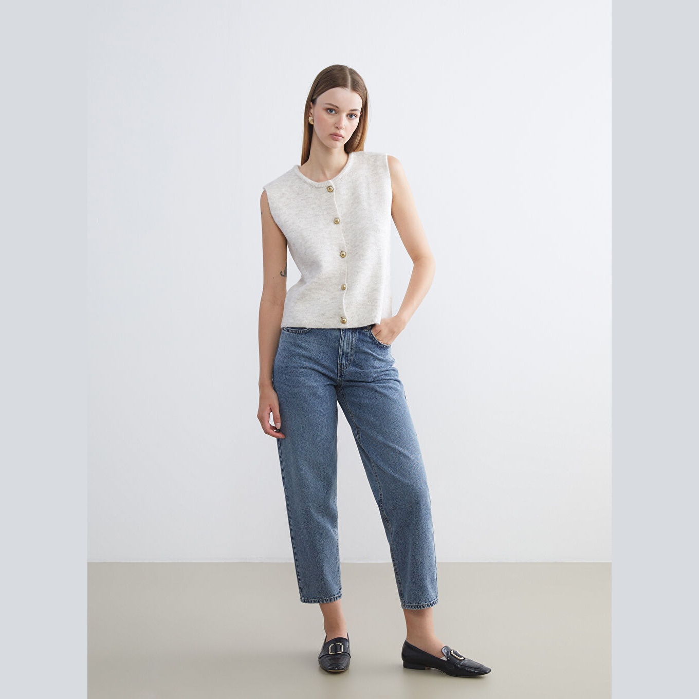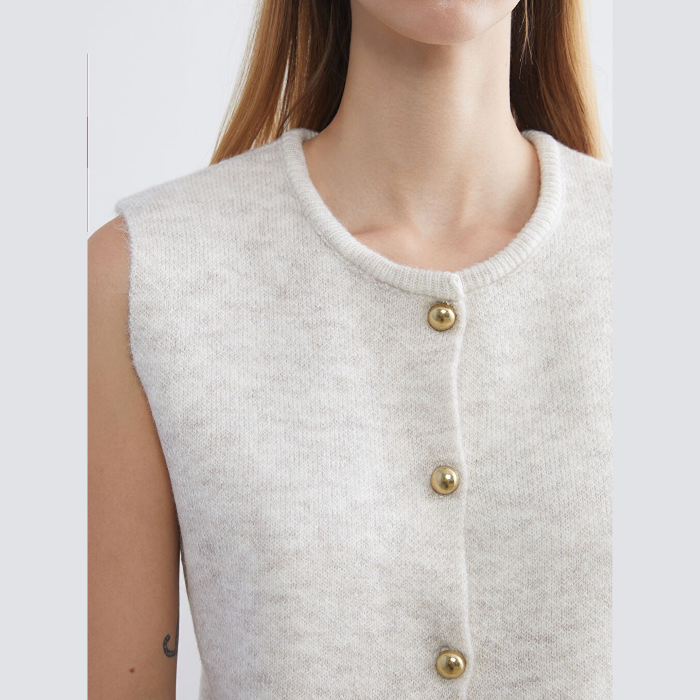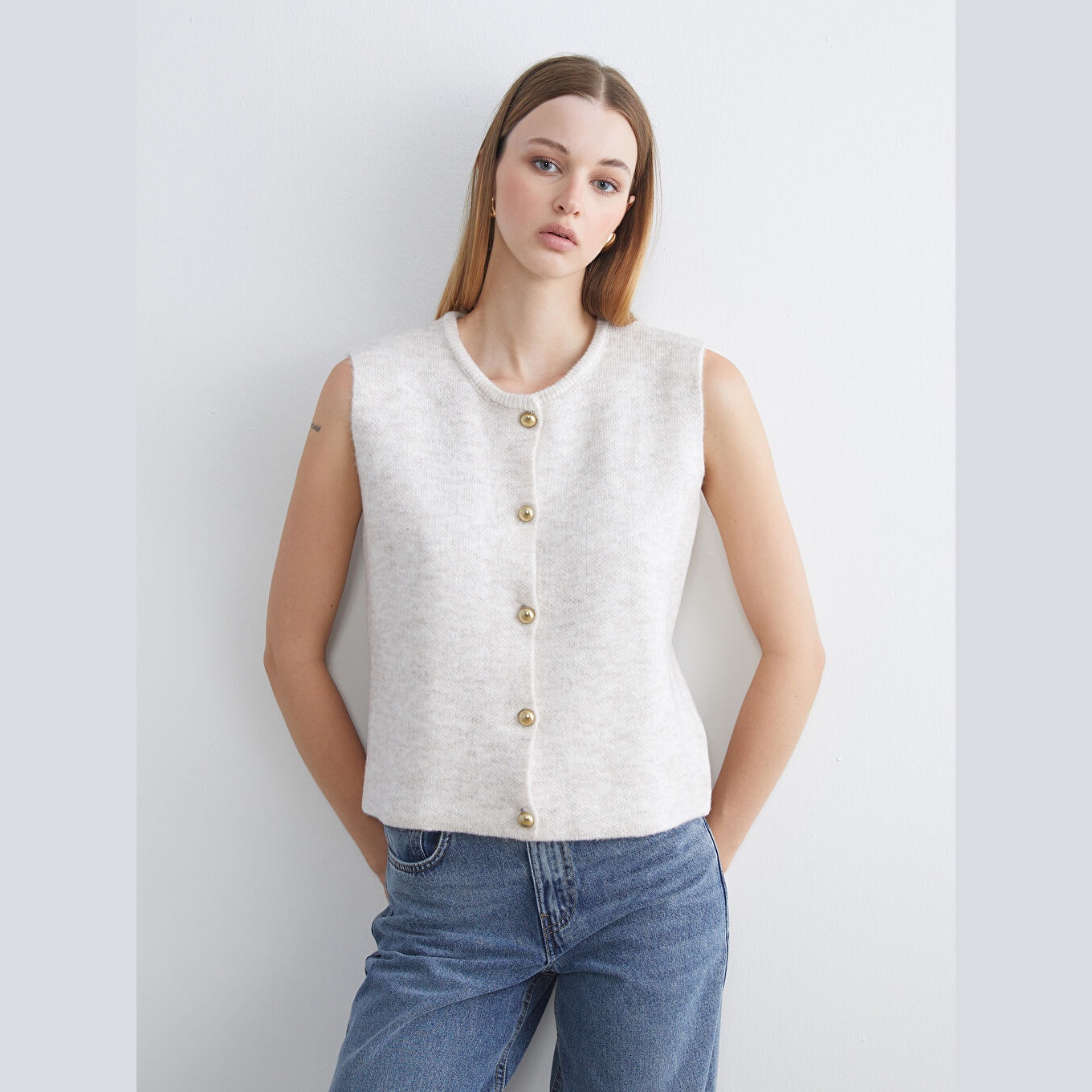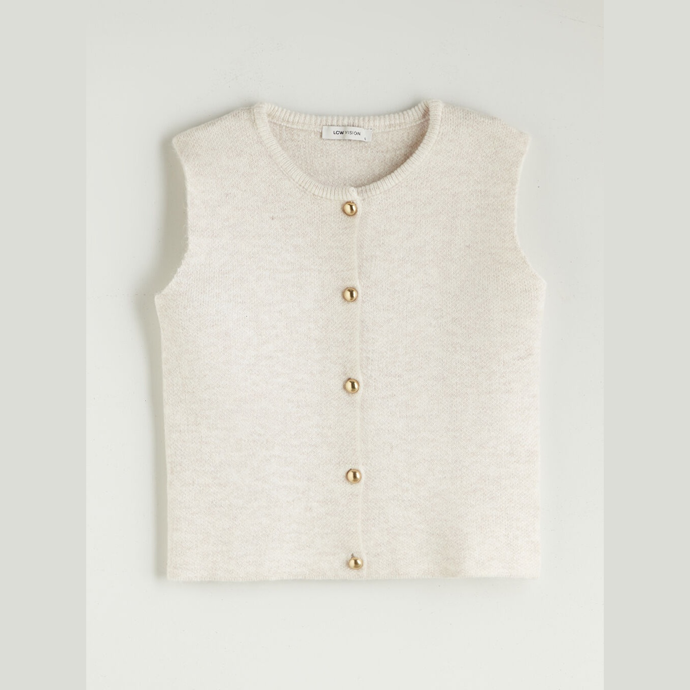 فيست تريكو بلون إكرو من مجموعة LCW Vision، تصميم بياقة دائرية (Bisiklet Yaka) كلاسيكية، قصة قياسية (Standart & Regular) تمنحك مظهرًا متوازنًا ومريحًا، خامة ناعمة من مزيج %78 أكريليك و%22 بوليستر، بدون أكمام، بسماكة متوسطة، بطول يُقاس من الكتف، مثالي للتنسيق مع القمصان أو البلوزات في الإطلالات اليومية أو العملية خلال الخريف والشتاء.