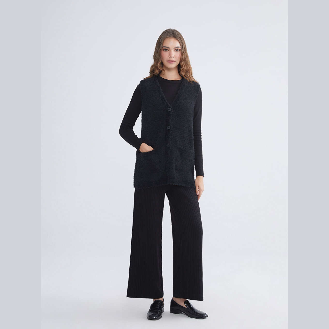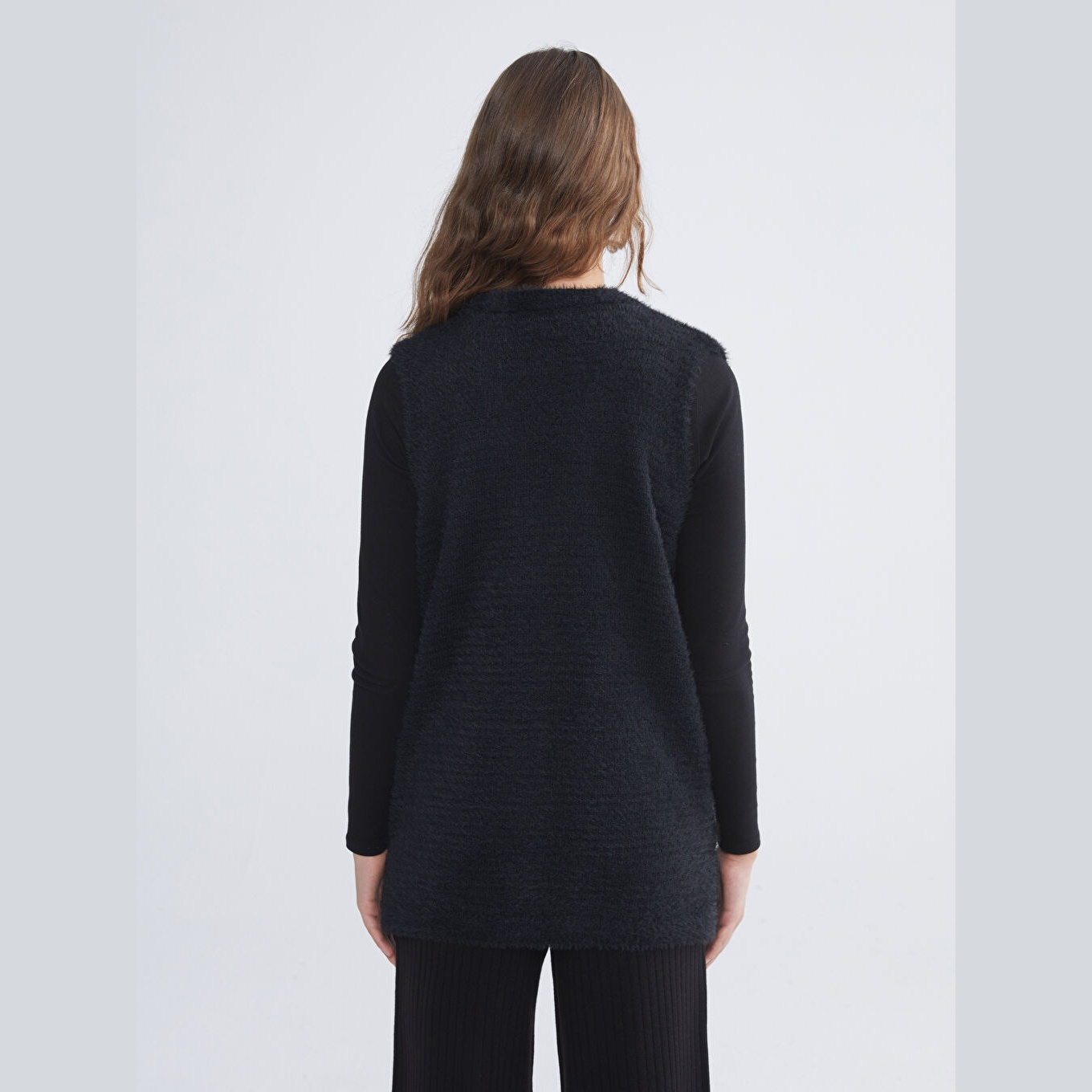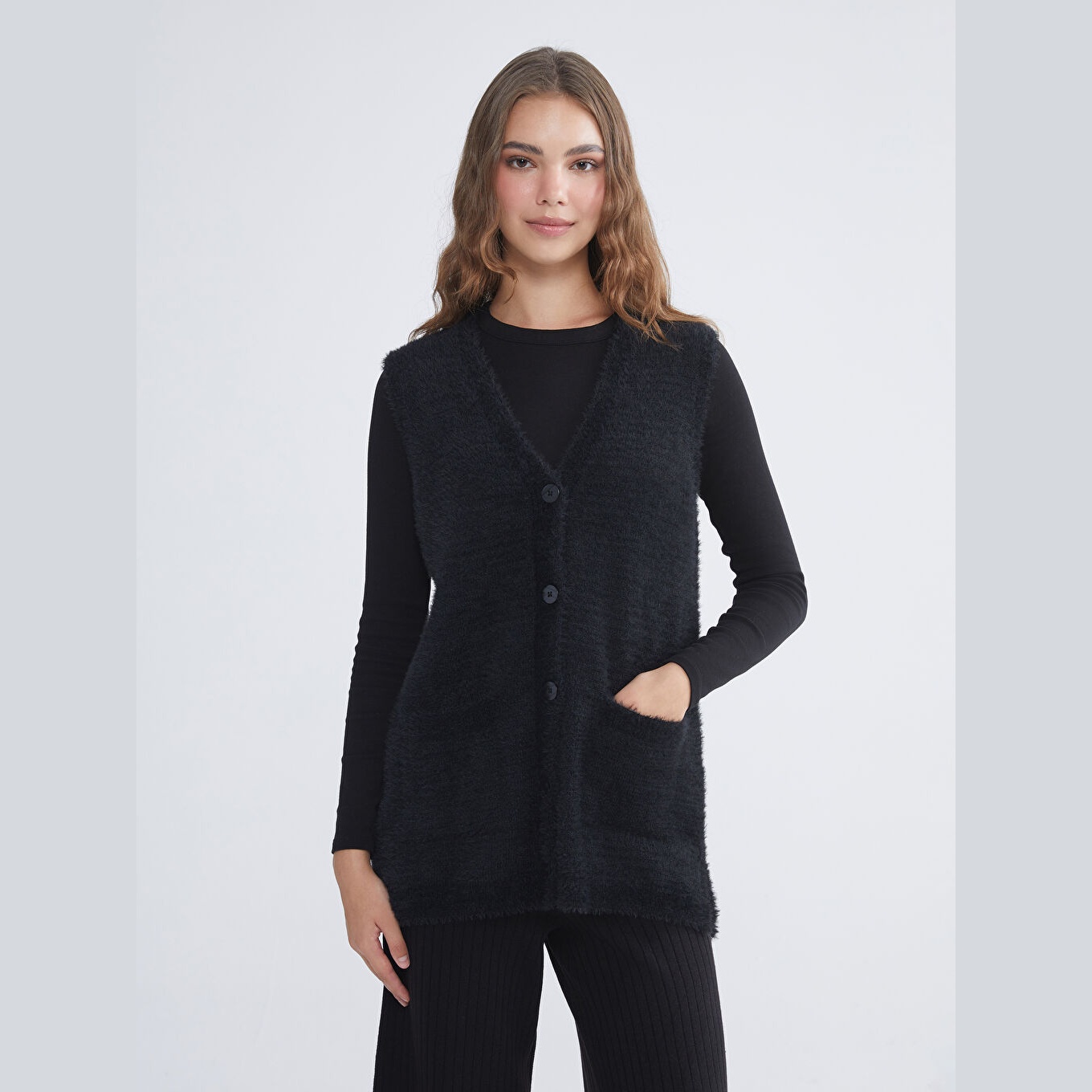 فيست شتوي بلون أسود من مجموعة LCW Grace Büyük Beden، تصميم بياقة V أنيقة تضيف لمسة أنثوية، قصة قياسية (Standart & Regular) تمنحك مظهرًا متوازنًا، خامة بيلوش ناعمة مصنوعة من مزيج %77 بوليستر و%23 أكريليك، بدون أكمام، بسماكة عالية، بطول يصل إلى الورك (Basen Boy)، مزوّد بأزرار أمامية (Düğmeli)، مثالي للإطلالات اليومية أو العملية في الشتاء ضمن تنسيقات الحجاب أو المقاسات الكبيرة.