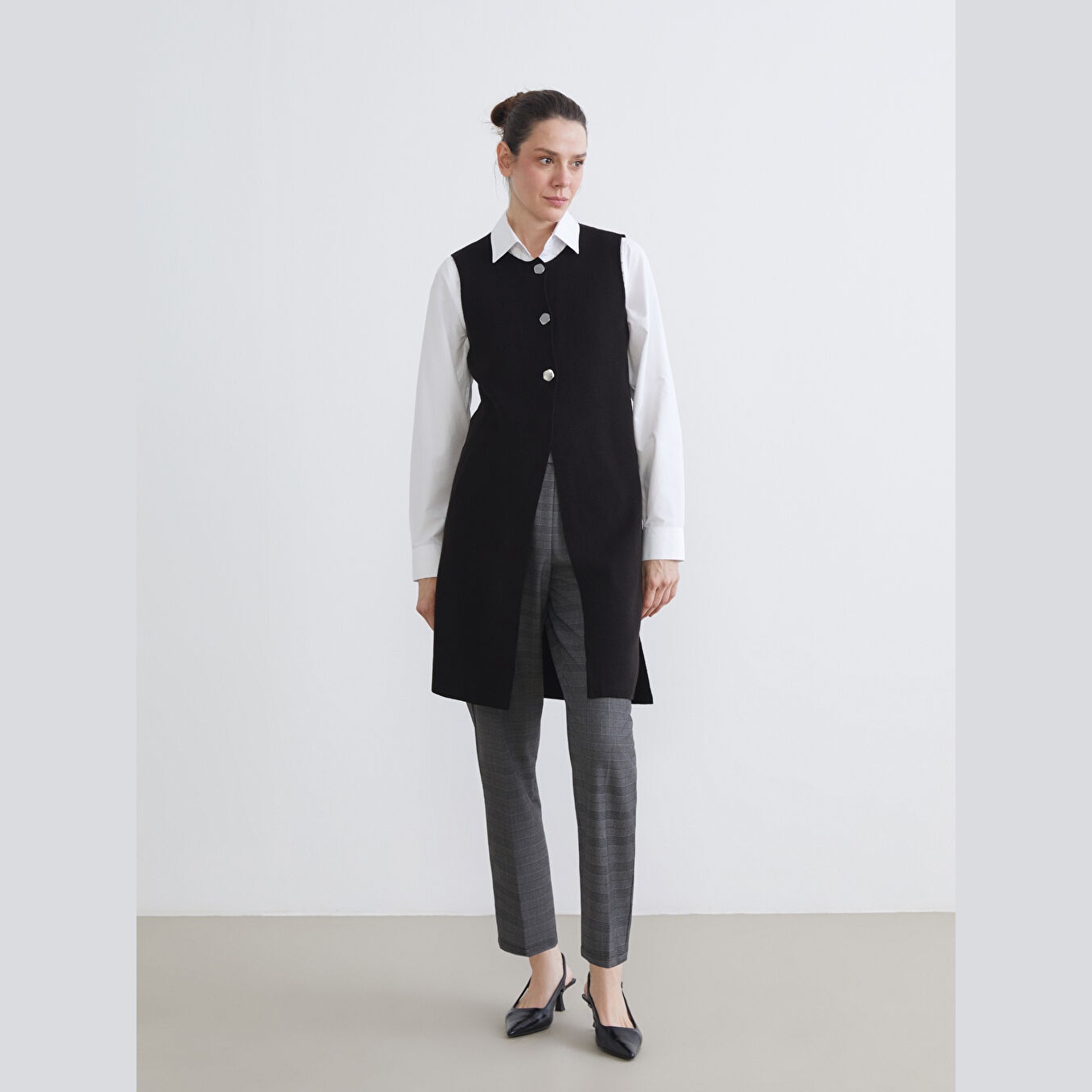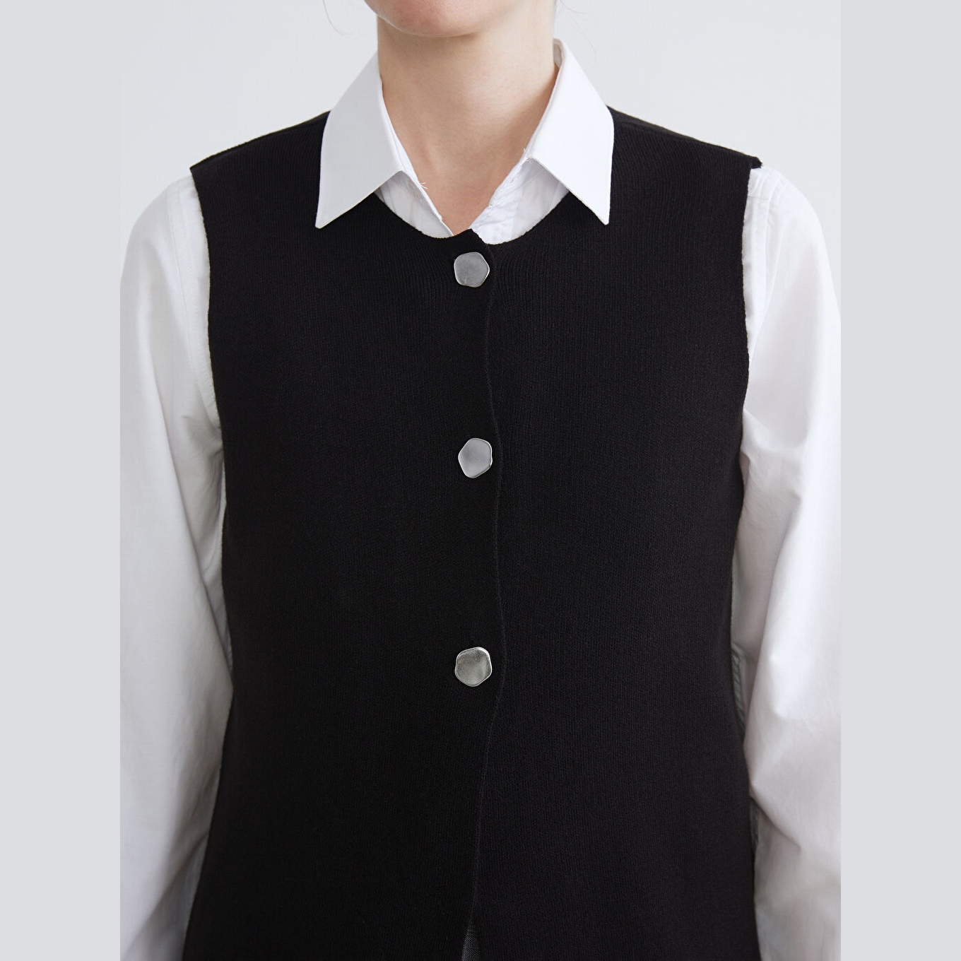 فيست تريكو بلون أسود من مجموعة LCW Grace Büyük Beden، تصميم بياقة دائرية (Bisiklet Yaka) كلاسيكية، مزوّد بأزرار أمامية (Düğmeli) تضيف لمسة أنيقة، قصة قياسية (Standart & Regular) تمنحك مظهرًا متوازنًا، خامة تريكو ناعمة من %100 أكريليك، بدون أكمام، بسماكة متوسطة، بطول يصل إلى الورك (Basen Boy)، مثالي للتنسيق مع القمصان أو البلوزات في الإطلالات اليومية أو العملية خلال الخريف والشتاء.