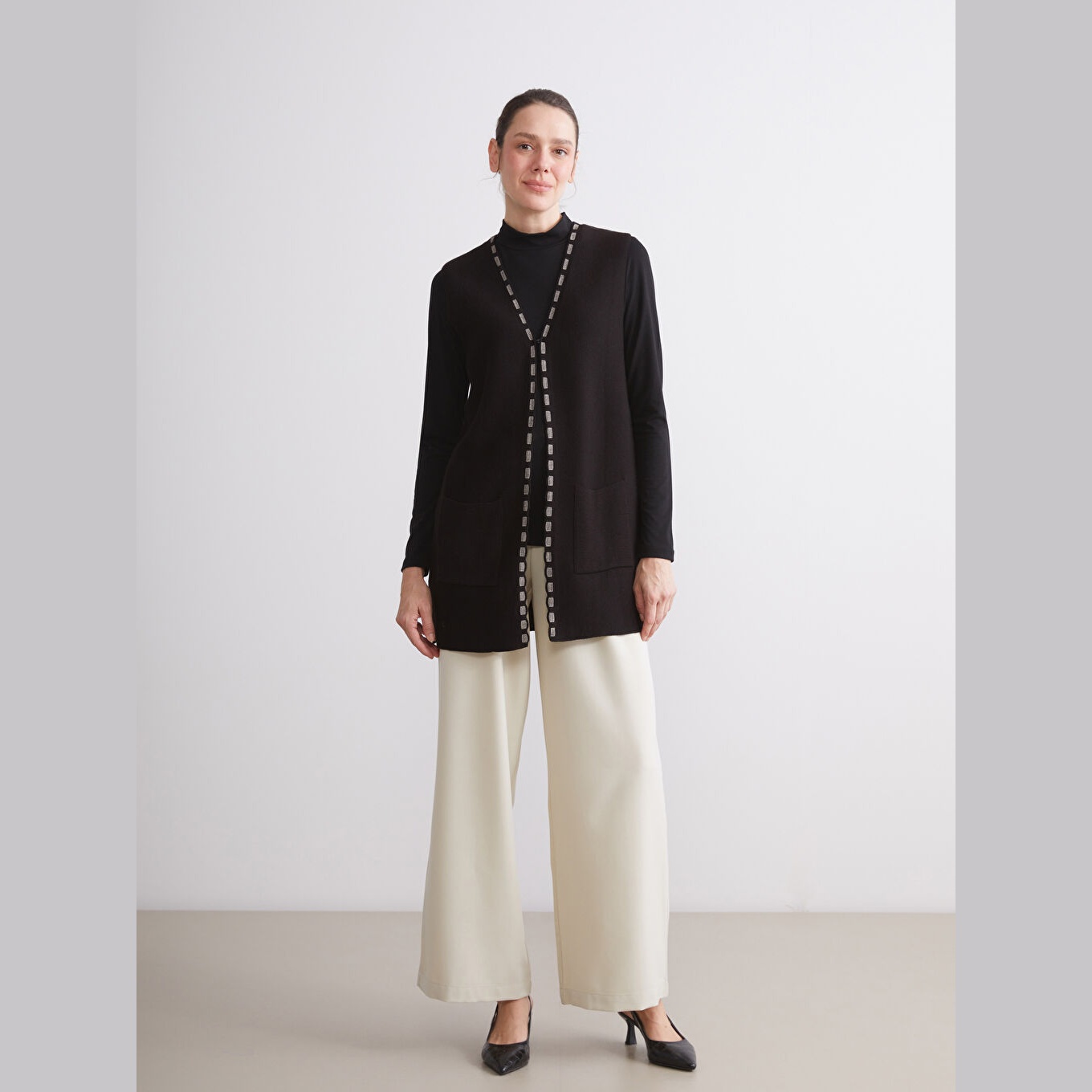 فيست نسائي من LCW Grace – أسود (تريكو بياقة V، نقشة ناعمة، قصة قياسية، طول ميدي، مثالي للإطلالات الخريفية والشتوية ضمن مجموعة المقاسات الكبيرة)