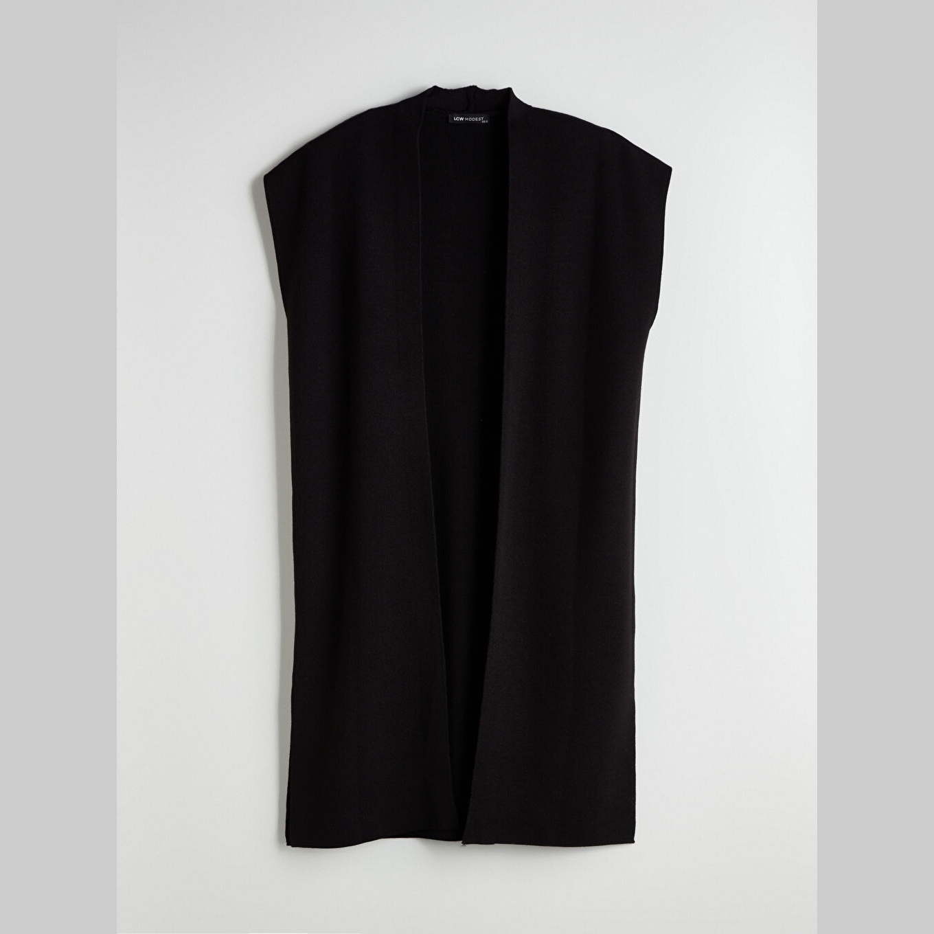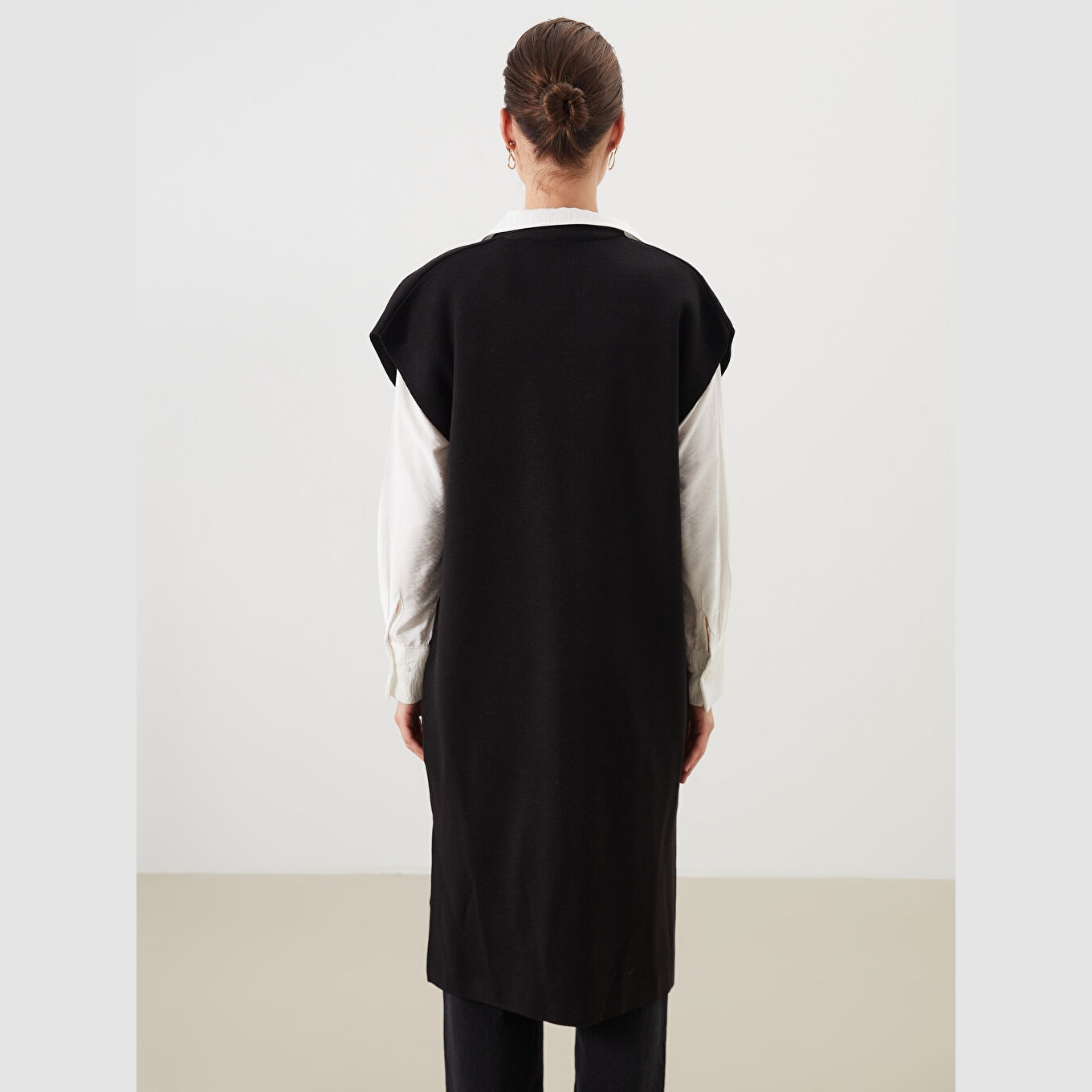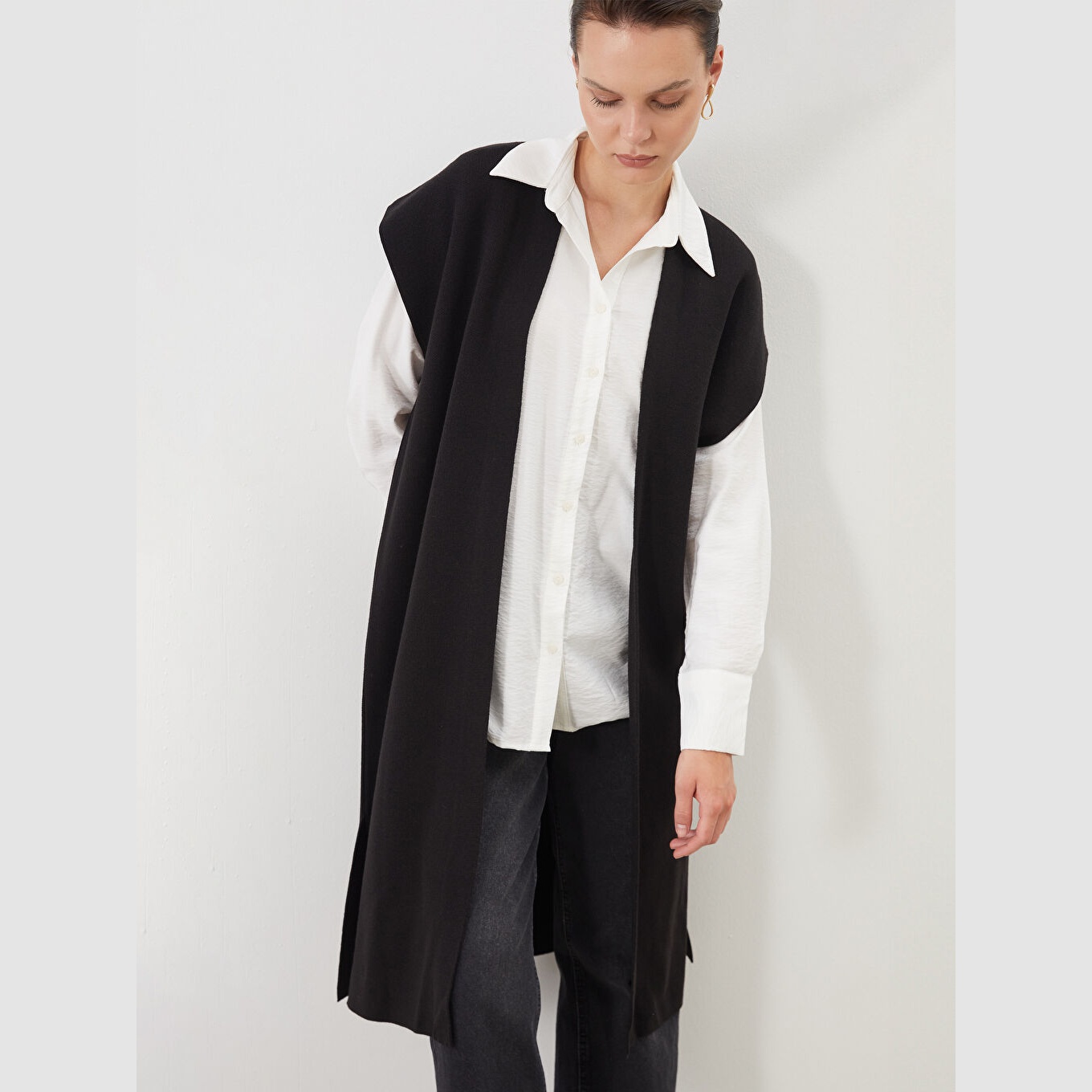 فيست نسائي شتوي – أسود (ياقة شال، خامة تريكو، قصة واسعة، تصميم محتشم بأكمام قصيرة، بطول متوسط)