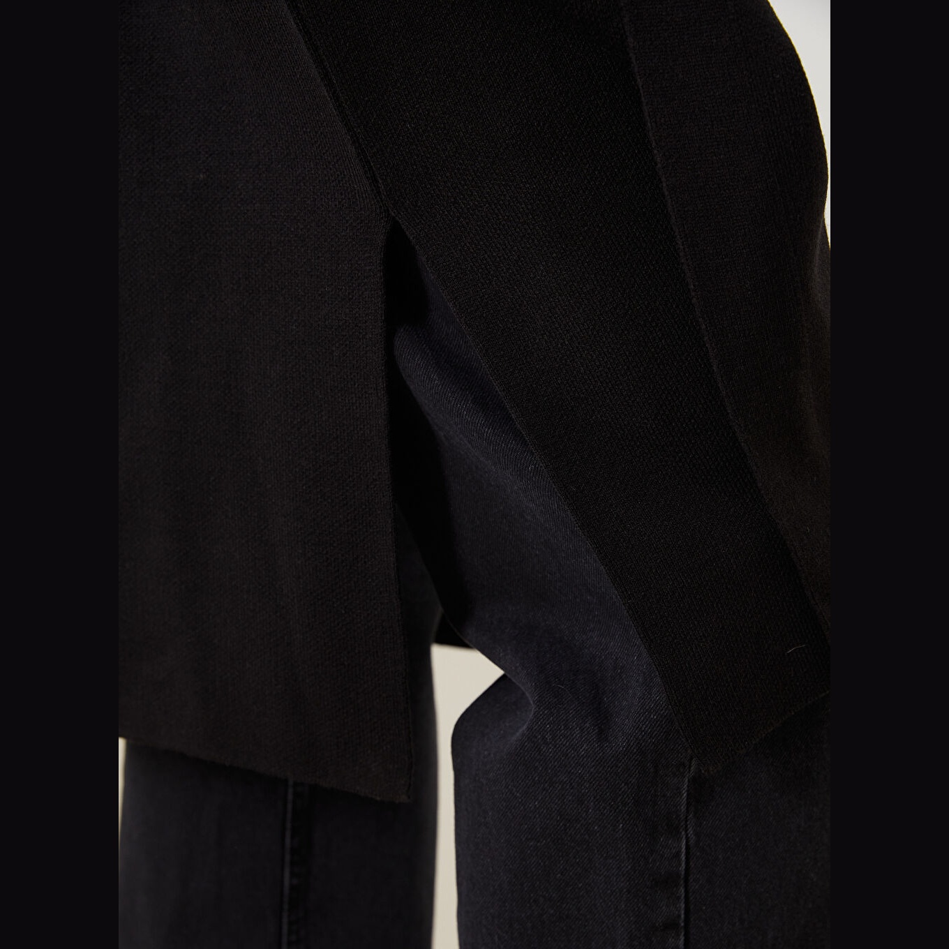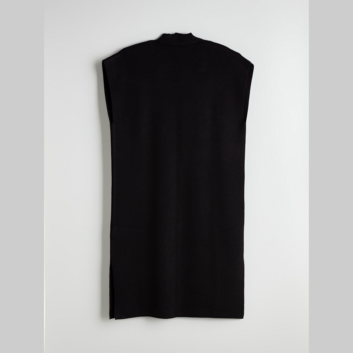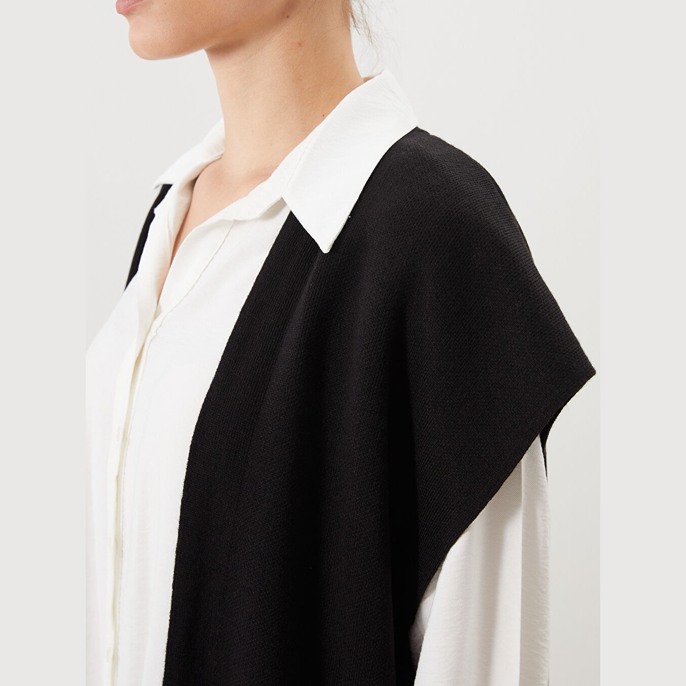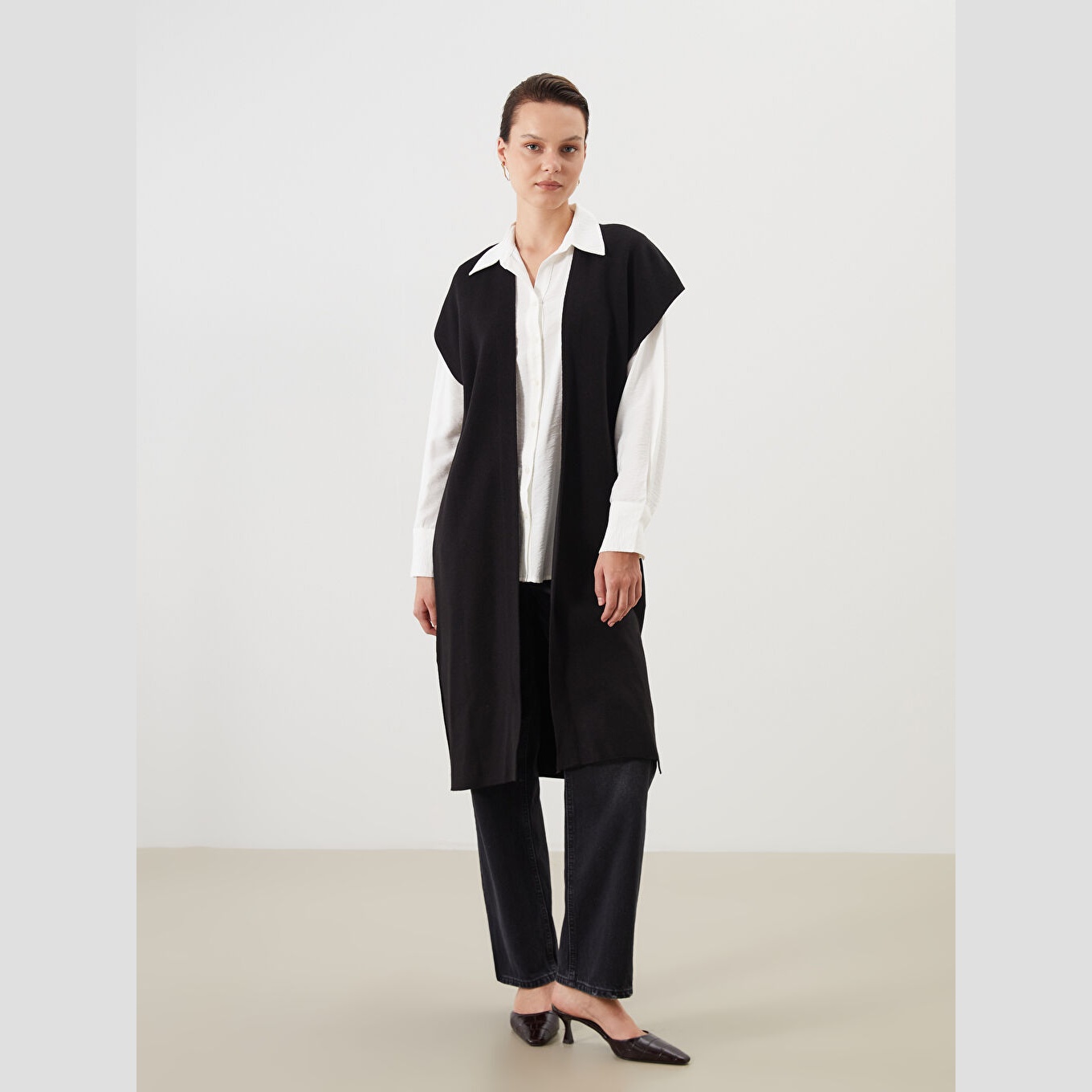 فيست نسائي شتوي – أسود (ياقة شال، خامة تريكو، قصة واسعة، تصميم محتشم بأكمام قصيرة، بطول متوسط)