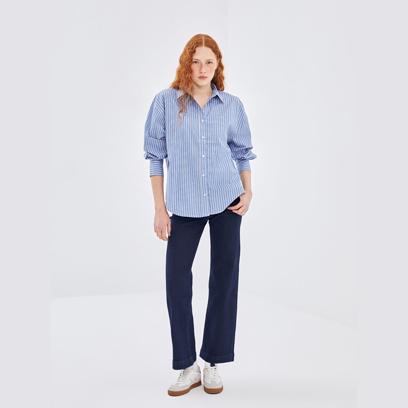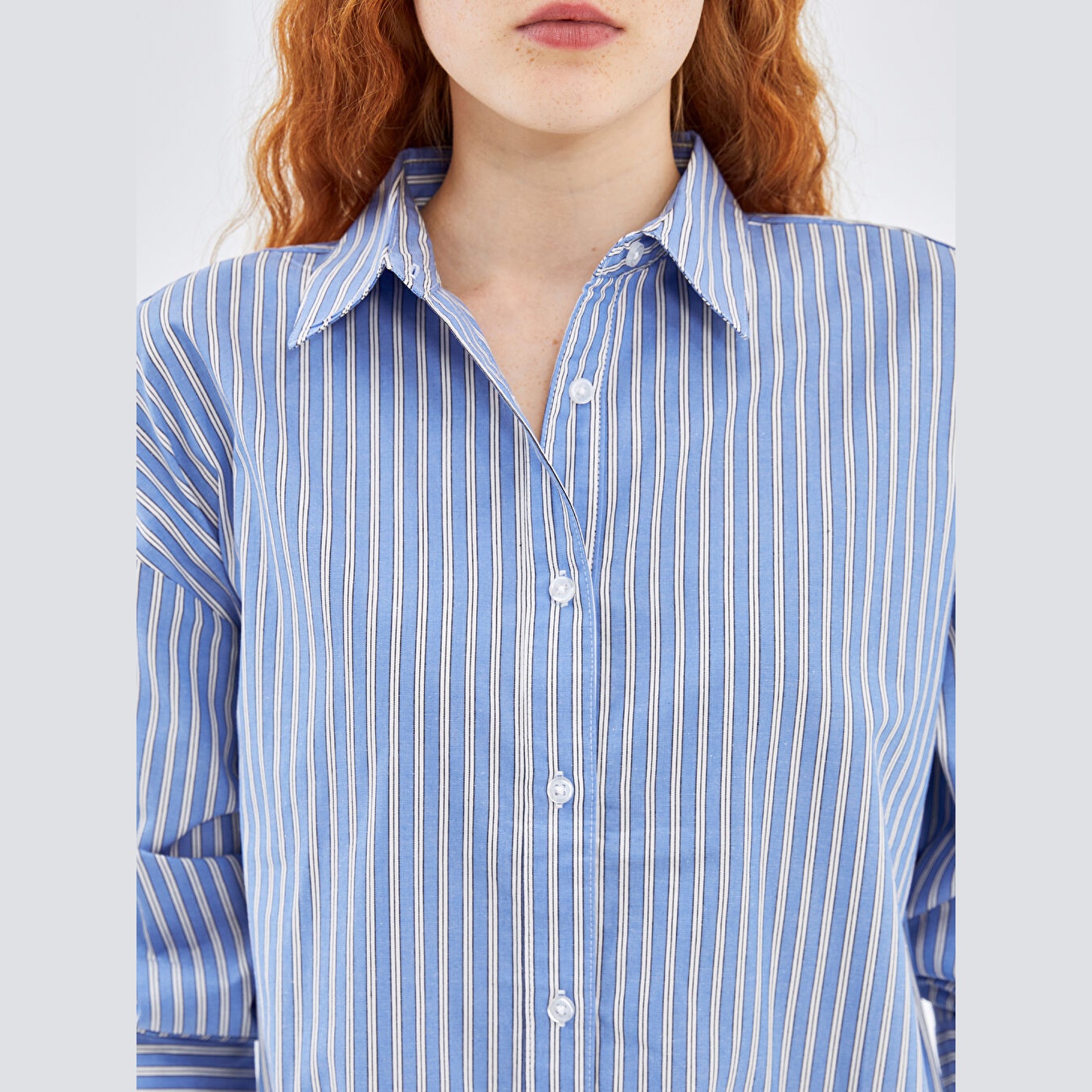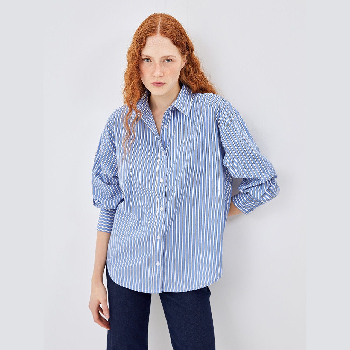 قميص نسائي واسع – أزرق مخطط (ياقة قميص، خامة بوبلين، قصة فضفاضة، تصميم عملي بأزرار، خامة خفيفة)