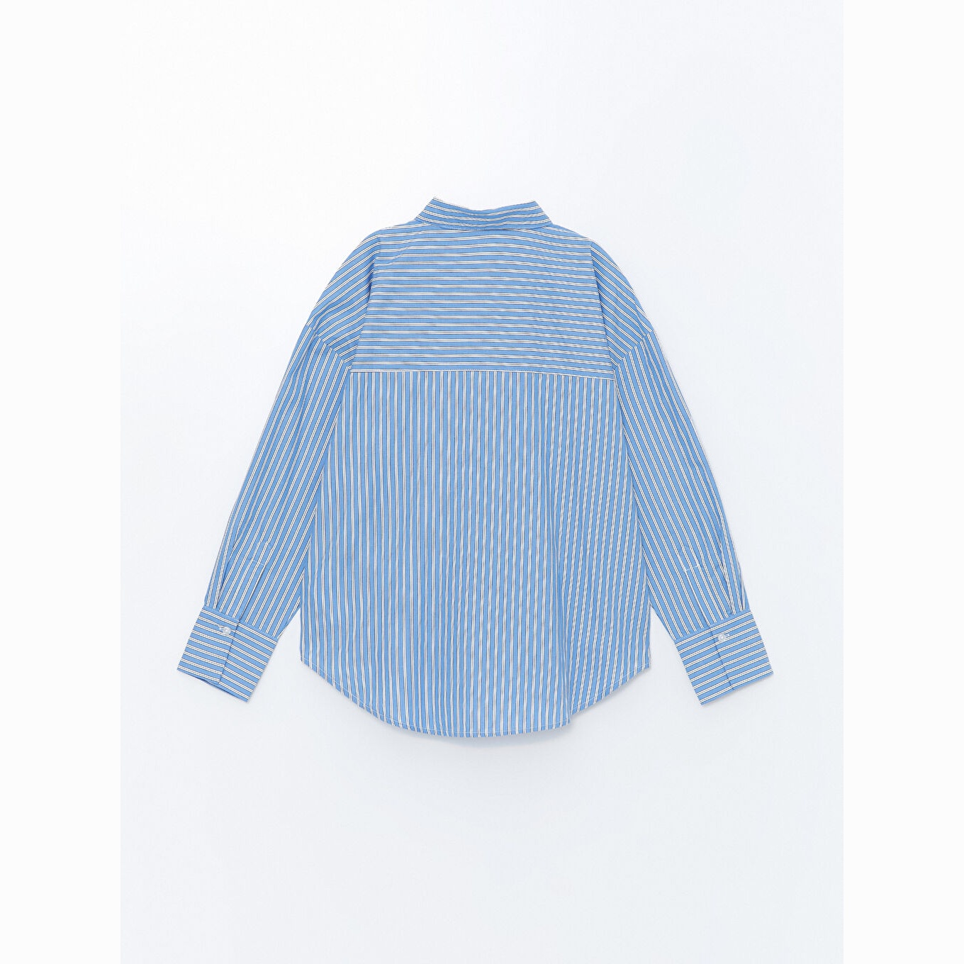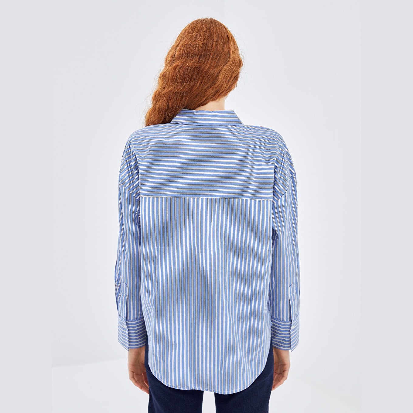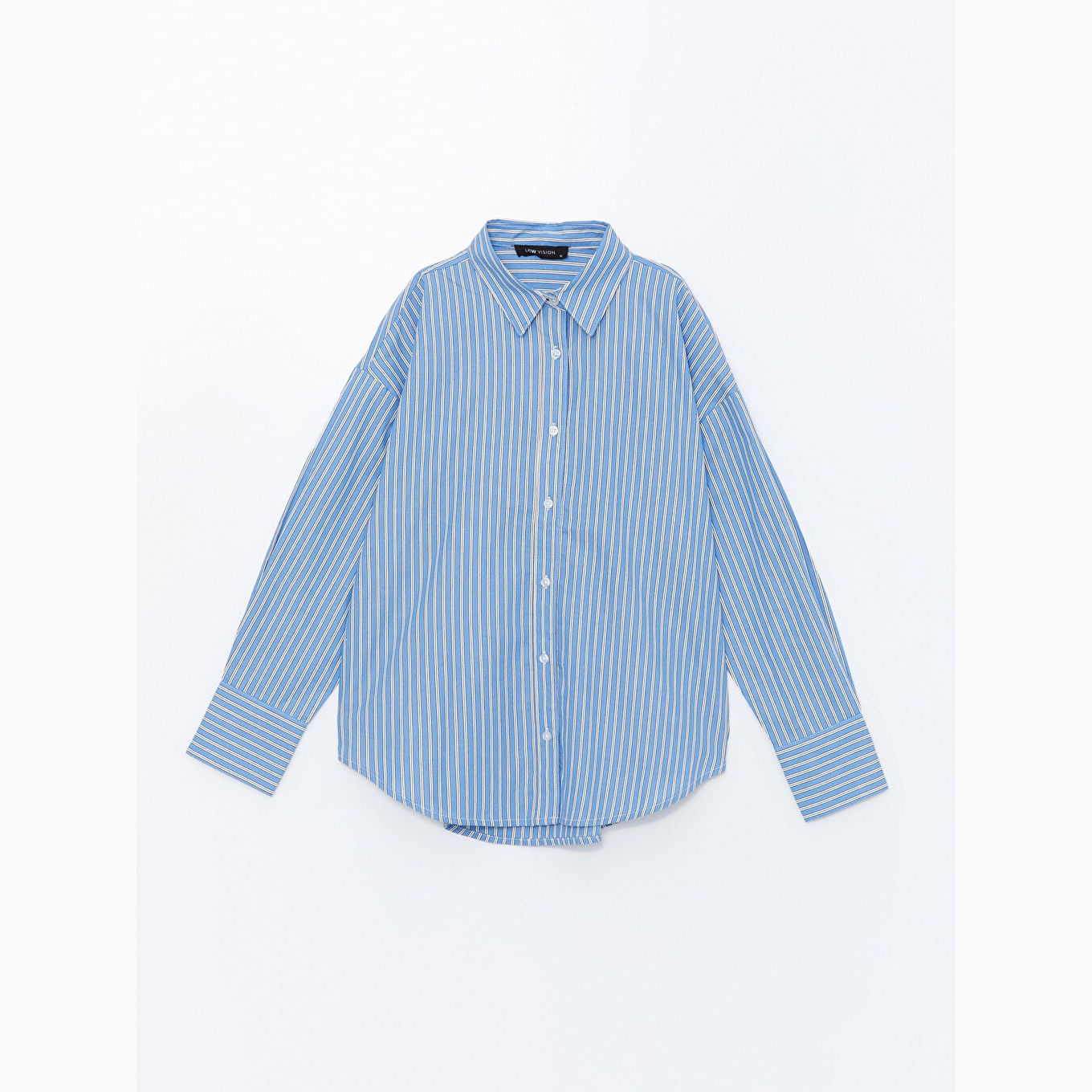 قميص نسائي واسع – أزرق مخطط (ياقة قميص، خامة بوبلين، قصة فضفاضة، تصميم عملي بأزرار، خامة خفيفة)