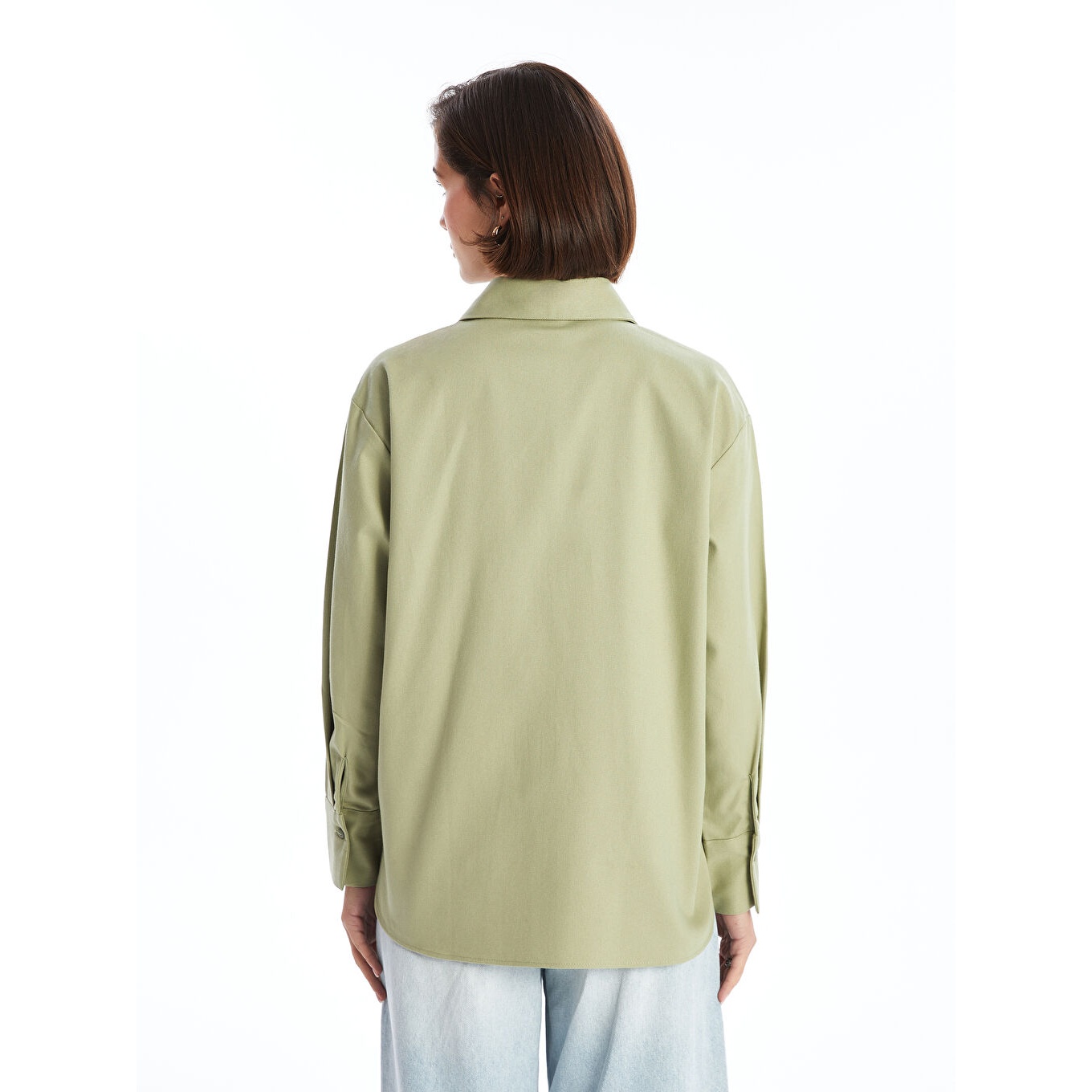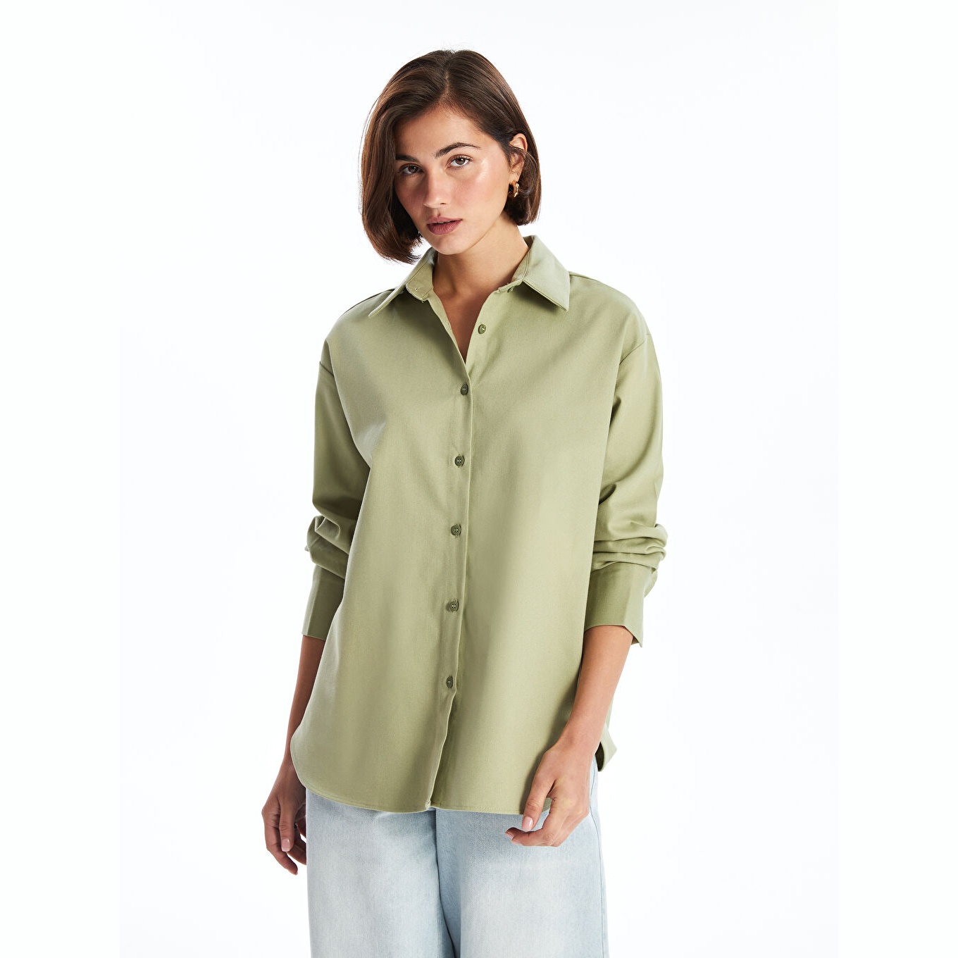 قميص نسائي واسع – أخضر سادة (ياقة قميص، خامة جبردين، قصة فضفاضة، تصميم عملي بأزرار، بطول الورك)