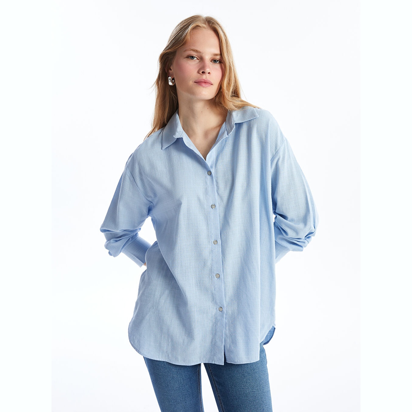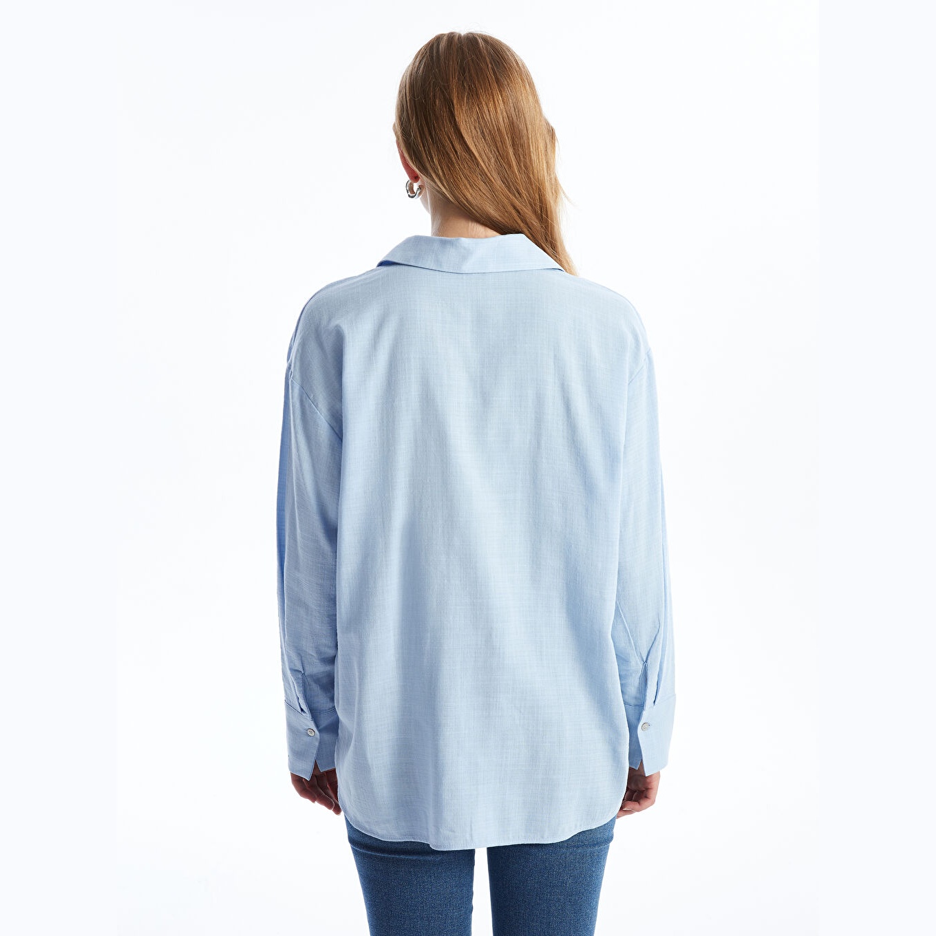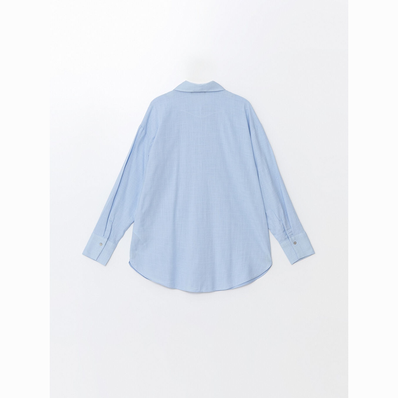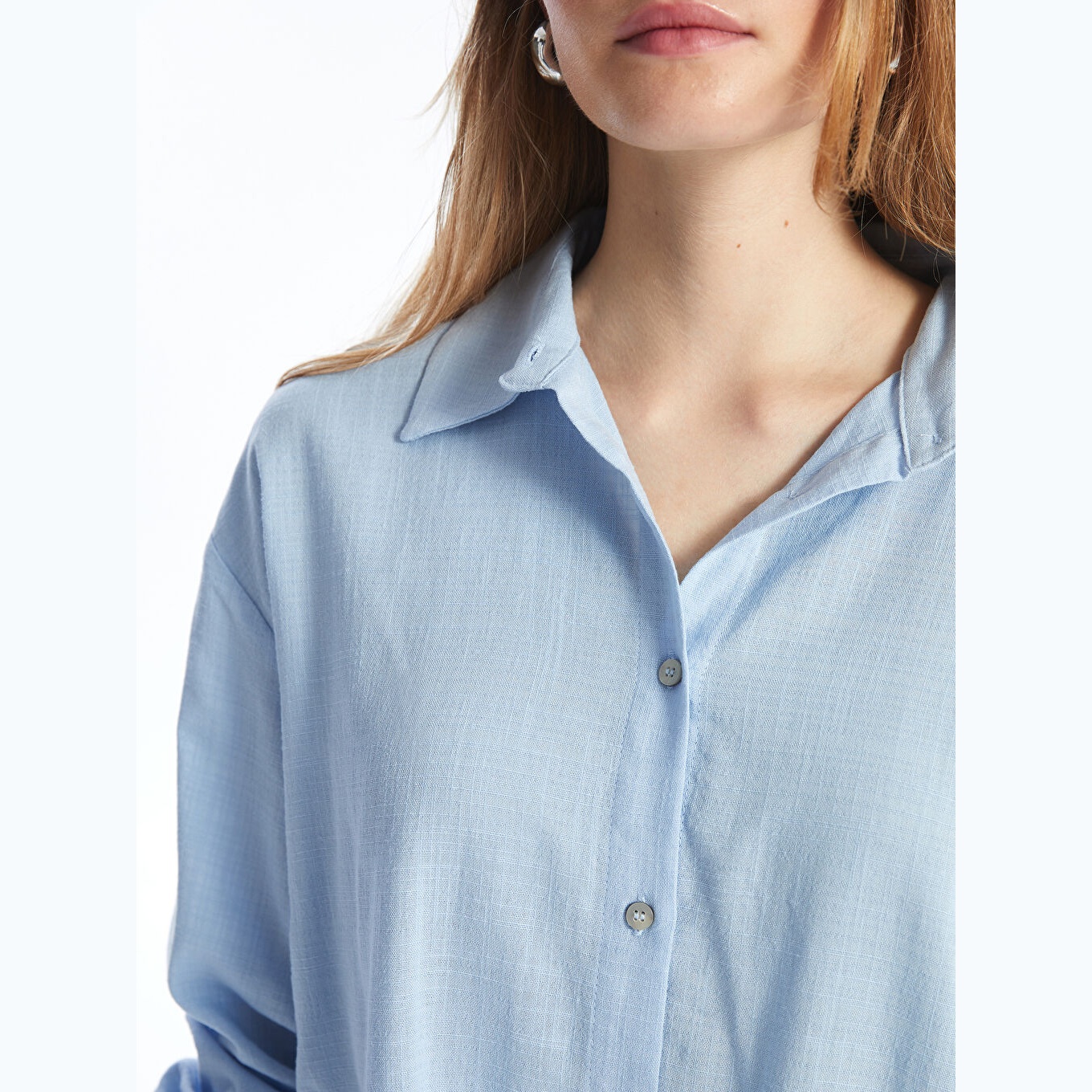 قميص نسائي واسع – أزرق سادة (ياقة قميص، خامة بنية، قصة فضفاضة، تصميم عملي بأزرار، بطول الورك)