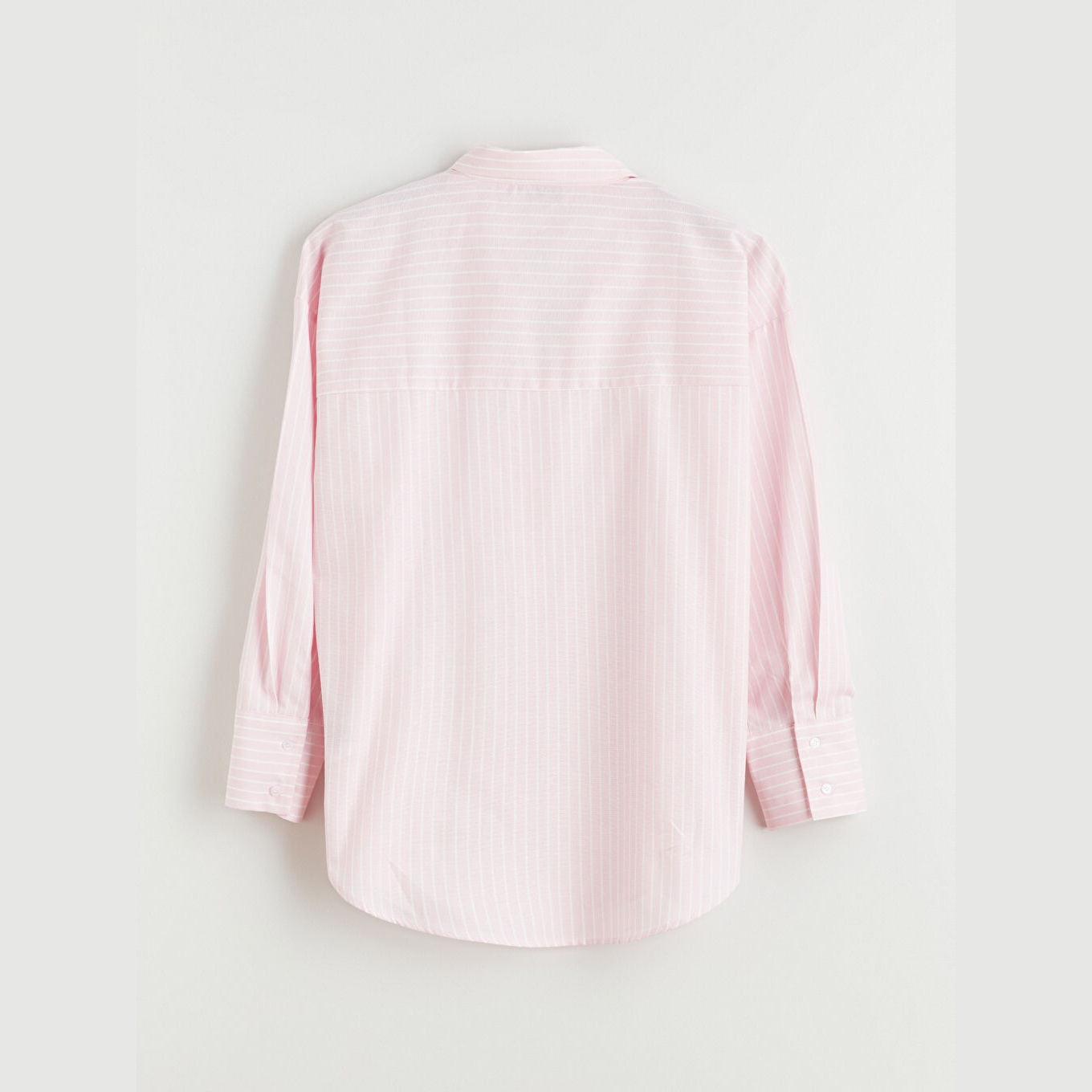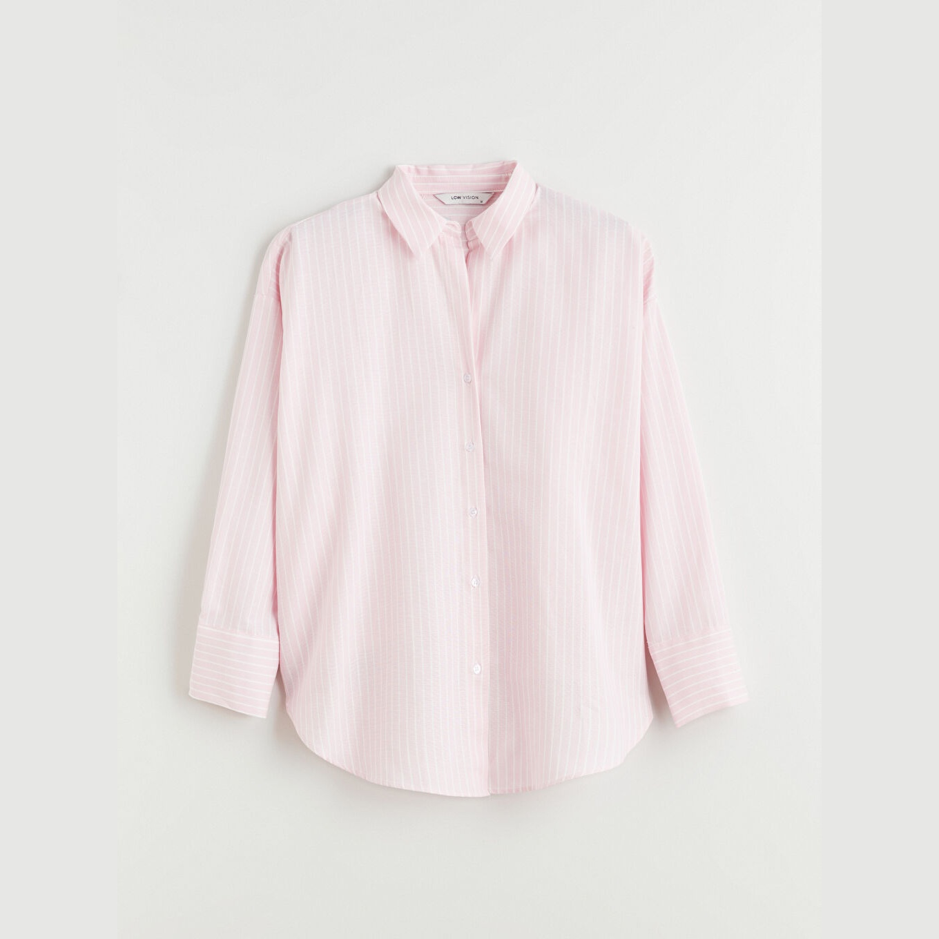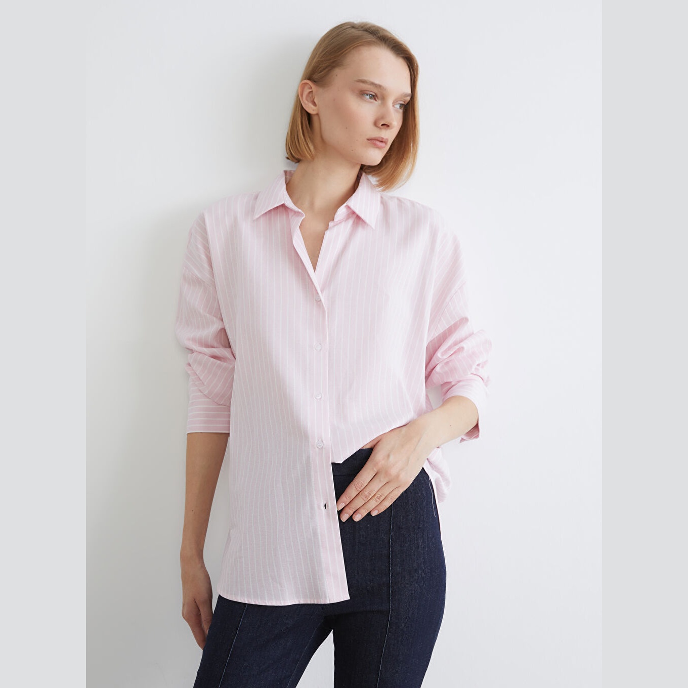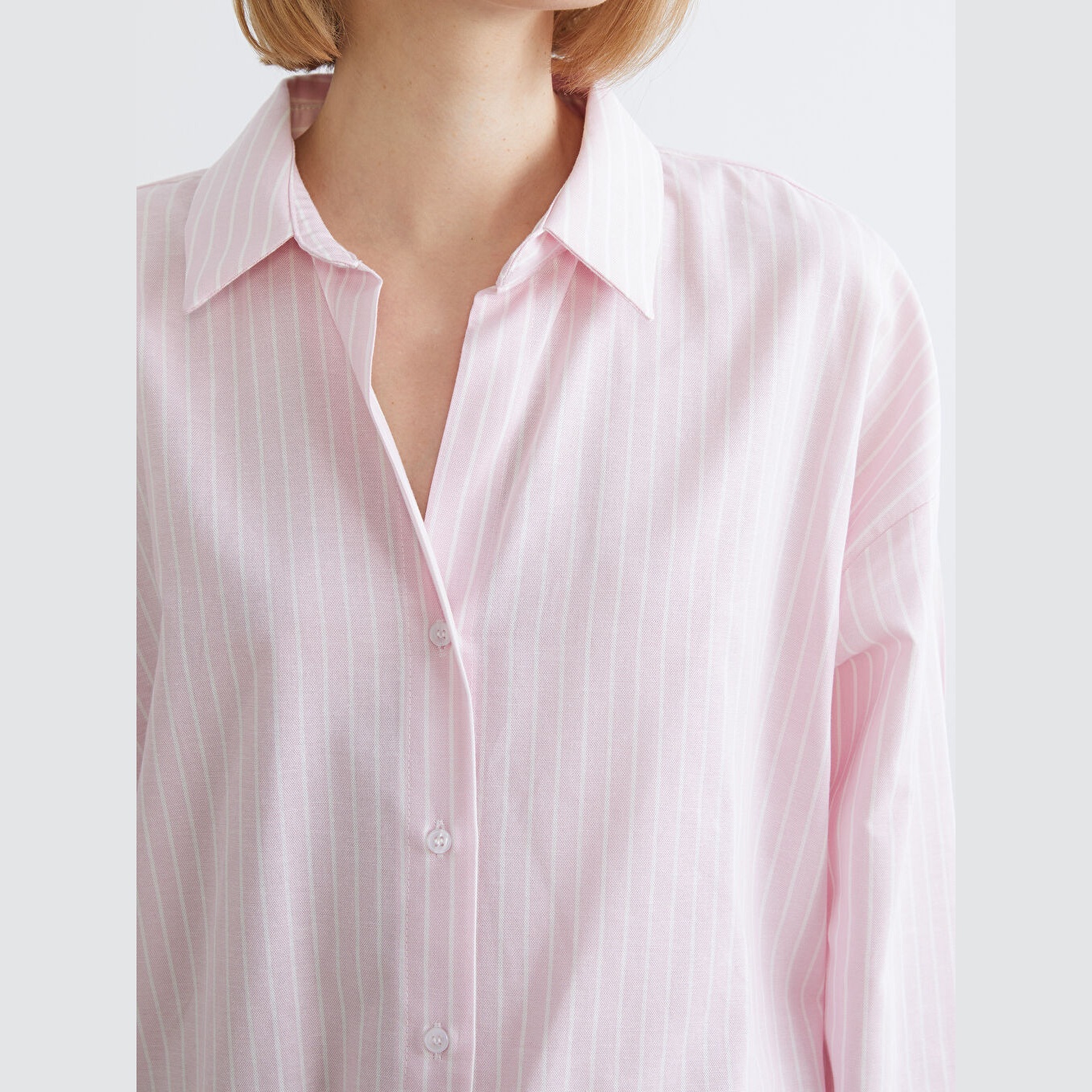 قميص نسائي واسع – وردي مخطط (ياقة قميص، خامة جاباردين، قصة فضفاضة، تصميم عملي بأزرار، بطول الورك)