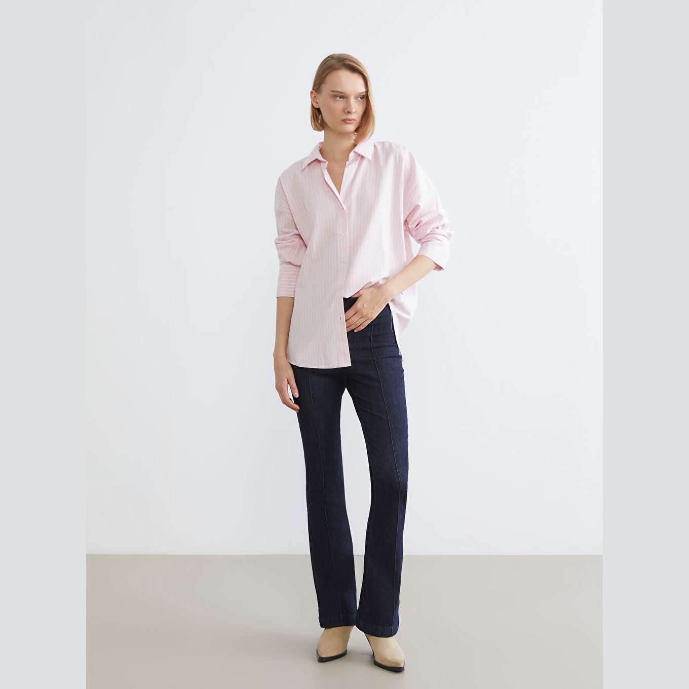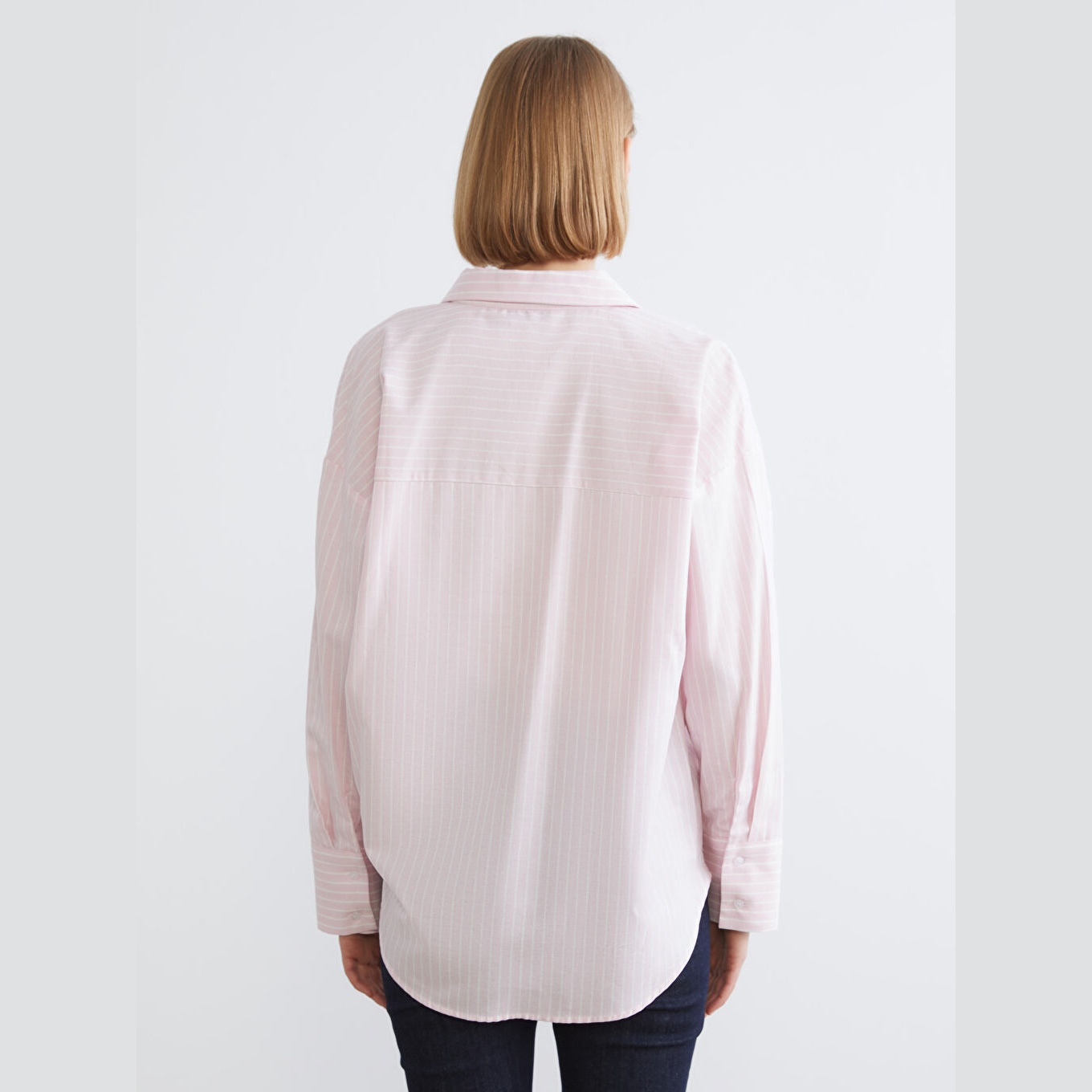 قميص عملي بلون وردي بنقشة خطوط ناعمة من مجموعة LCW Vision، يتميز بياقة قميص تقليدية تضيف لمسة رسمية ناعمة، وقصة واسعة (Oversize Fit) تمنحك مظهرًا عصريًا ومريحًا. مصنوع من خامة جاباردين قطنية 100%، بأكمام طويلة، بسماكة متوسطة، بطول يصل إلى الورك، ويُغلق بأزرار أمامية، مثالي للتنسيق مع البنطال القماشي أو الجينز في الإطلالات اليومية أو العملية.