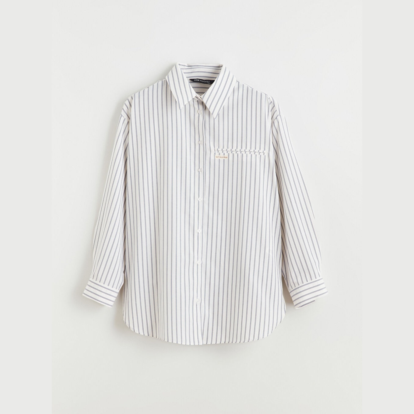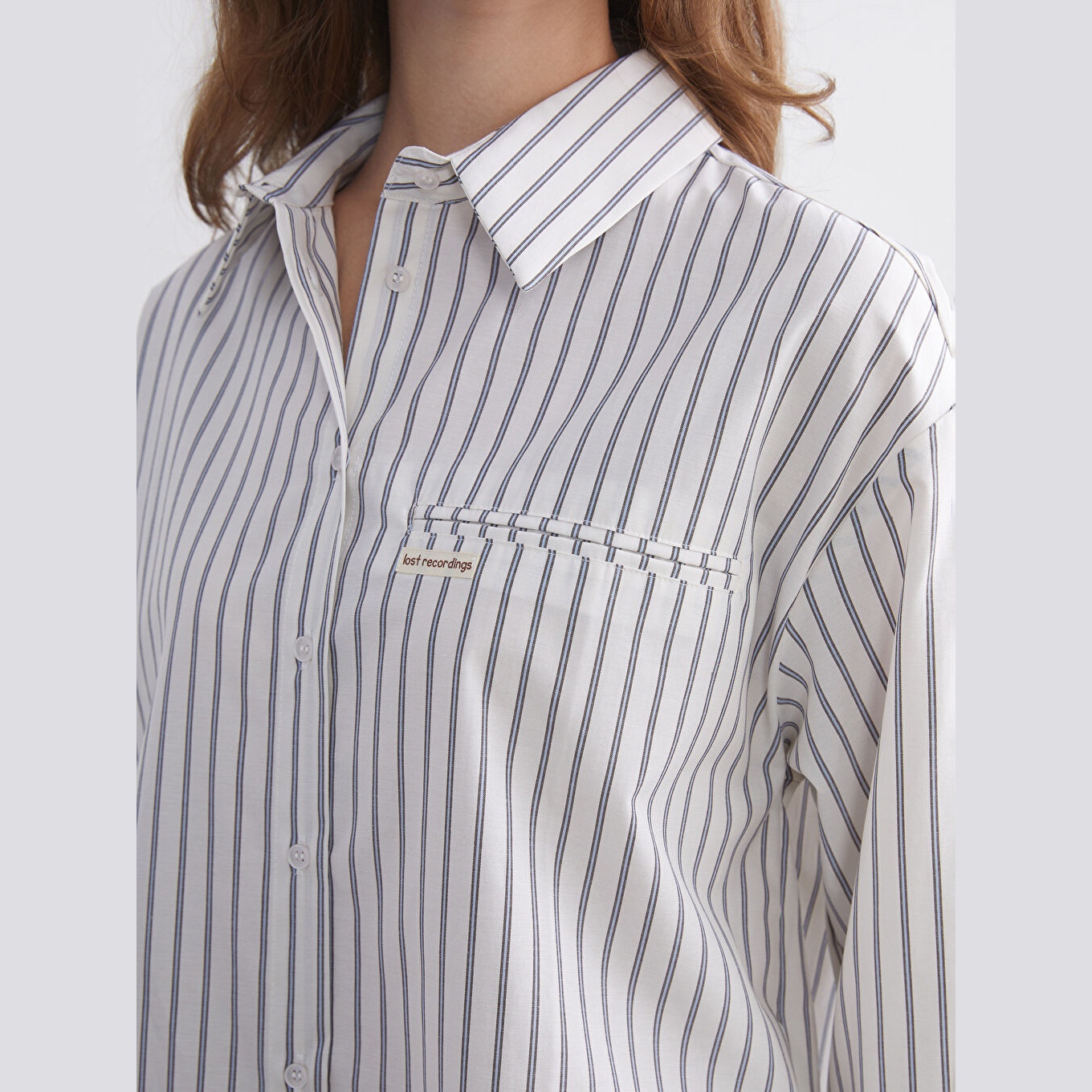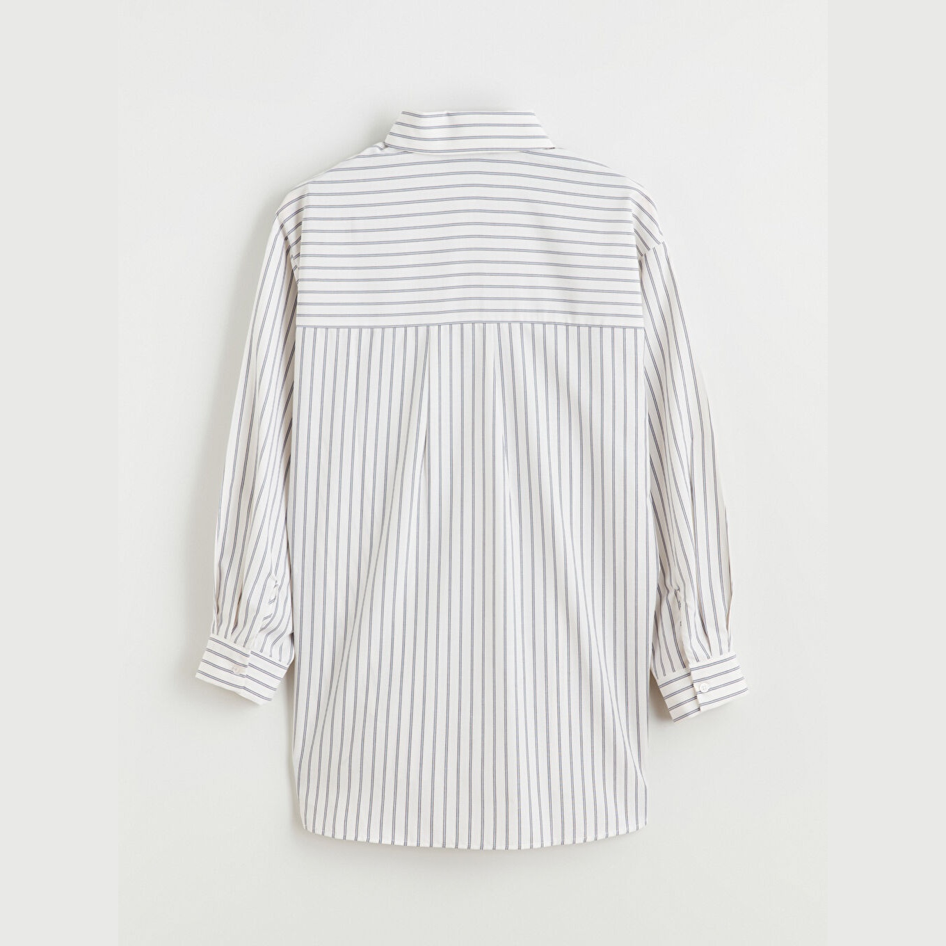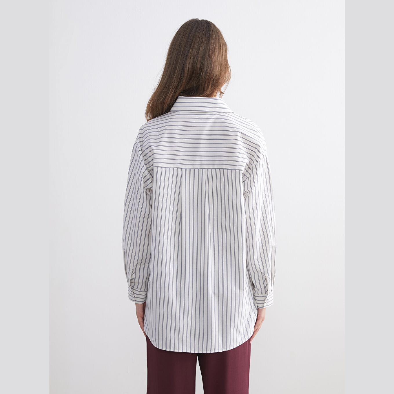 تونيك قميص نسائي واسع مخطط – أزرق (ياقة قميص، خامة بوبلين، قصة أوفرسايز، تصميم عملي بأزرار، بطول الورك)