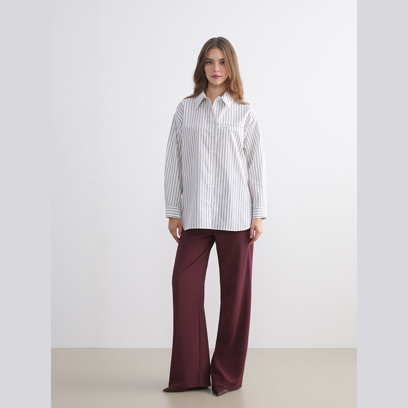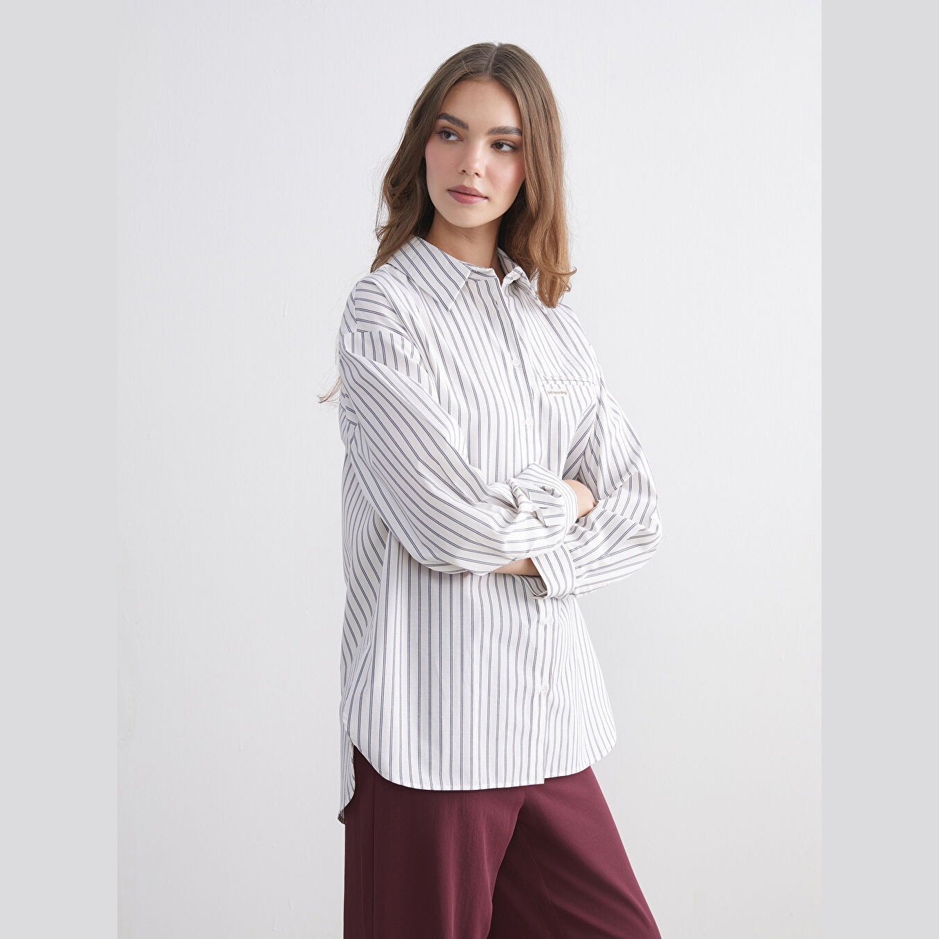 تونيك عملي بلون أزرق مزين بخطوط ناعمة من مجموعة LCW Modest، يتميز بياقة قميص تقليدية تضيف لمسة رسمية ناعمة، وقصة أوفرسايز (Oversize Fit) تمنحك مظهرًا عصريًا ومريحًا. مصنوع من خامة بوبلين خفيفة بتركيبة %55 قطن، %45 بوليستر، بأكمام طويلة، بسماكة خفيفة، بطول يصل إلى الورك، ويُغلق بأزرار أمامية، مثالي للتنسيق مع البنطال القماشي أو الجينز في الإطلالات اليومية أو العملية.
