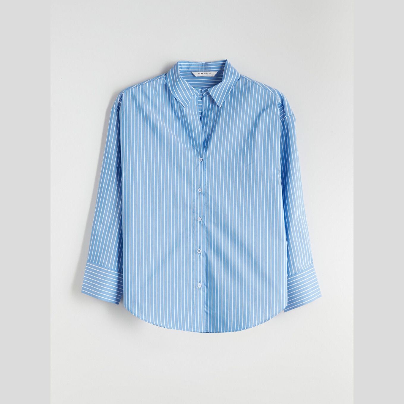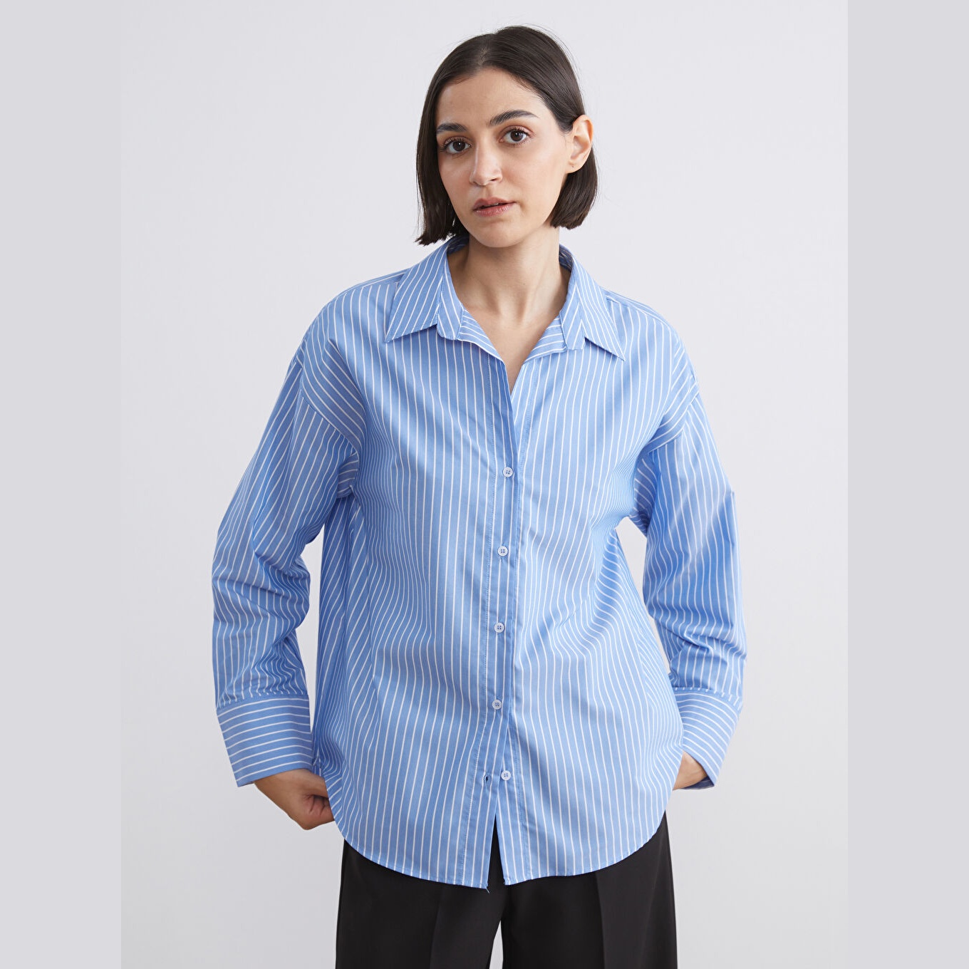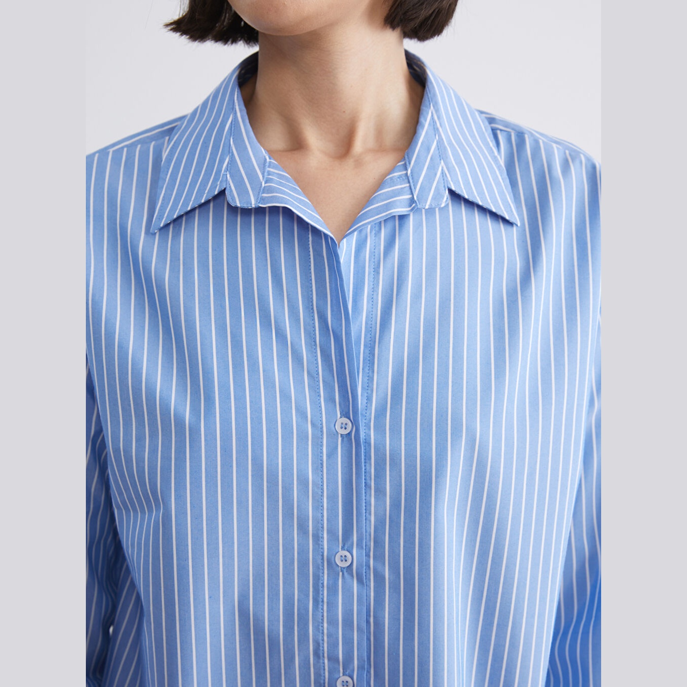 قميص نسائي واسع مخطط – أزرق (ياقة قميص، خامة بوبلين، قصة أوفرسايز، تصميم عملي بأزرار، بطول الورك)