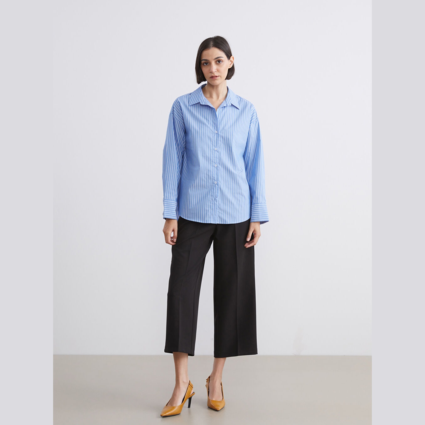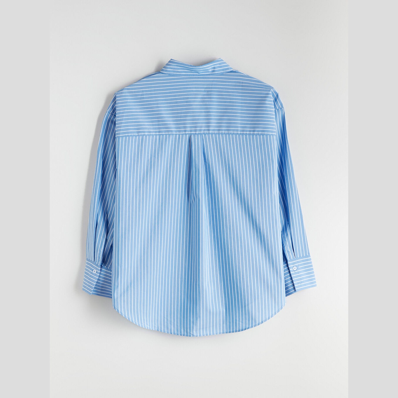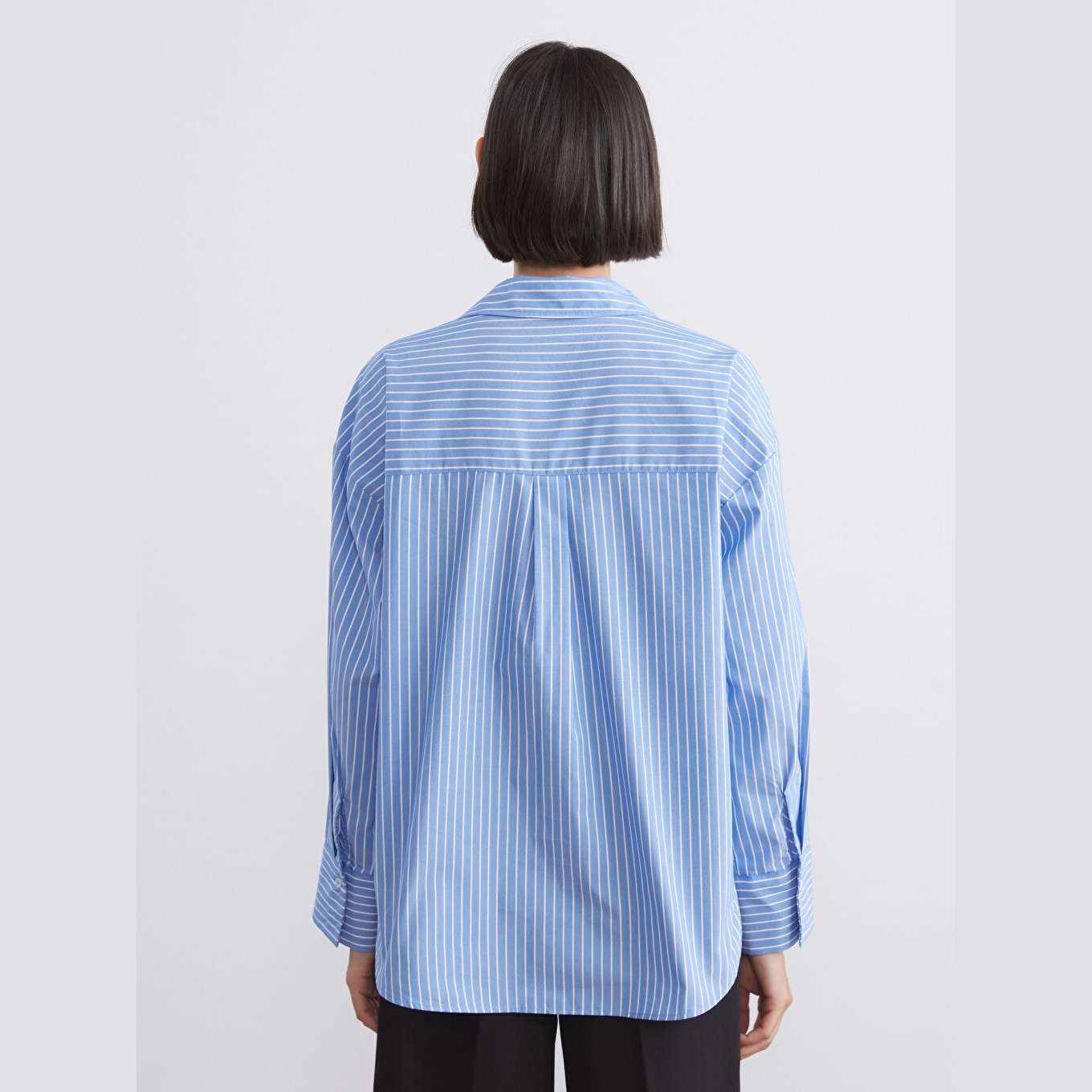قميص نسائي واسع مخطط – أزرق (ياقة قميص، خامة بوبلين، قصة أوفرسايز، تصميم عملي بأزرار، بطول الورك)