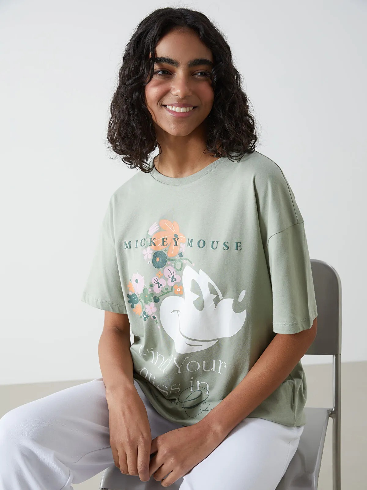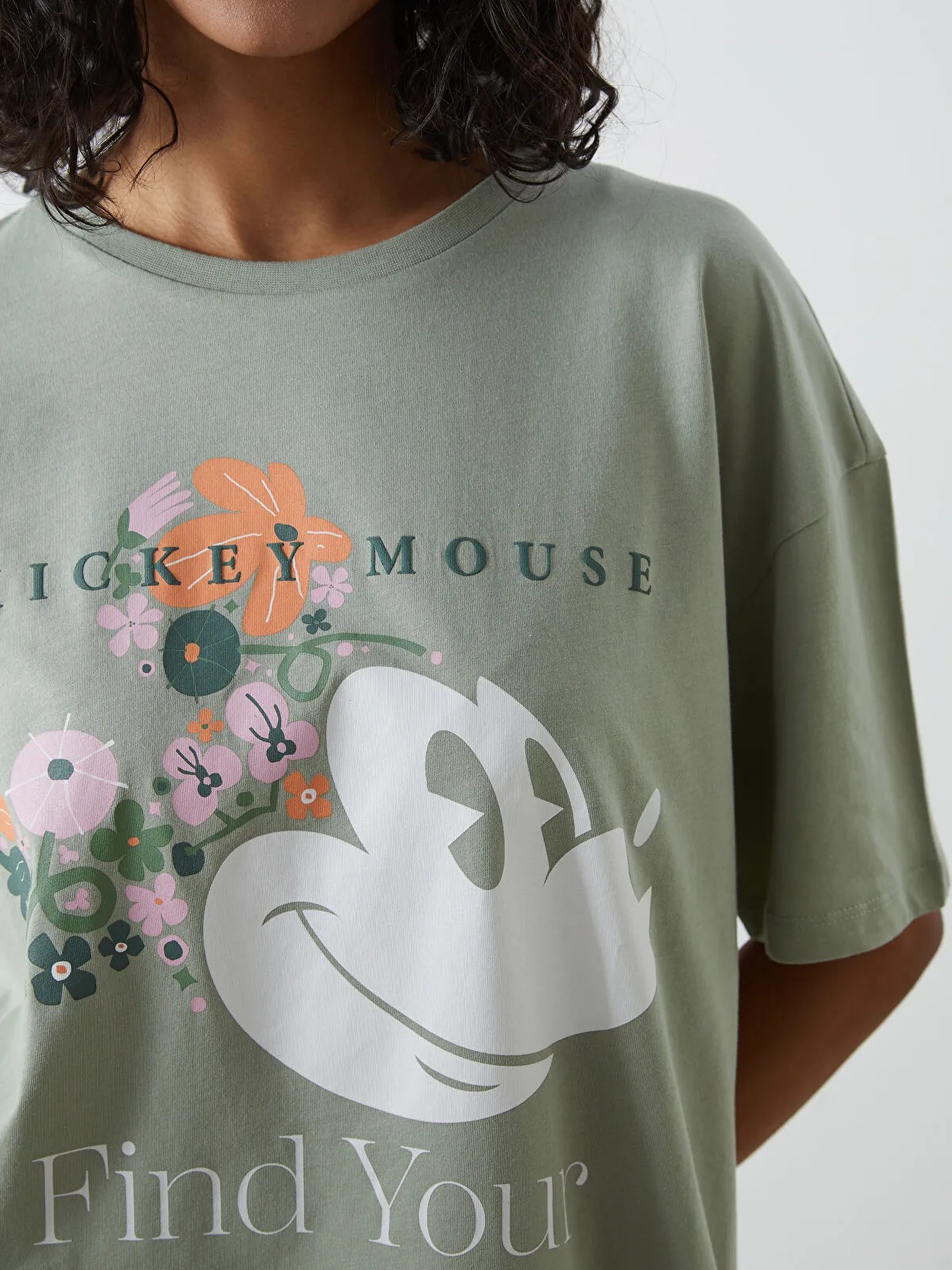 تيشيرت نسائي بلون أخضر حيوي، بياقة دائرية قصيرة وأكمام قصيرة، مزين بطبعة مرخصة لشخصيات Mickey Mouse & Friends تضيف لمسة مرحة وشبابية إلى الطقم. تصميم Loose Fit يمنح حرية حركة وراحة طوال اليوم، مثالي للإطلالة الكاجوال المريحة والعصرية.