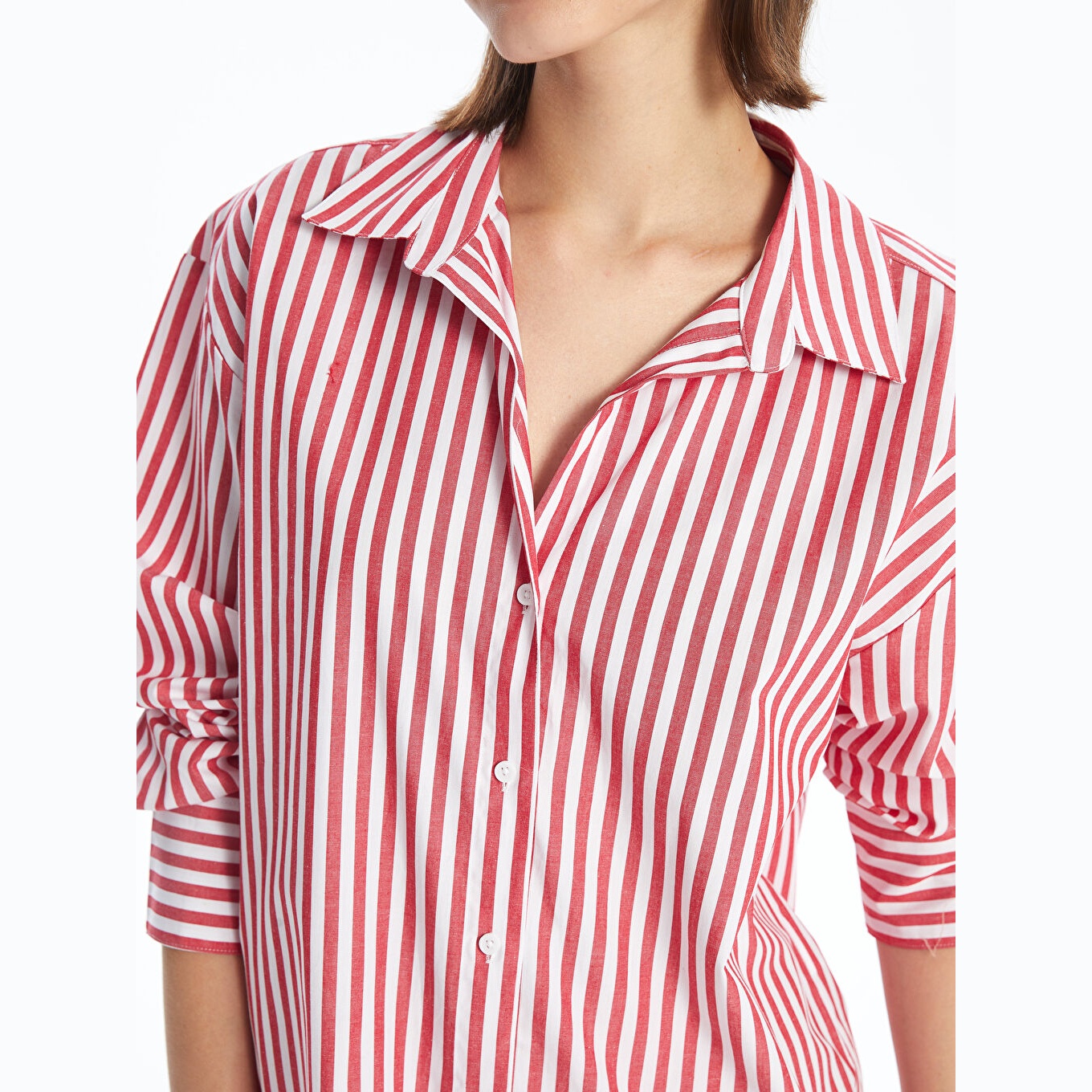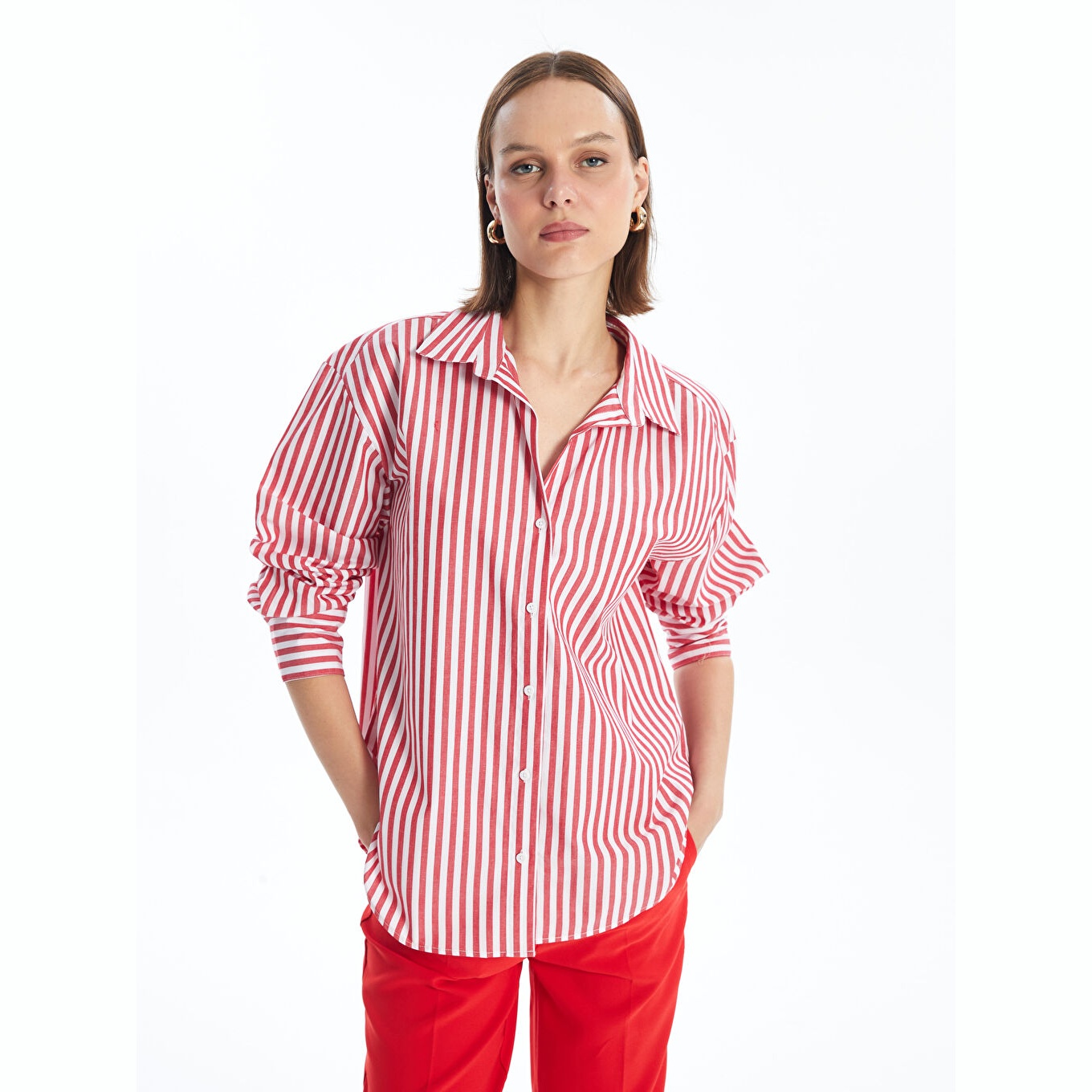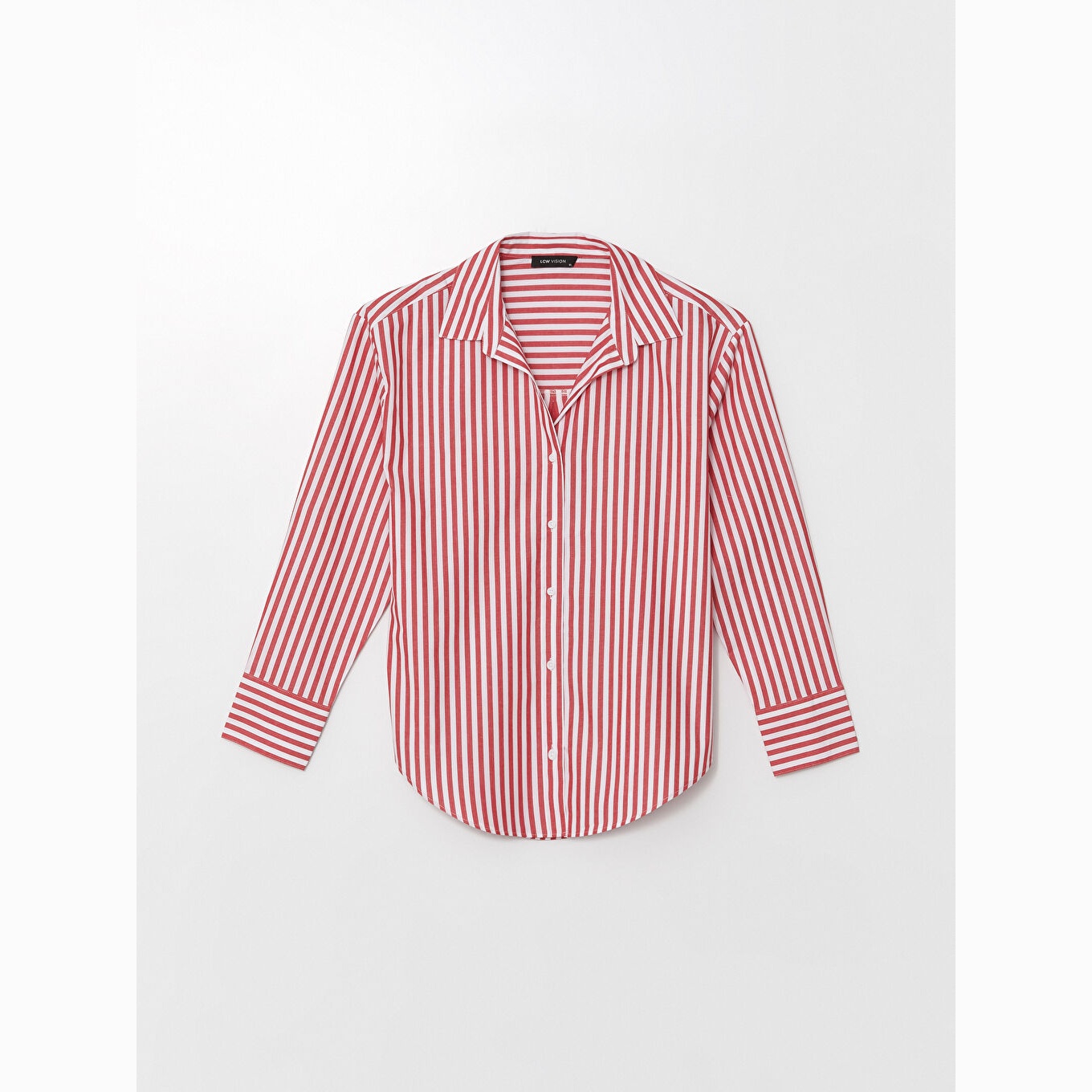 قميص نسائي واسع مخطط – أحمر (ياقة قميص، خامة بوبلين، قصة أوفرسايز، تصميم عملي بأزرار، بطول الورك)