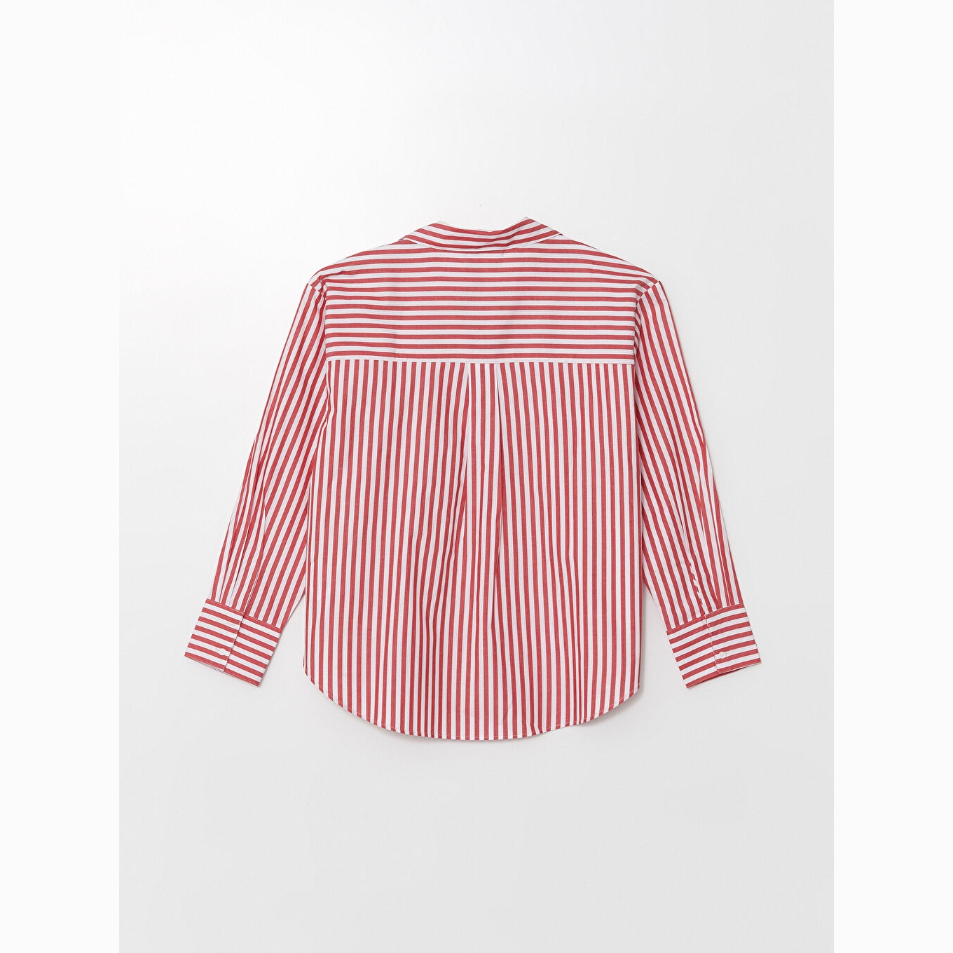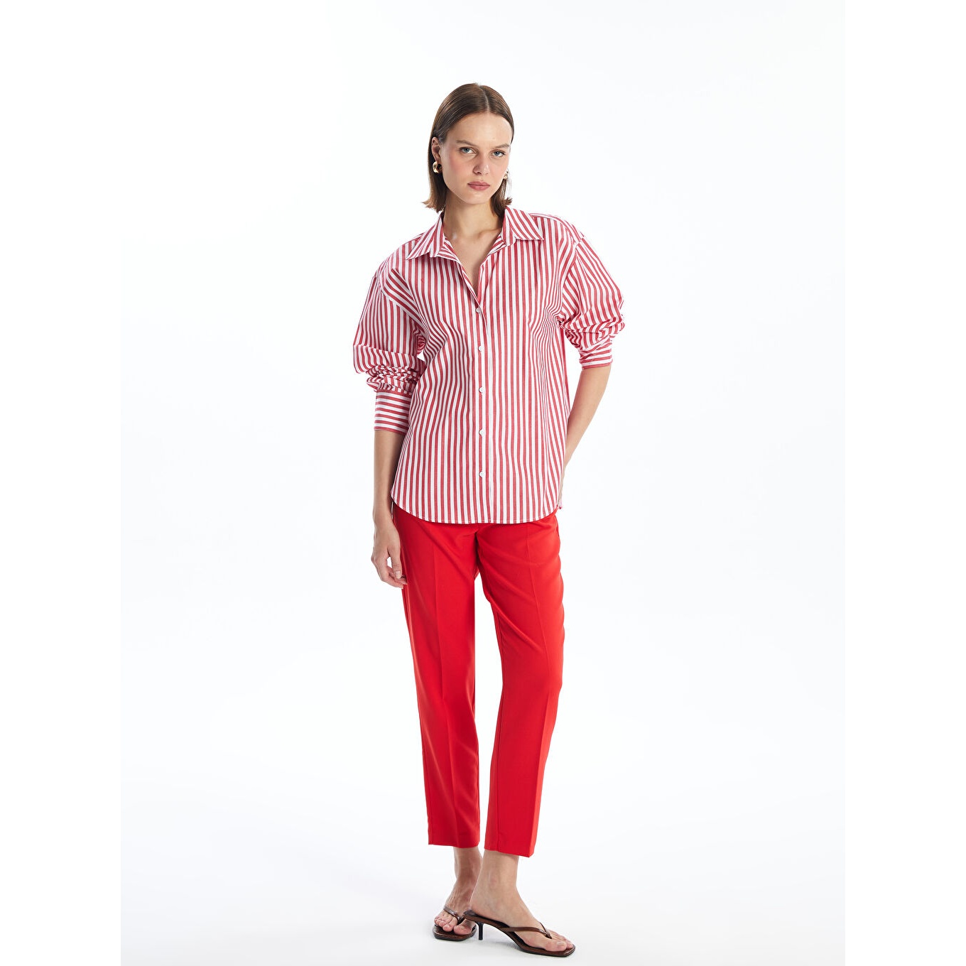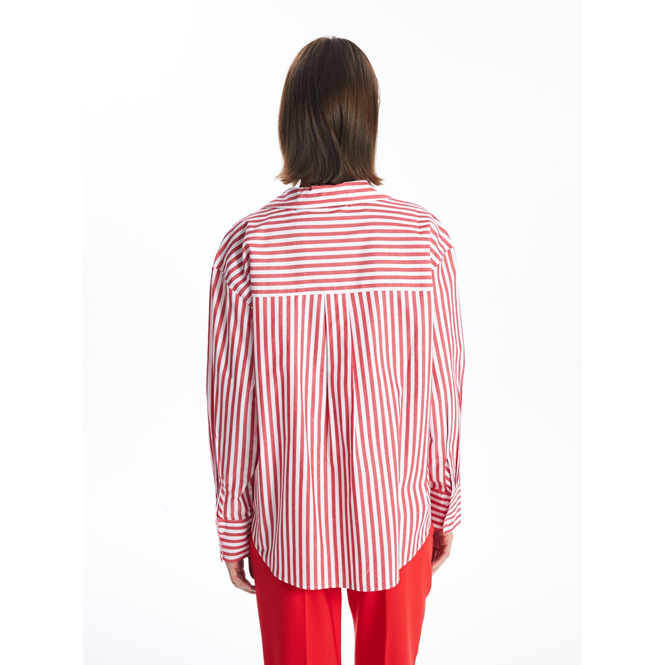 قميص نسائي واسع مخطط – أحمر (ياقة قميص، خامة بوبلين، قصة أوفرسايز، تصميم عملي بأزرار، بطول الورك)