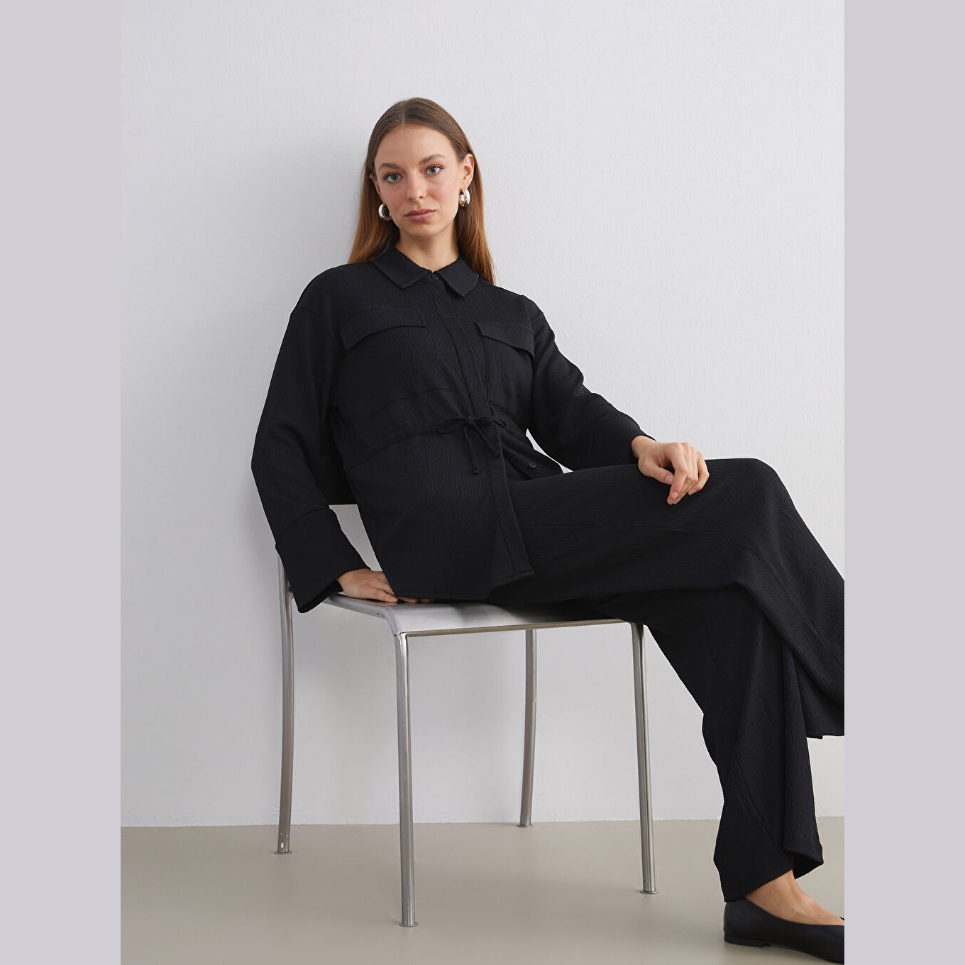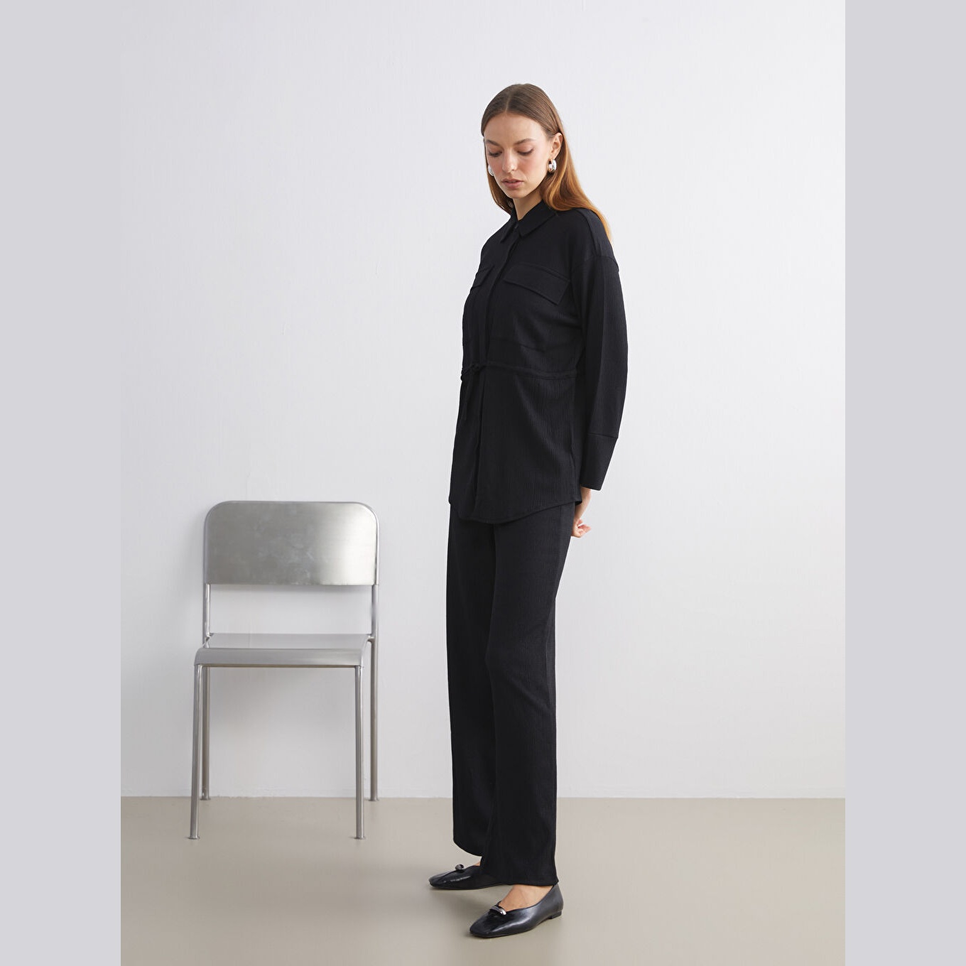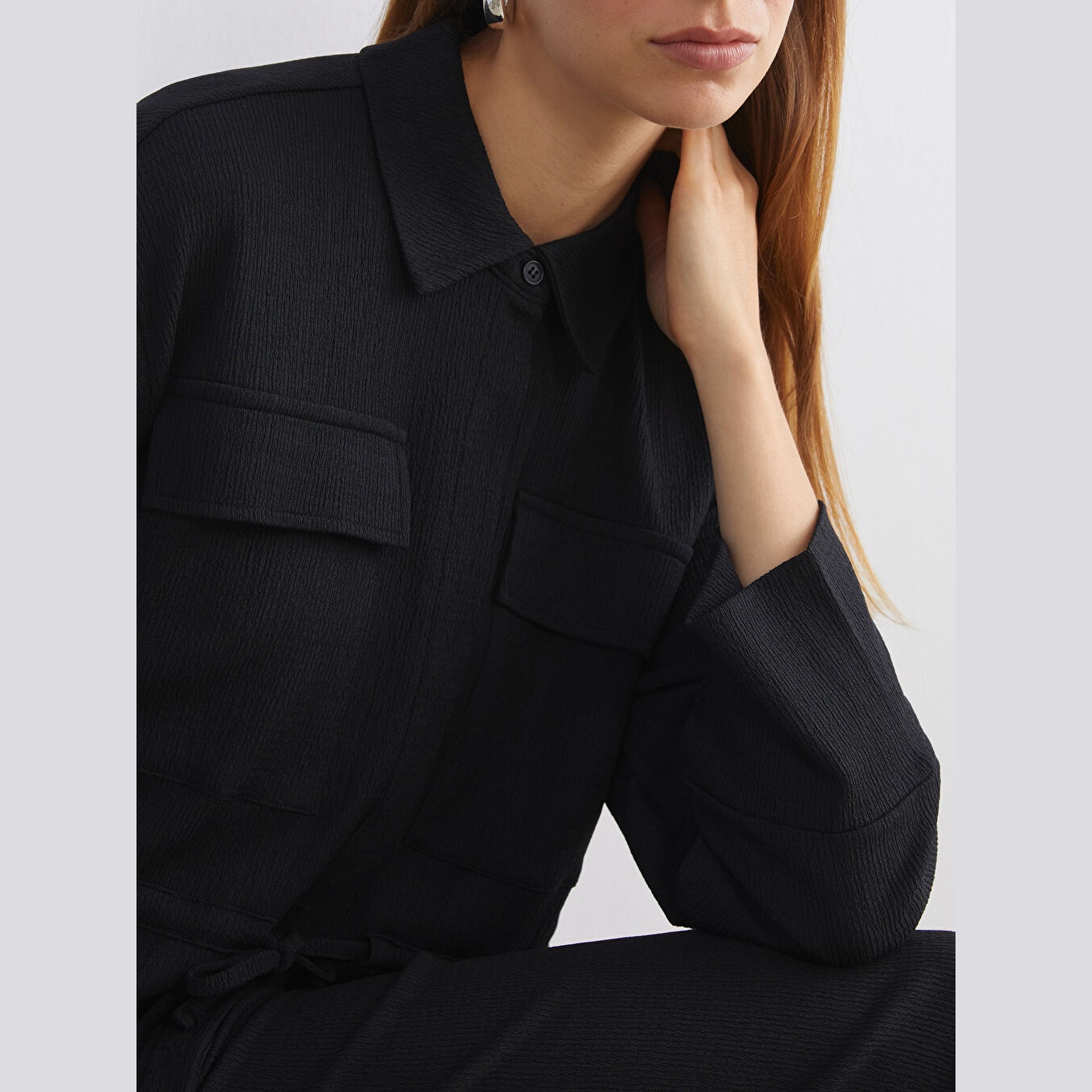 تونيك أنيق بلون أسود سادة من مجموعة LCW Modest، يتميز بياقة قميص تقليدية تضيف لمسة رسمية ناعمة، وقصة فضفاضة (Loose Fit) تمنحك مظهرًا مريحًا وعصريًا. مصنوع من خامة راشيل متوسطة السماكة بتركيبة %99 بوليستر، %1 إيلاستان، بأكمام طويلة، بطول يصل إلى الورك، ويُغلق بأزرار أمامية، مثالي للتنسيق مع البنطال القماشي أو الجينز في الإطلالات اليومية أو العملية.
