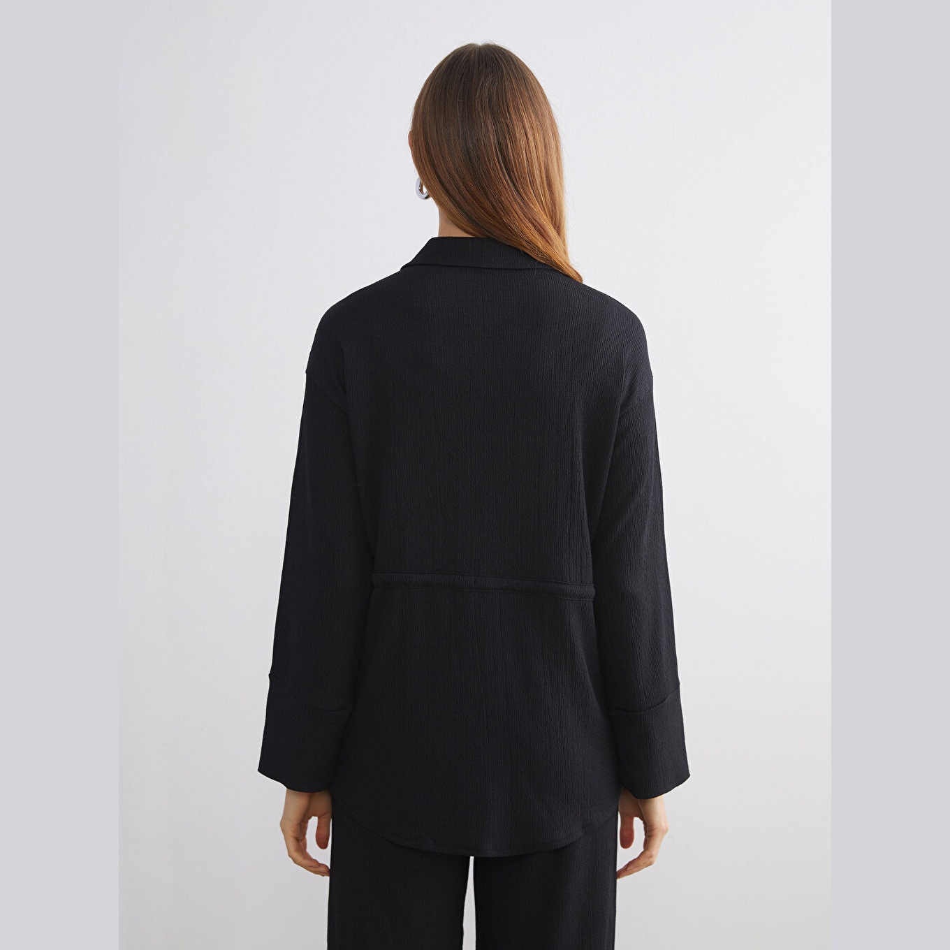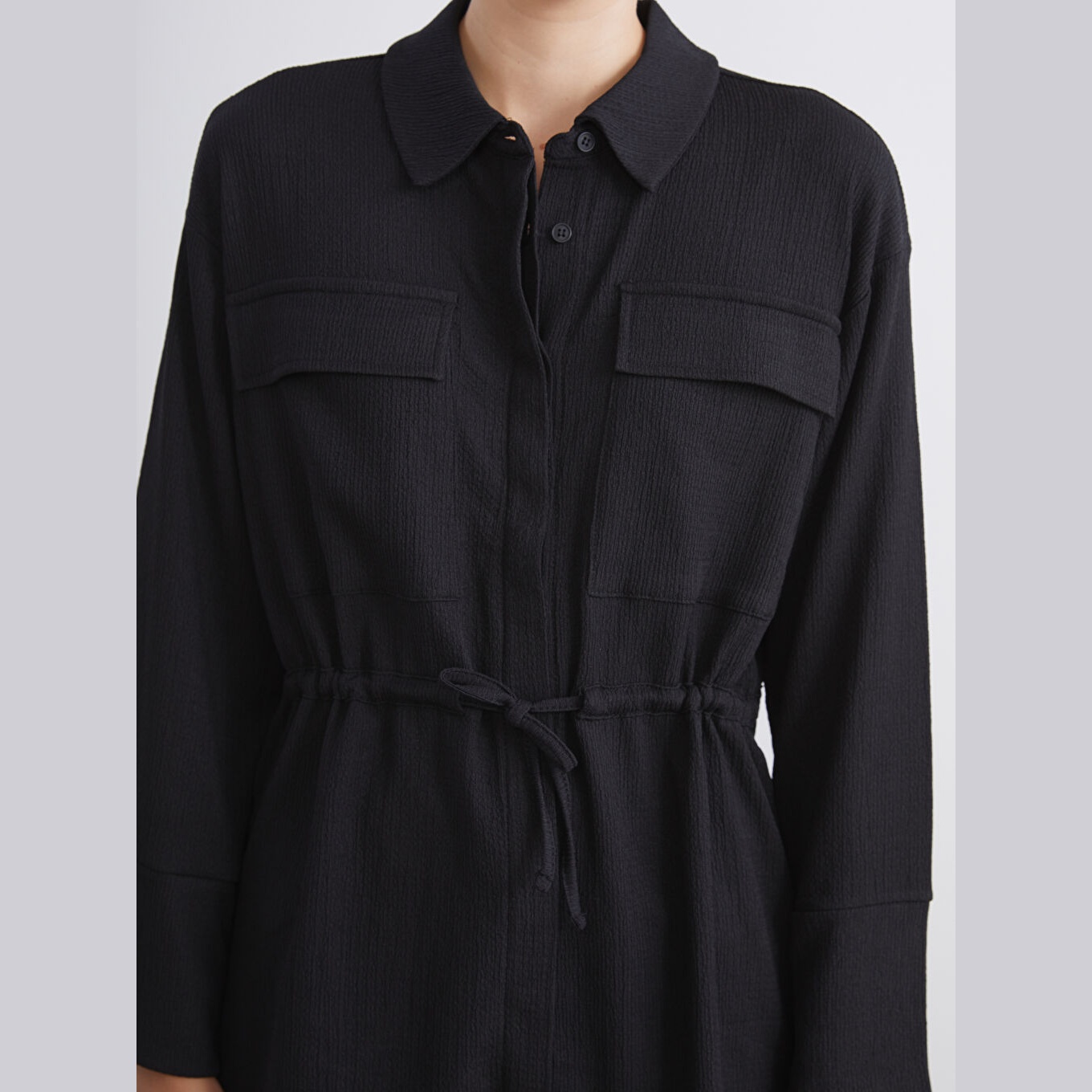 تونيك قميص نسائي واسع – أسود (ياقة قميص، خامة راشيل، قصة فضفاضة، تصميم عملي بأزرار، بطول الورك)