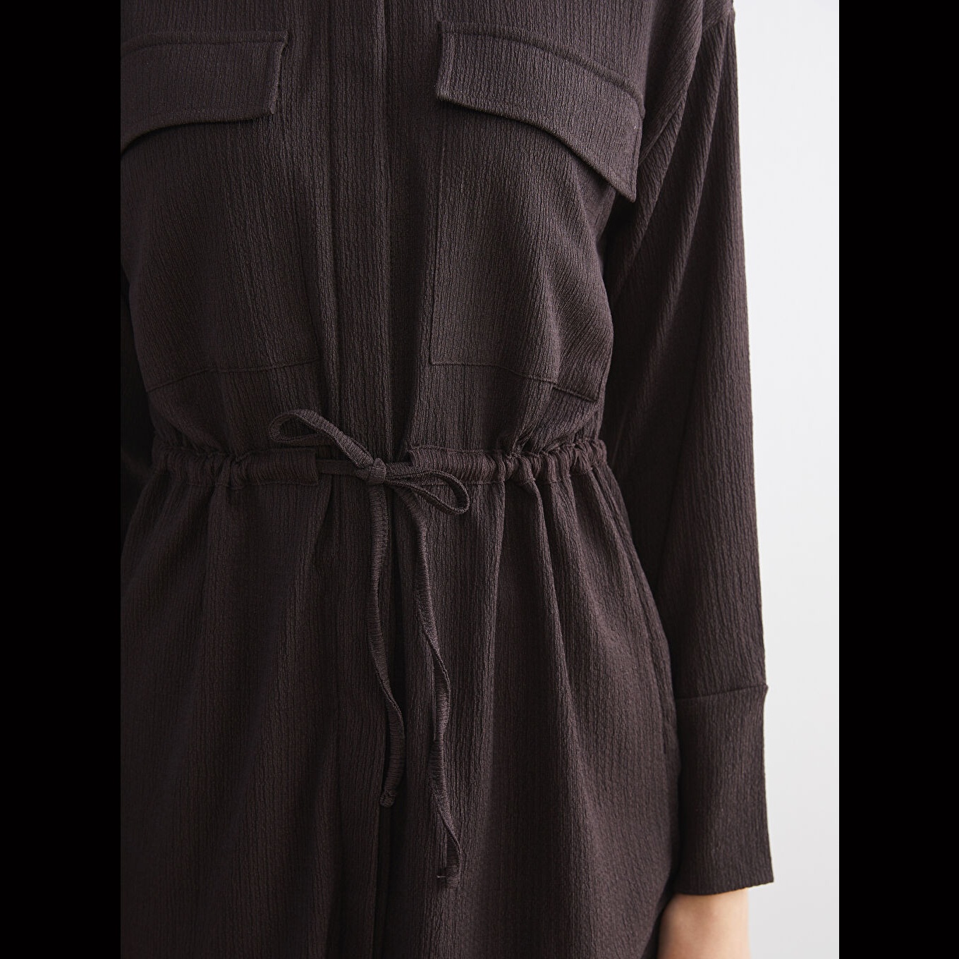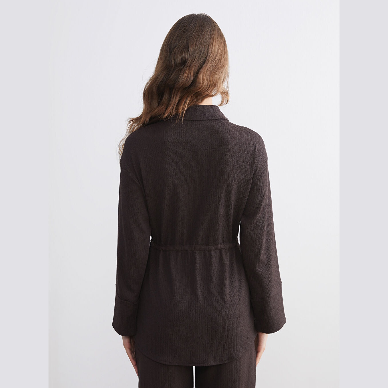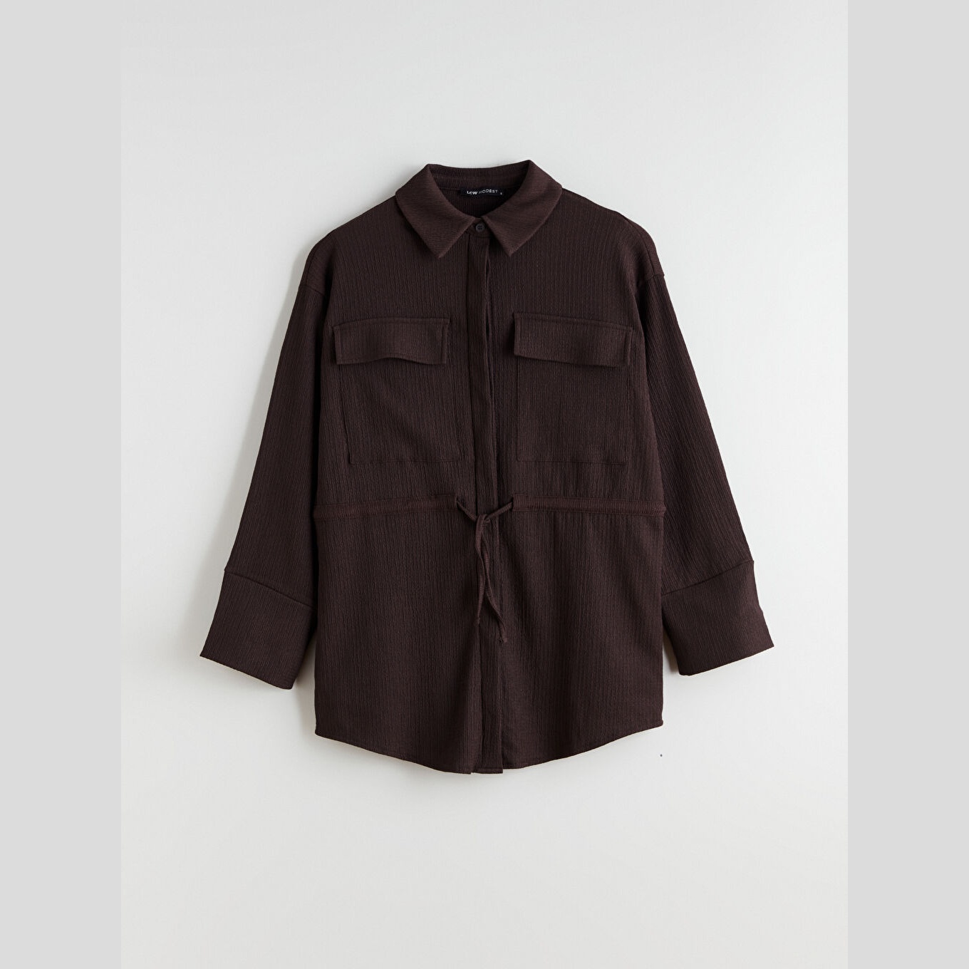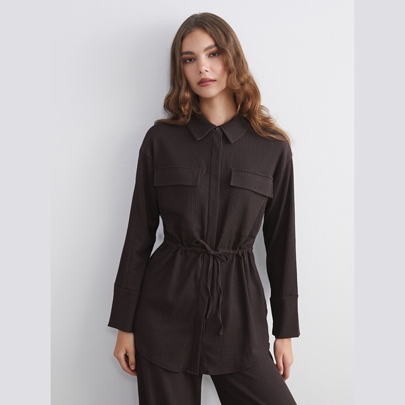 تونيك قميص نسائي واسع – بني (ياقة قميص، خامة راشيل، قصة فضفاضة، تصميم عملي بأزرار، بطول الورك)