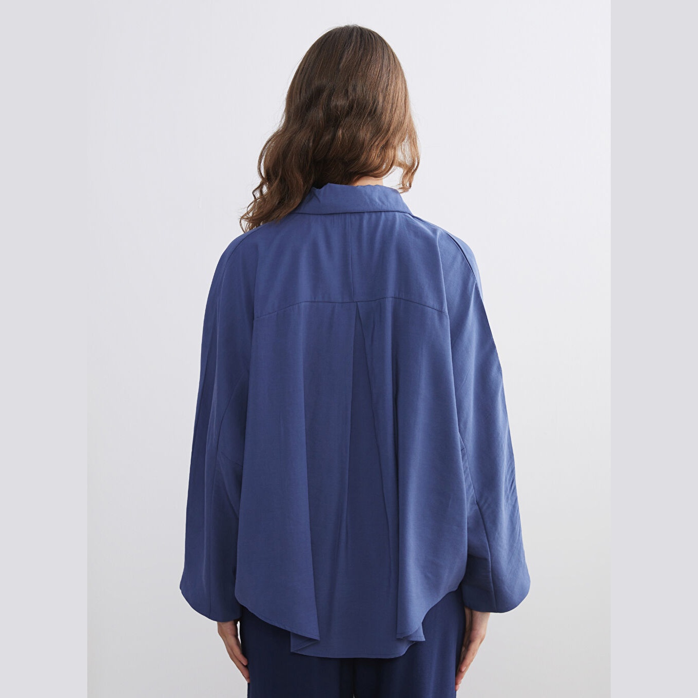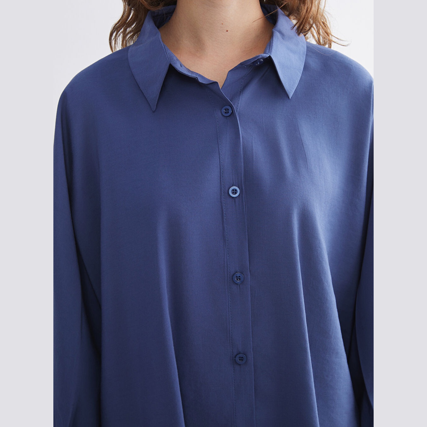 تونيك قميص نسائي واسع – أزرق (ياقة قميص، خامة فيسكوز، قصة أوفرسايز، تصميم عملي بأزرار، بطول الورك)