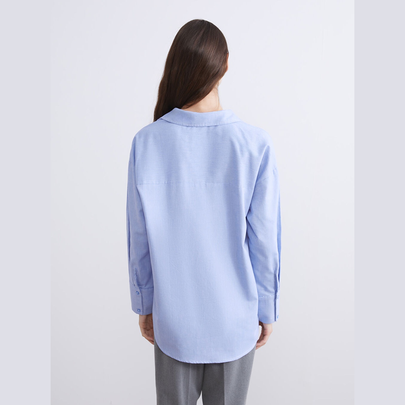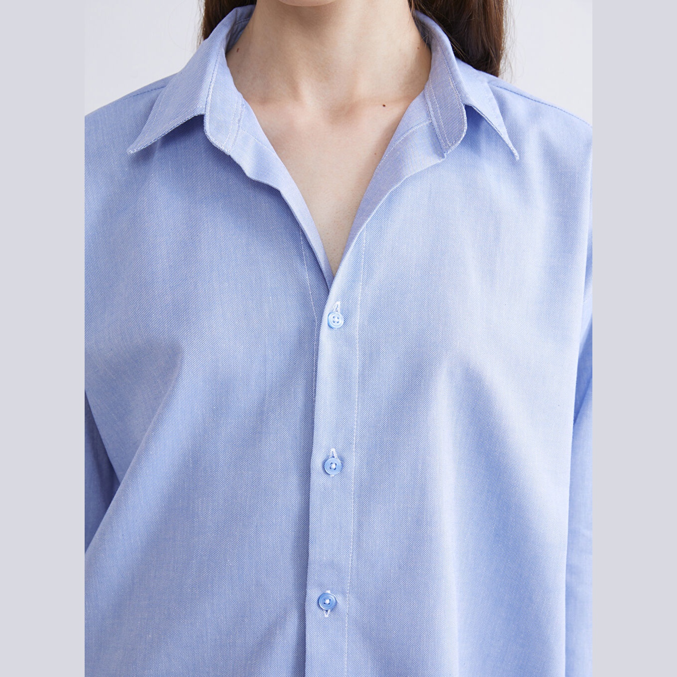 قميص نسائي واسع – أزرق (ياقة قميص، خامة أوكسفورد، قصة أوفرسايز، تصميم عملي بأزرار، بطول الورك)