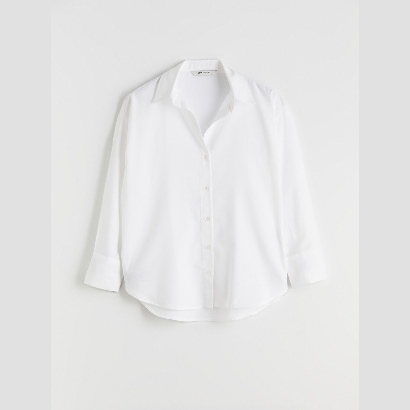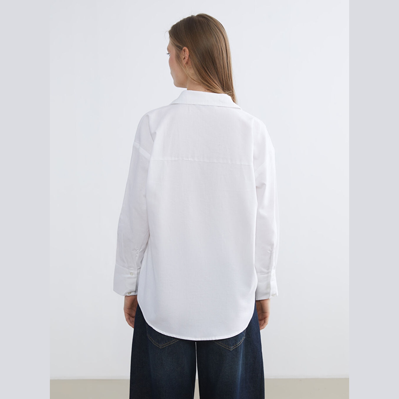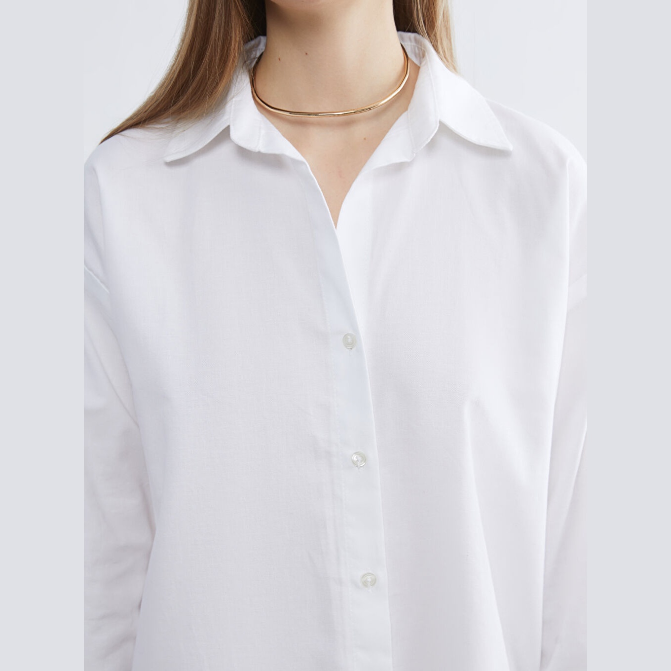 قميص نسائي واسع – إكرو (ياقة قميص، خامة أوكسفورد، قصة أوفرسايز، تصميم عملي بأزرار، بطول الورك)
