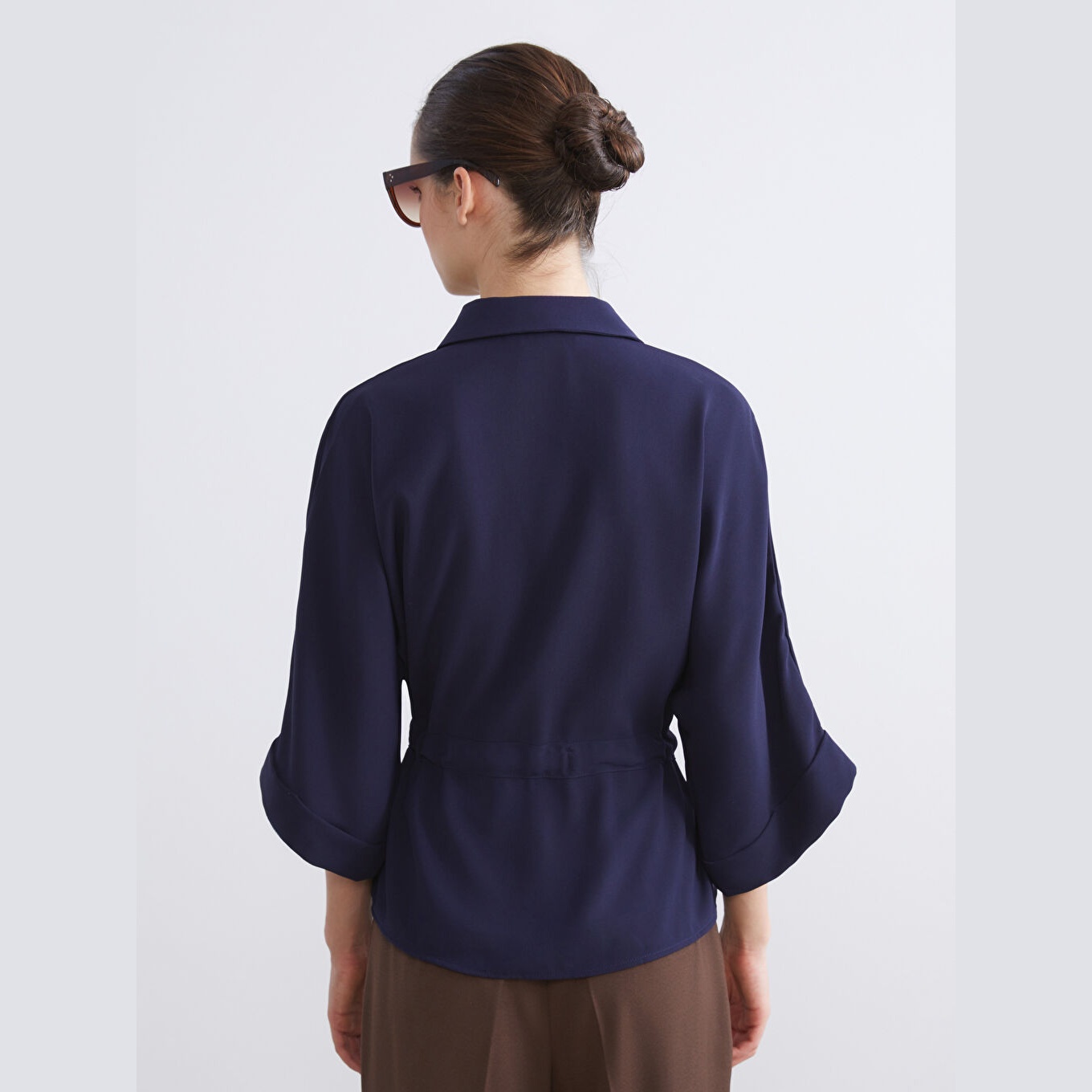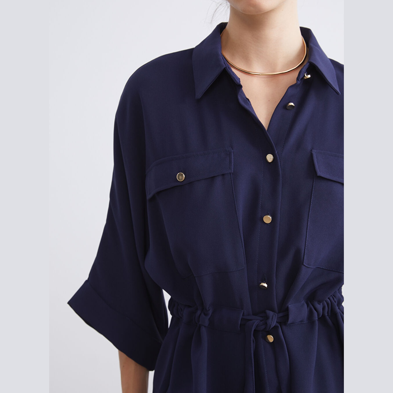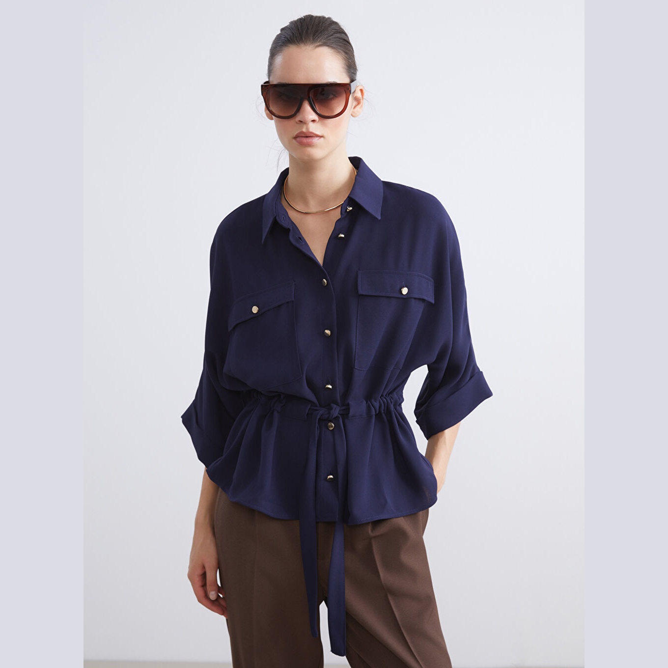 قميص نسائي واسع بربطة مجمّعة – كحلي (ياقة قميص، خامة أرمورية، قصة أوفرسايز، تصميم عملي بأزرار، بطول الورك)
