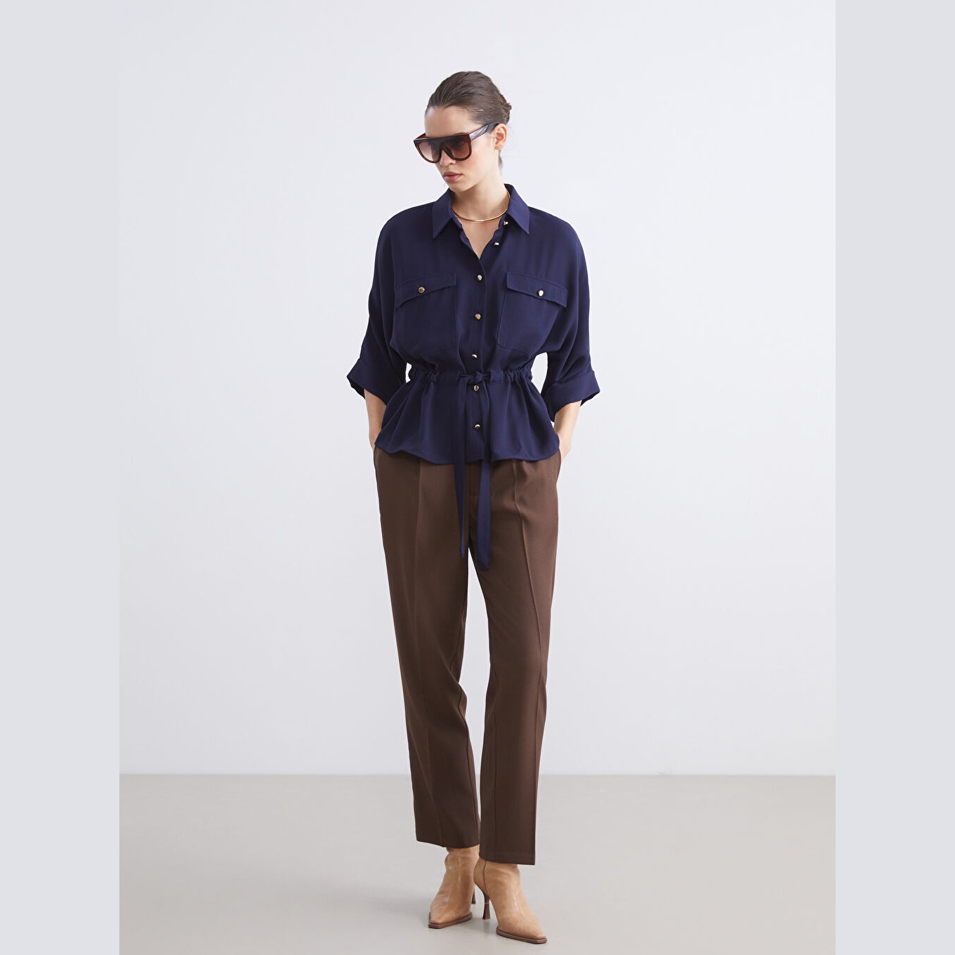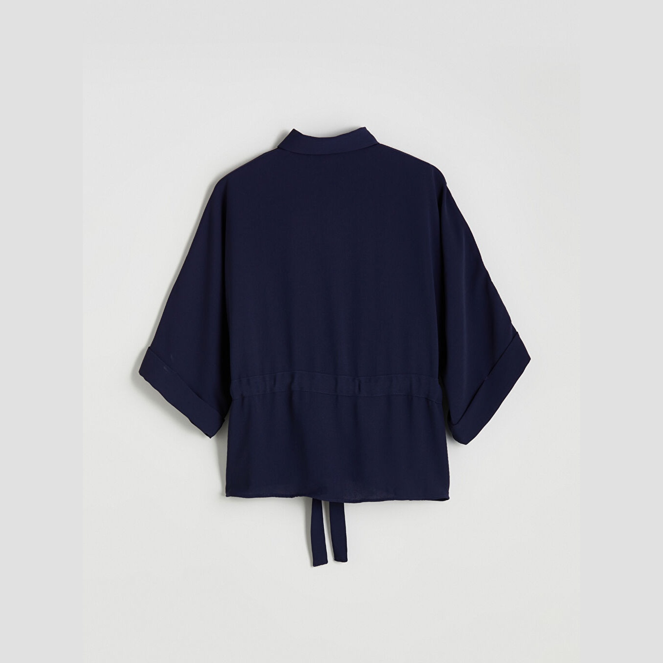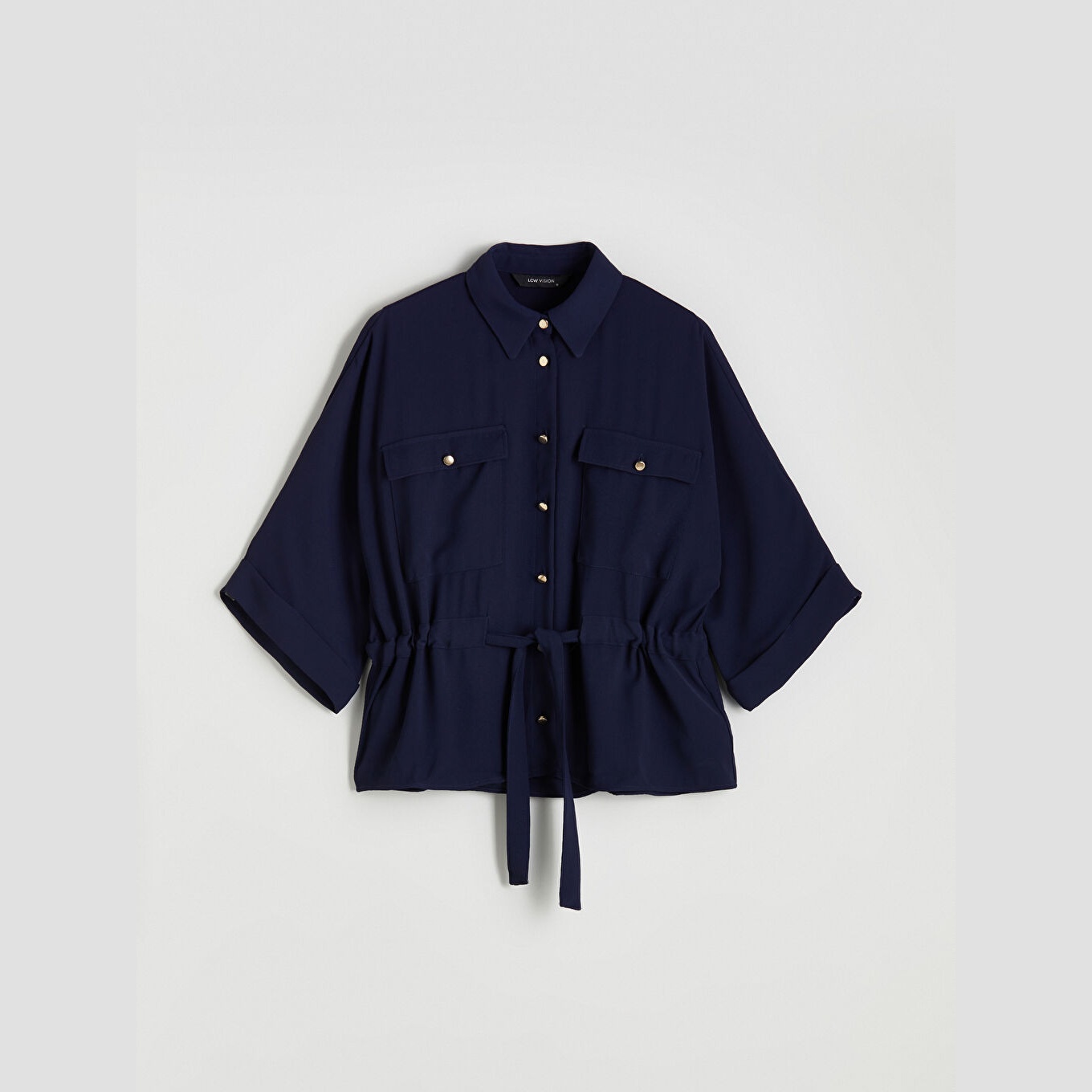 قميص نسائي واسع بربطة مجمّعة – كحلي (ياقة قميص، خامة أرمورية، قصة أوفرسايز، تصميم عملي بأزرار، بطول الورك)