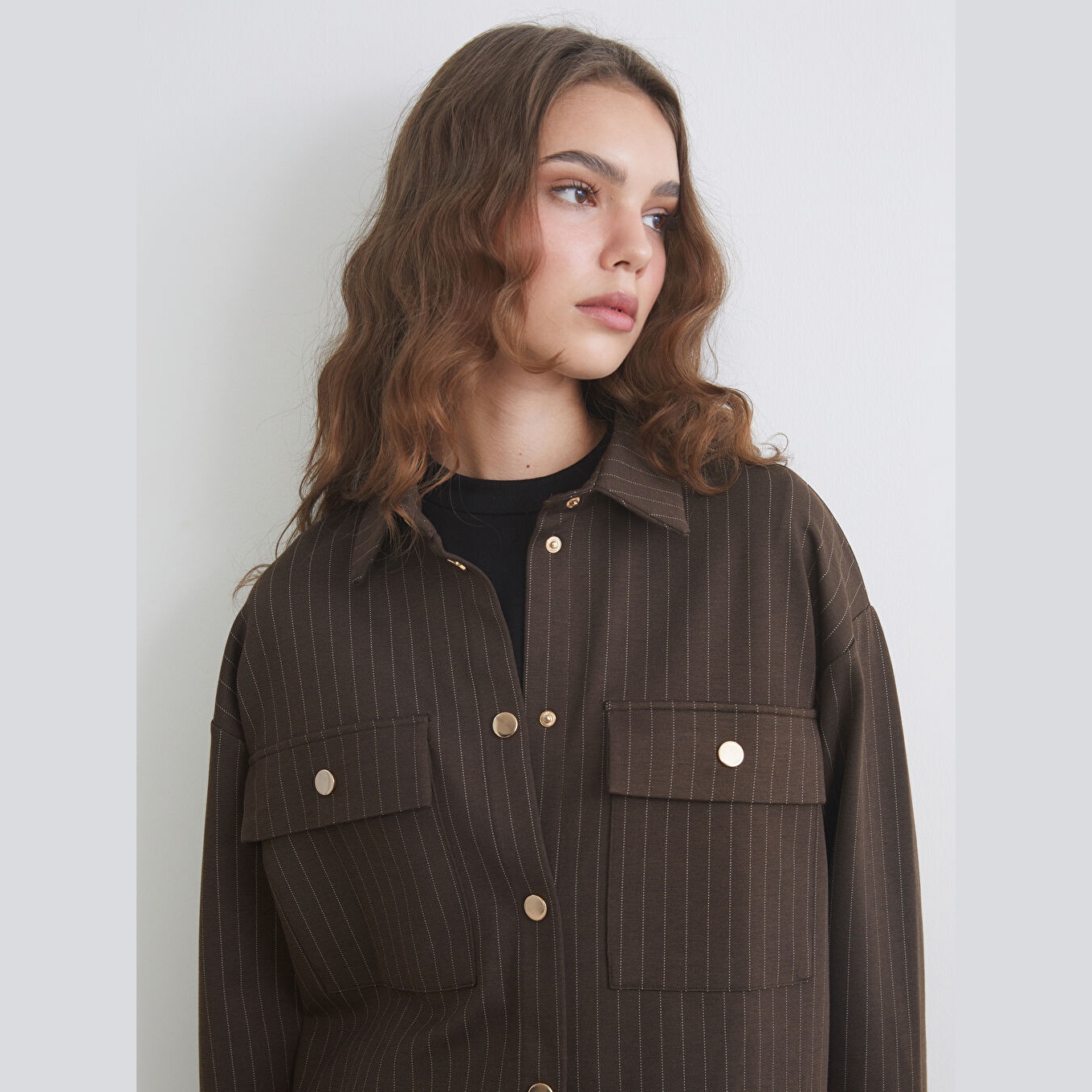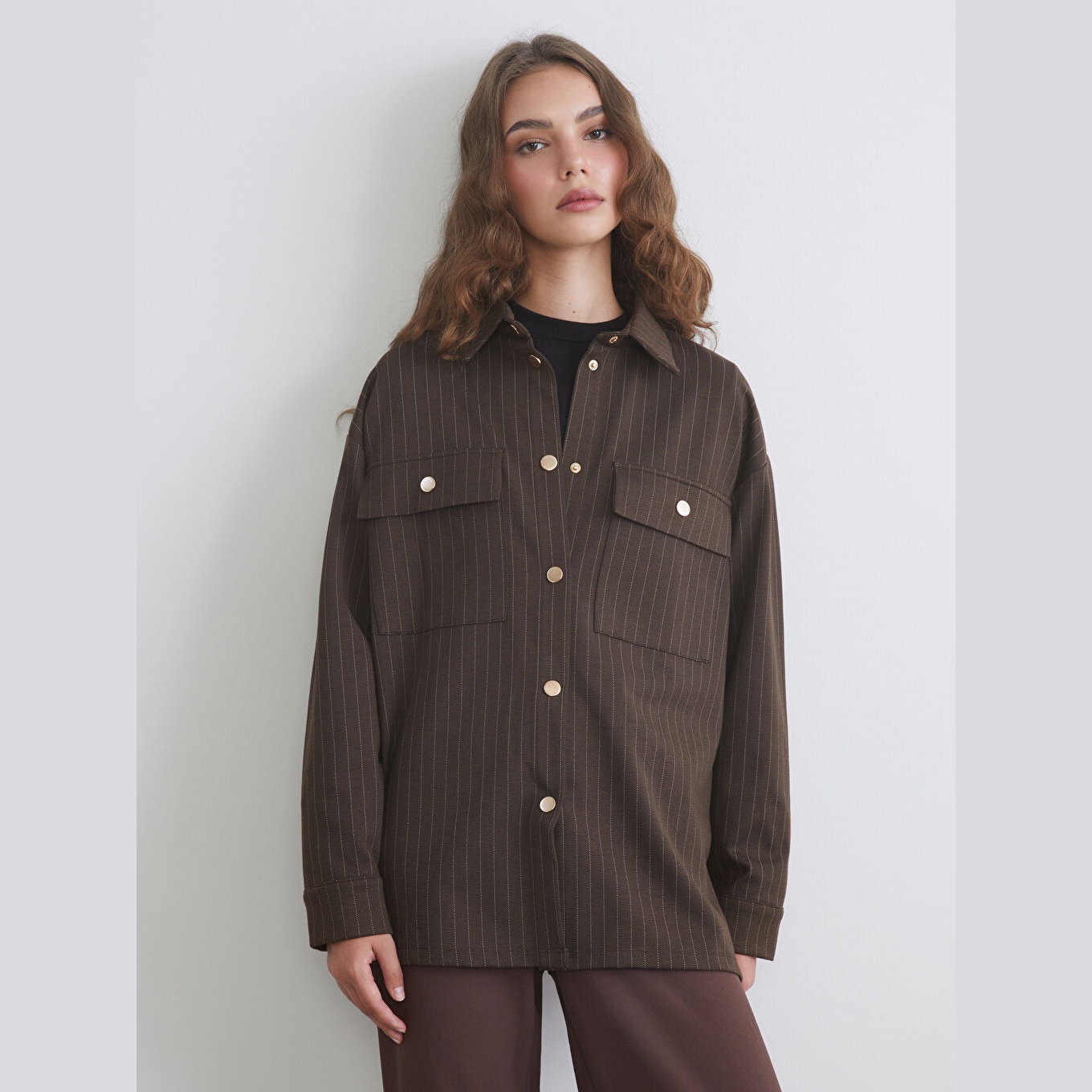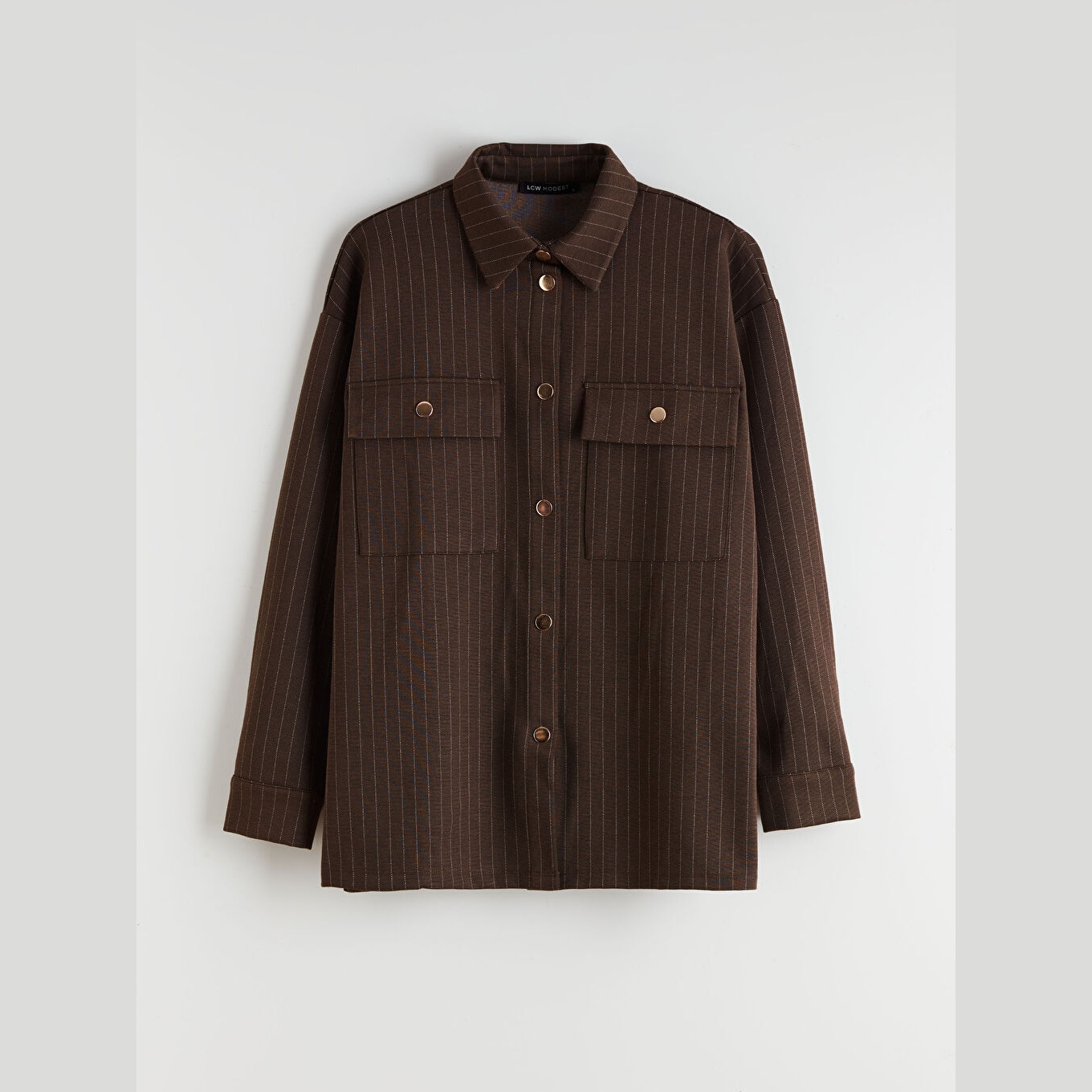 تونيك أنيق بلون بيج مخطط بخطوط ناعمة من مجموعة LCW Modest – الأزياء المحتشمة، يتميز بياقة قميص تقليدية تضيف لمسة رسمية ناعمة، وقصة أوفرسايز (Oversize Fit) تمنحك مظهرًا عصريًا ومريحًا. مصنوع من خامة إنترلوك مرنة ومريحة بتركيبة %71 بوليستر، %24 فيسكوز، %5 إيلاستان، بأكمام طويلة، بسماكة متوسطة، بطول يصل إلى الورك، ويُغلق بأزرار أمامية، مثالي للتنسيق مع البنطال القماشي أو الجينز في الإطلالات اليومية أو العملية.