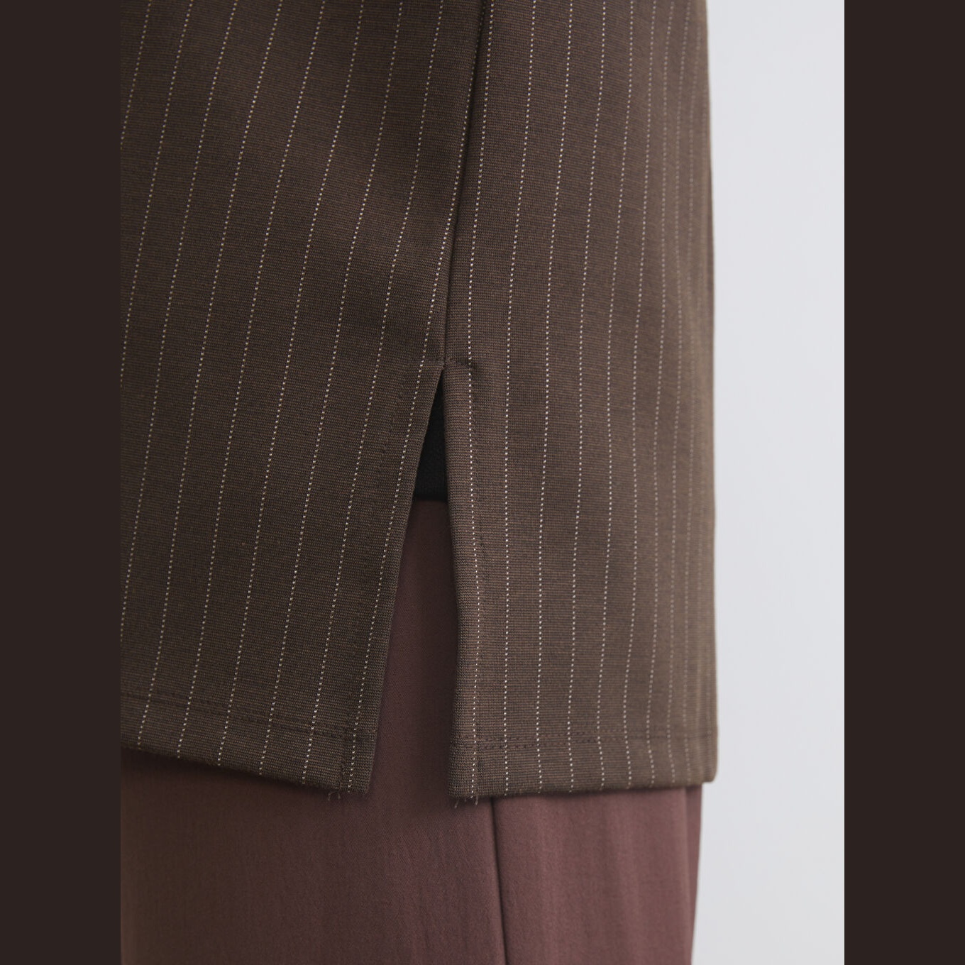 تونيك قميص نسائي واسع مخطط – بيج (ياقة قميص، خامة إنترلوك، قصة أوفرسايز، تصميم عملي بأزرار، بطول الورك)