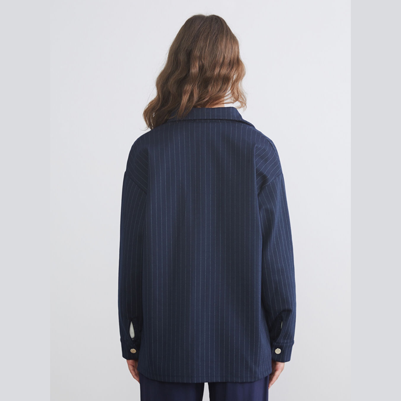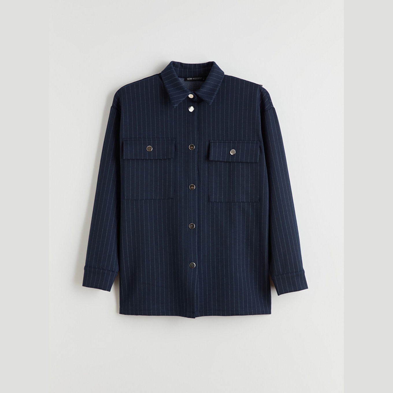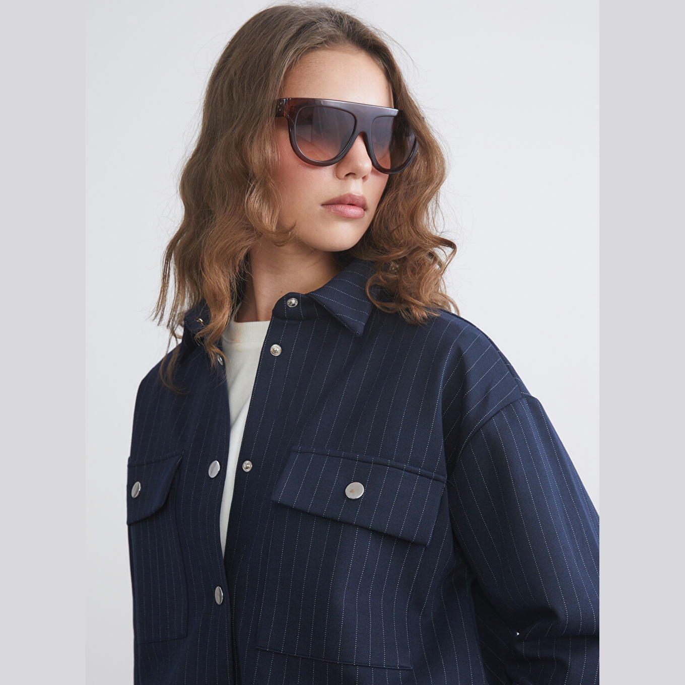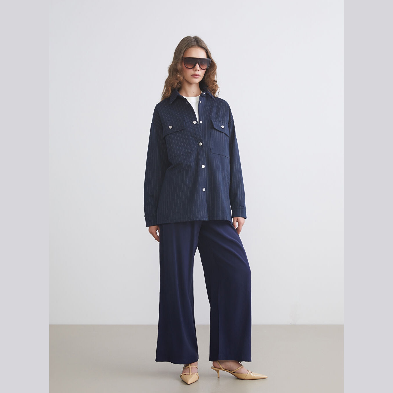 تونيك أنيق بلون كحلي مخطط بخطوط ناعمة من مجموعة LCW Modest – الأزياء المحتشمة، يتميز بياقة قميص تقليدية تضيف لمسة رسمية ناعمة، وقصة أوفرسايز (Oversize Fit) تمنحك مظهرًا عصريًا ومريحًا. مصنوع من خامة إنترلوك مرنة ومريحة بتركيبة %70 بوليستر، %27 فيسكوز، %3 إيلاستان، بأكمام طويلة، بسماكة متوسطة، بطول يصل إلى الورك، ويُغلق بأزرار أمامية، مثالي للتنسيق مع البنطال القماشي أو الجينز في الإطلالات اليومية أو العملية.