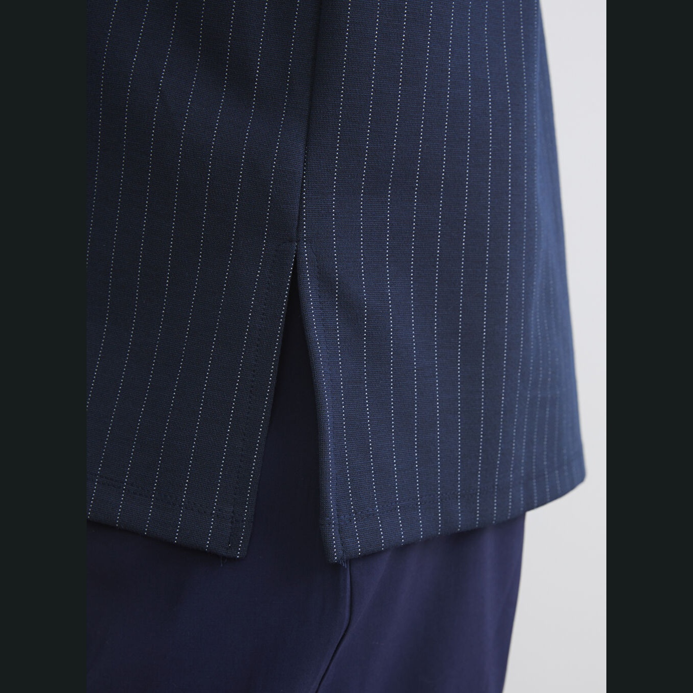 تونيك قميص نسائي واسع مخطط – كحلي (ياقة قميص، خامة إنترلوك، قصة أوفرسايز، تصميم عملي بأزرار، بطول الورك)
