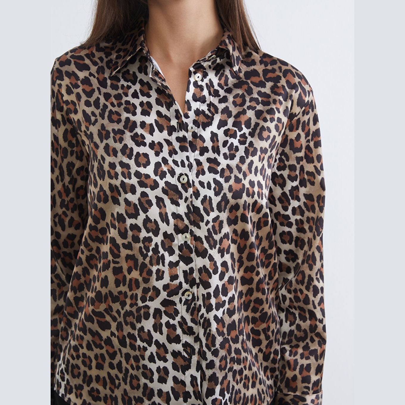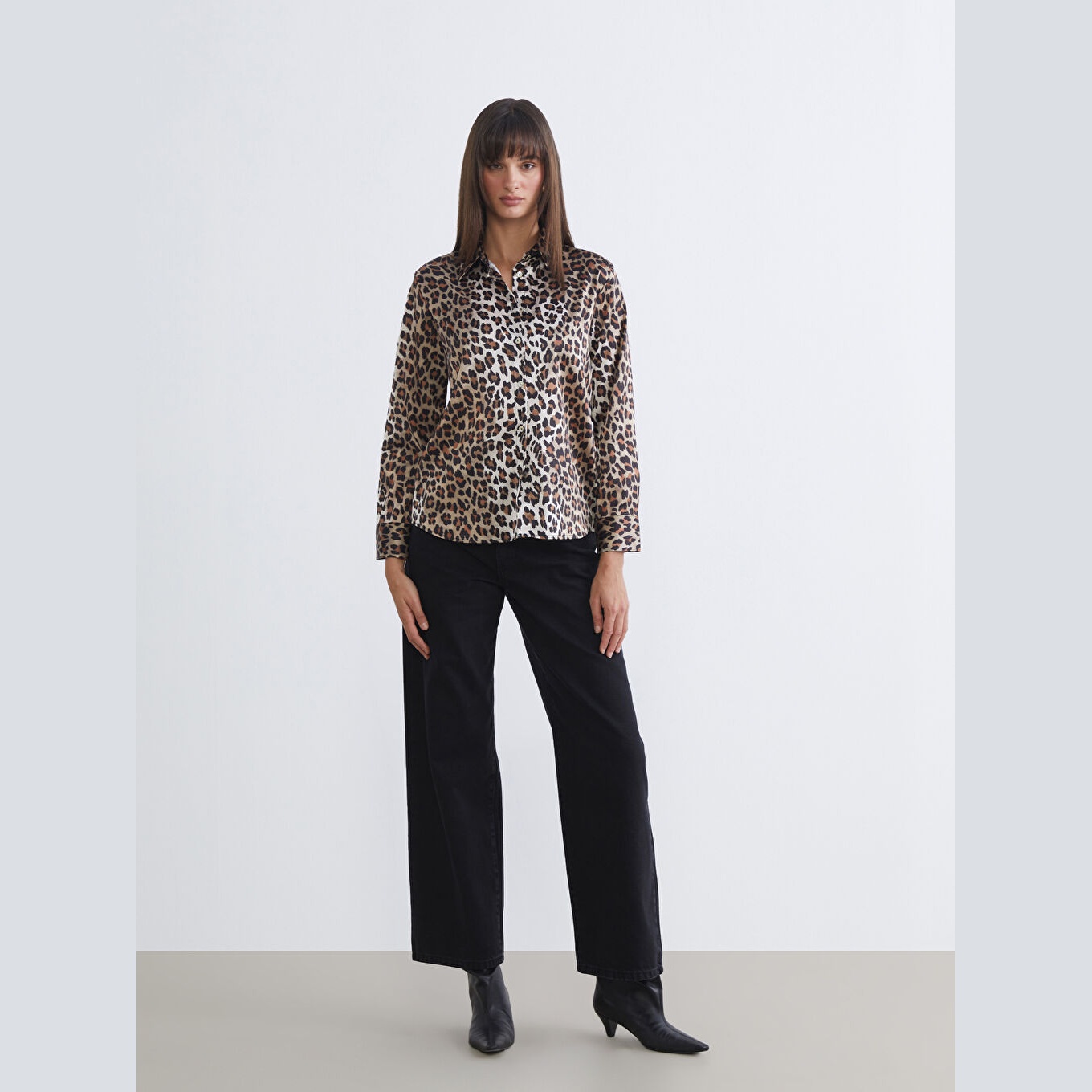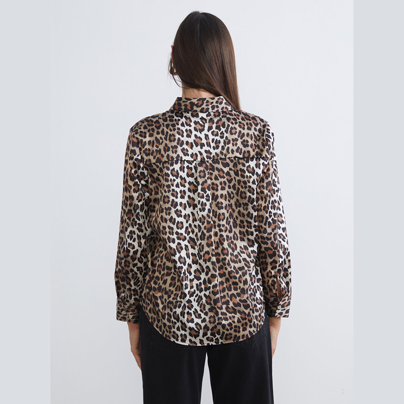 قميص أنيق بلون أسود مزخرف بنقشة جلد النمر من مجموعة LCW Vision – الأزياء العملية، يتميز بياقة قميص تقليدية تضيف لمسة رسمية أنيقة، وقصة فضفاضة (Loose Fit) تمنحك مظهرًا مريحًا وانسيابيًا. مصنوع من خامة ساتان ناعمة ولامعة بتركيبة %100 بوليستر، بأكمام طويلة، بسماكة خفيفة، بطول يصل إلى الورك، ويُغلق بأزرار أمامية، مثالي للتنسيق مع البنطال القماشي أو الجينز في الإطلالات اليومية أو العملية.