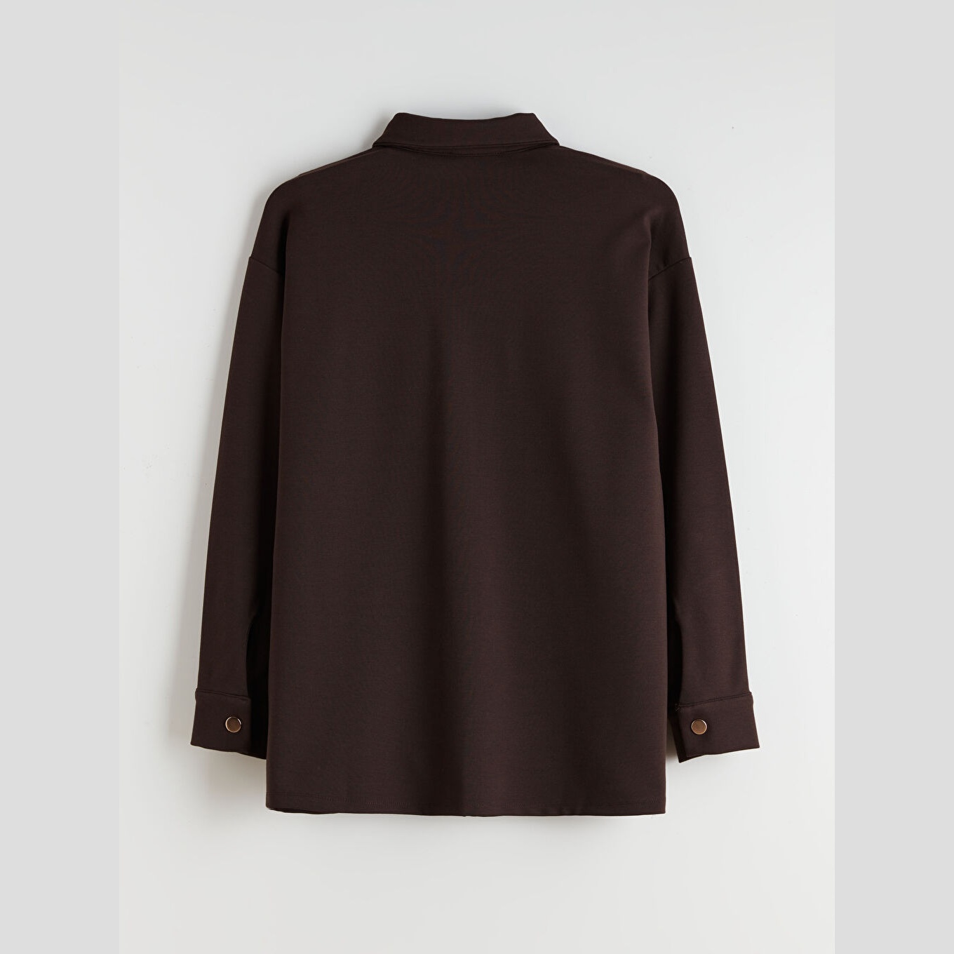 تونيك قميص نسائي واسع – بيج سادة (ياقة قميص، خامة إنترلوك، قصة أوفرسايز، تصميم عملي بأزرار، بطول الورك)