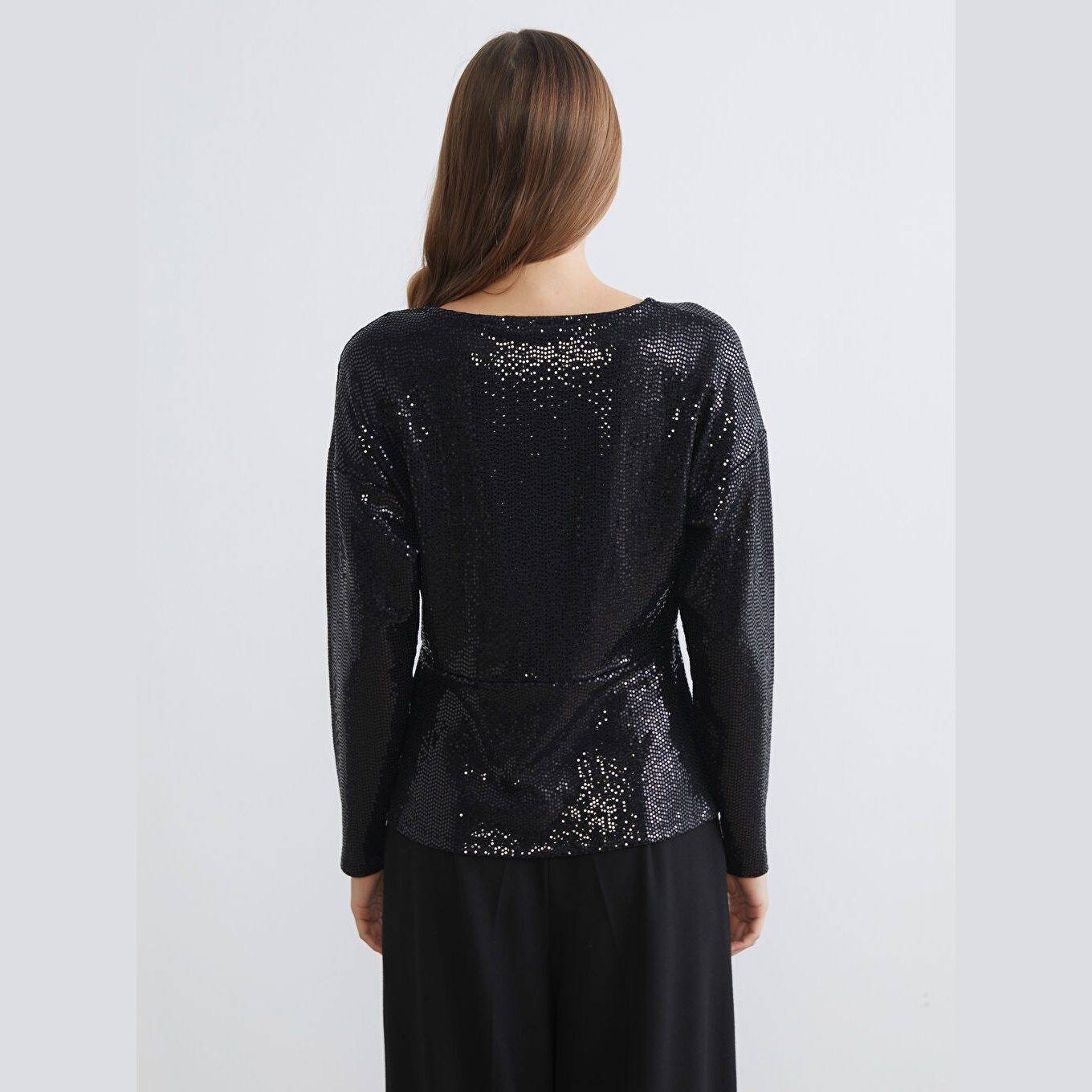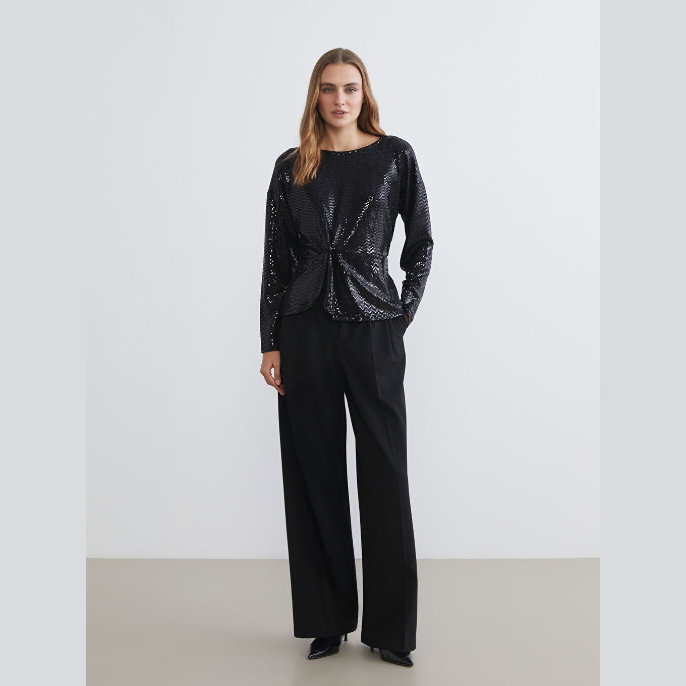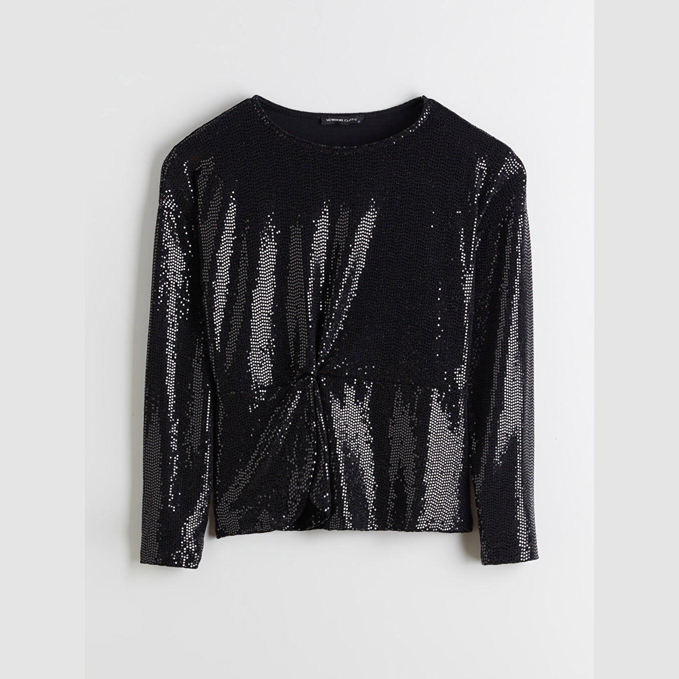 بلوز أنيق بلون أسود سادة مزين بترتر لامع وثنيات أمامية من مجموعة LCWAIKIKI Basic – الأزياء اليومية الأنيقة، يتميز بياقة دائرية ناعمة تضيف لمسة أنثوية بسيطة، وقصة قياسية (Regular Fit) تمنحك مظهرًا متوازنًا ومناسبًا لمختلف الإطلالات. مصنوع من خامة إنترلوك مرنة وخفيفة بتركيبة %93 بولياميد، %5 إيلاستان، %2 خيط معدني، بأكمام طويلة، بسماكة خفيفة، بطول يصل إلى الورك، مثالي للتنسيق مع البنطال القماشي أو التنورة في الإطلالات المسائية أو العملية.