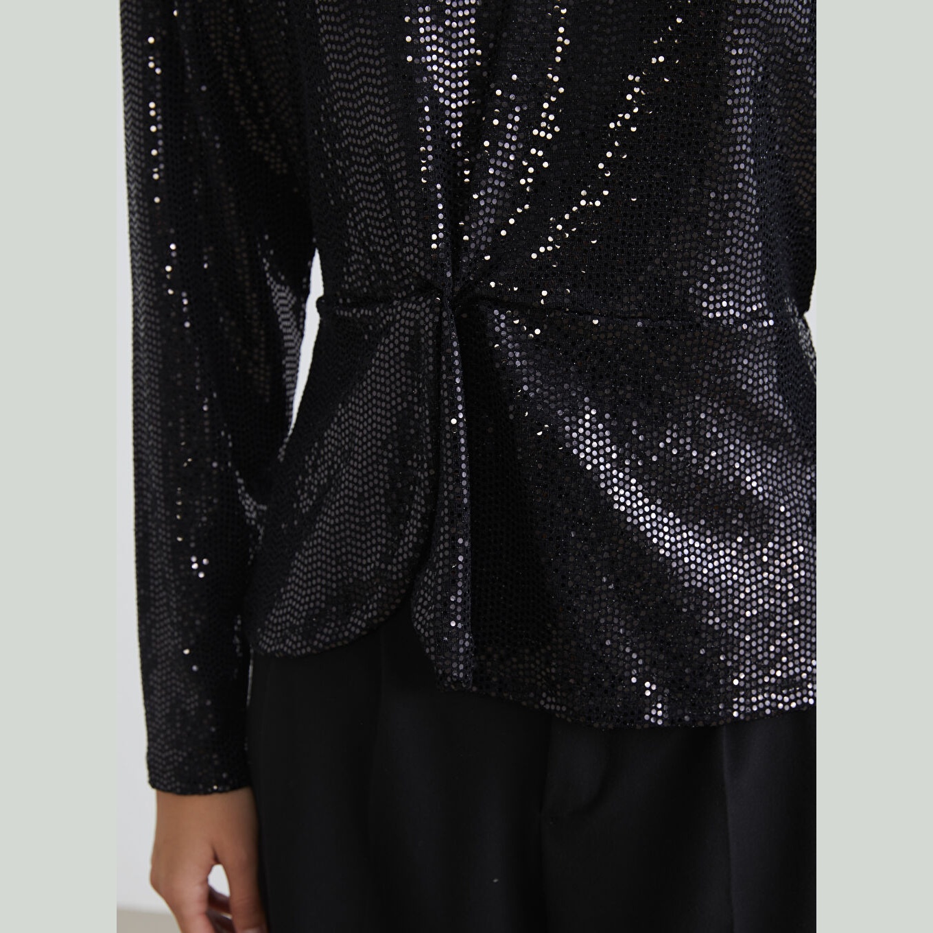 بلوز نسائي بياقة دائرية – أسود مزين بالترتر وبثنيات أمامية (ياقة دائرية، خامة إنترلوك، قصة قياسية، تصميم أنيق بلمعة خفيفة، بطول الورك)