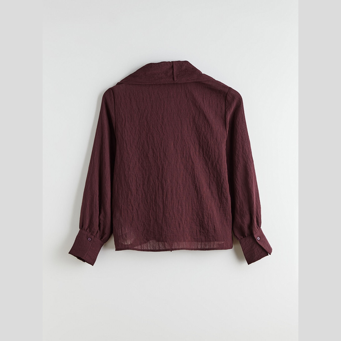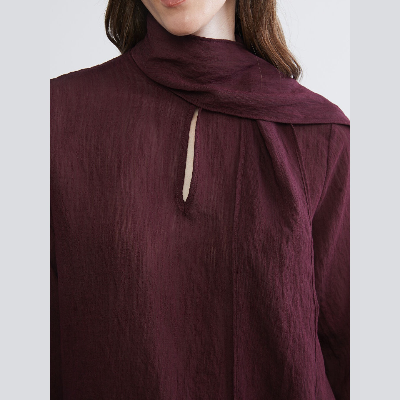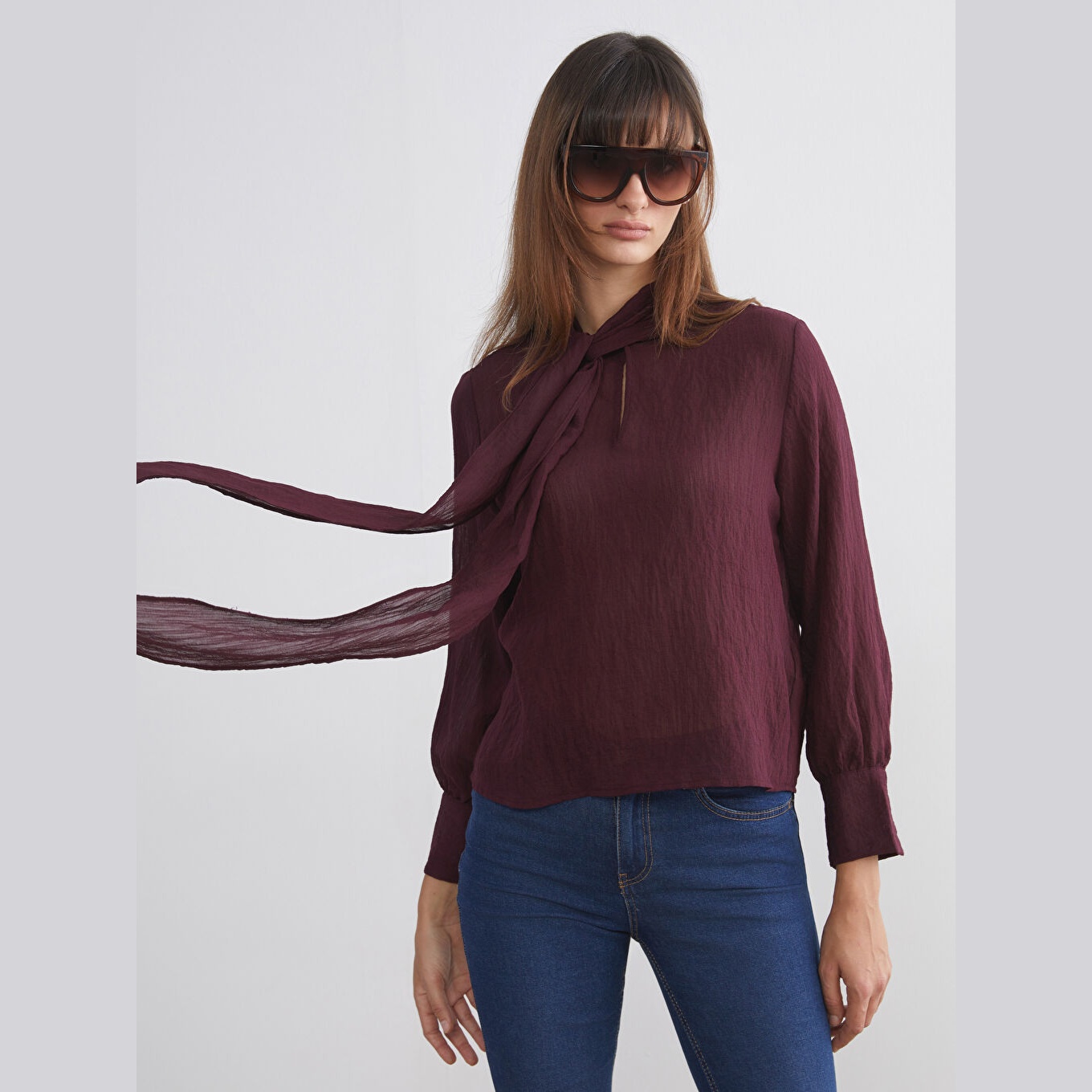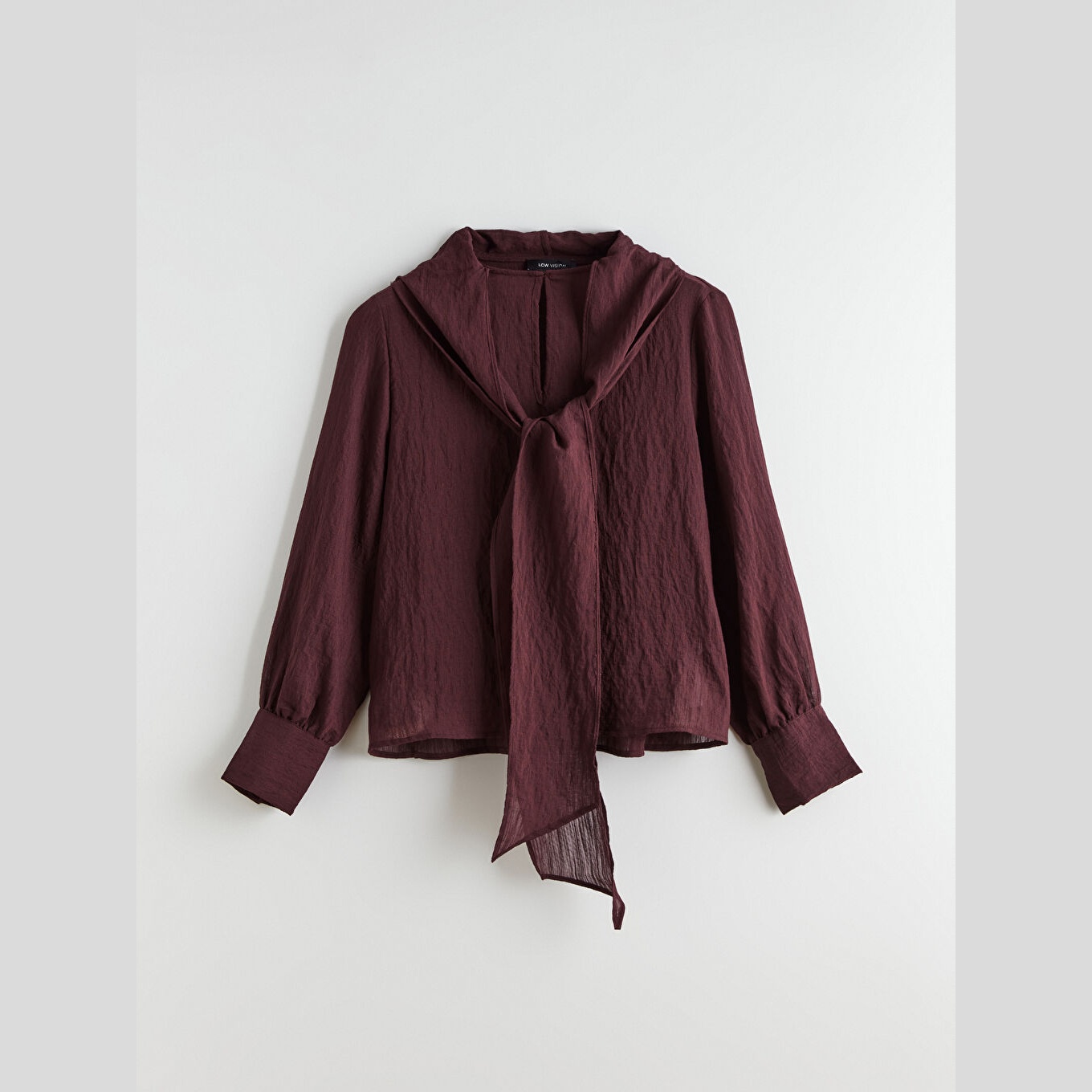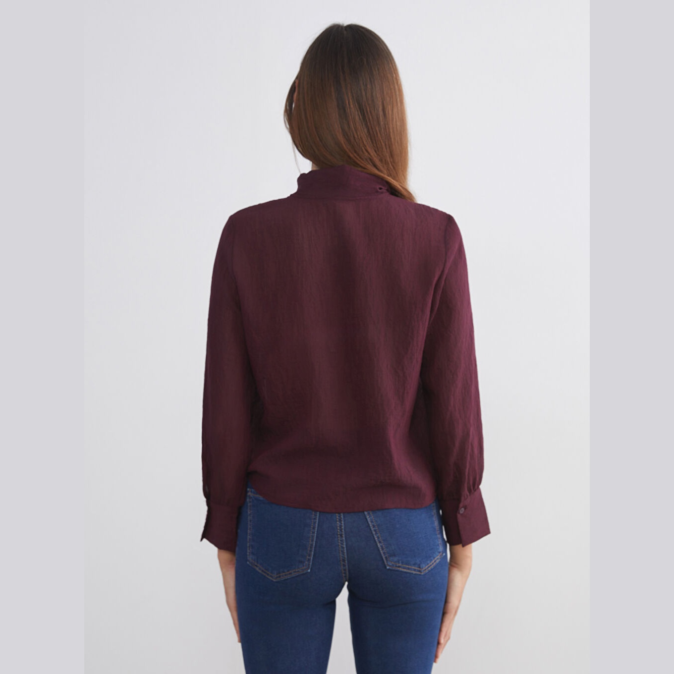 بلوز نسائي شيفون بياقة مربوطة – عنابي سادة بملمس مزخرف (ياقة قابلة للربط، خامة شيفون، قصة قياسية، تصميم عملي بملمس ناعم، بطول الورك)
